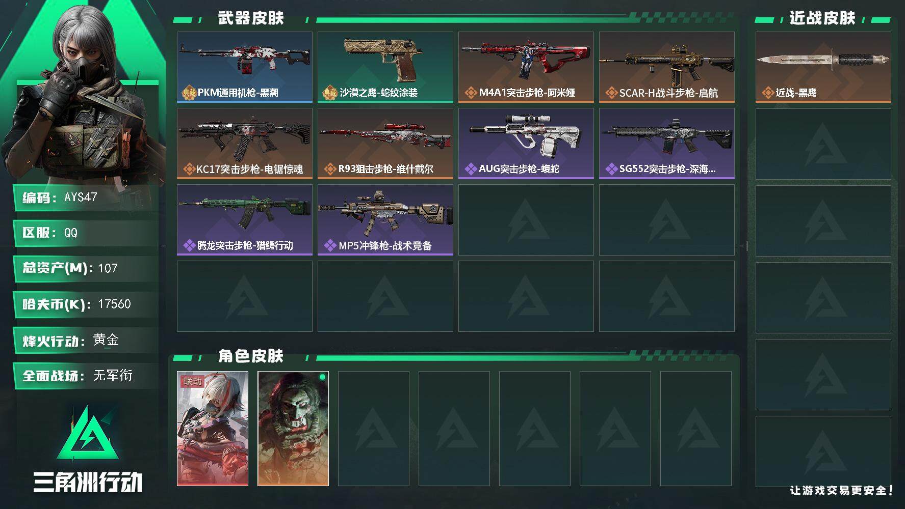 [13946099]可直接换绑 总资产107m 【店主推荐捡漏号!可直接换绑】 17560k哈伏币-107m流动资产-56烽火等级-黄金-1战场等级-无军衔 【干员外观】:骇爪-维什戴尔,红狼-电锯惊魂 【近战皮肤】:近战-黑鹰 【典藏外观】:PKM通用机枪-黑潮,沙漠之鹰-蛇纹涂装 【传说级普通外观】:M4A1突击步枪-阿米娅,SCAR-H战斗步枪-启航,KC17突击步枪-电锯惊魂,R93狙击步枪-维什戴尔 【史诗级普通外观】:AUG突击步枪-蝮蛇,SG552突击步枪-深海恐惧,腾龙突击步枪-猎鳄行动,MP5冲锋枪-战术竞备 【稀有级普通外观】:SCAR-H战斗步枪-荣耀列队,Vector冲锋枪-先锋,SMG-45-行动开启,SMG-45冲锋枪-幻影结构,Mini-14射手步枪-荣耀列队,SR-25射手步枪-开拓 【普通级普通外观】:M4A1突击步枪-粉色涂装,M4A1突击步枪-高雅黑,QBZ95-1突击步枪-高雅黑,QBZ95-1突击步枪-海浪,QBZ95-1突击步枪-海色,K416突击步枪-高雅黑,AUG突击步枪-浅蓝涂装,SG552突击步枪-浅蓝涂装,SG552突击步枪-海浪,SCAR-H战斗步枪-数码迷彩,G3战斗步枪-高雅黑,MP5冲锋枪-海色,MP5冲锋枪-黄蜂,Vector冲锋枪-几何迷彩,UZI冲锋枪-海色,M1014霰弹枪-高雅黑,M1014霰弹枪-海浪,M249轻机枪-黄蜂,SKS射手步枪-三角洲力量,SR-25射手步枪-黄蜂,沙漠之鹰-海浪 【军牌】:军牌-装备修理,军牌-享受音乐,军牌-修整,军牌-信誉优秀 【挂饰】:挂饰-维什戴尔,挂饰-诡影狙击兵,挂饰-诡影喷火兵,挂饰-暗行哨兵,挂饰-启程,挂饰-阿萨拉徽章