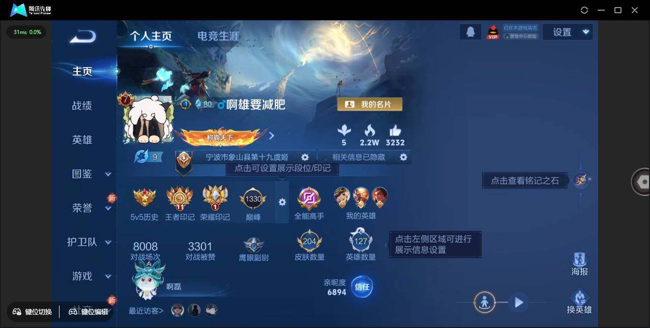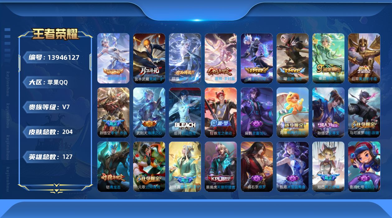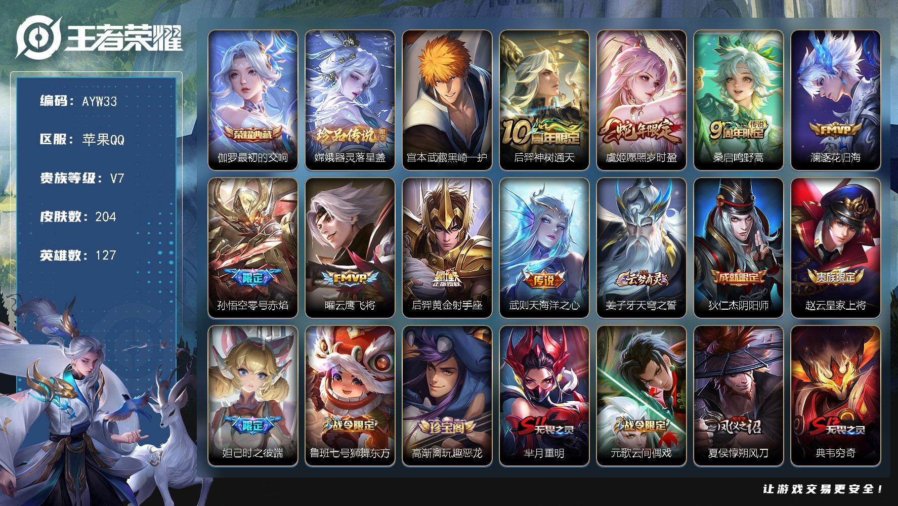 [13946127]【店主推荐捡漏号!可直接换绑】苹果Q-V7-最强王者段位-127英雄-204皮肤-1典藏-2珍品传说-8传说-64史诗