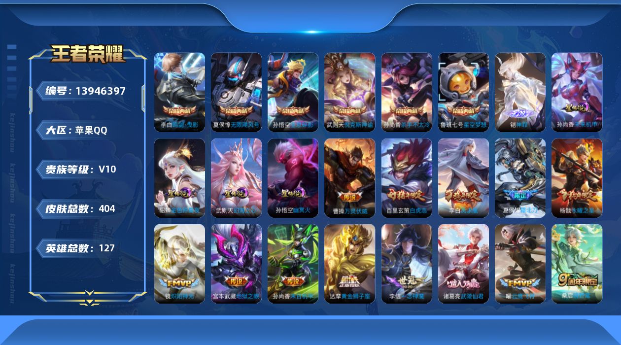 [13946397]可二次【店主推荐捡漏号!可直接换绑/省4李白、庄周/7省标10市标】:苹果Q-V10-最强王者段位-127英雄-404皮肤-6典藏-1无双-4星元-30传说-125史诗