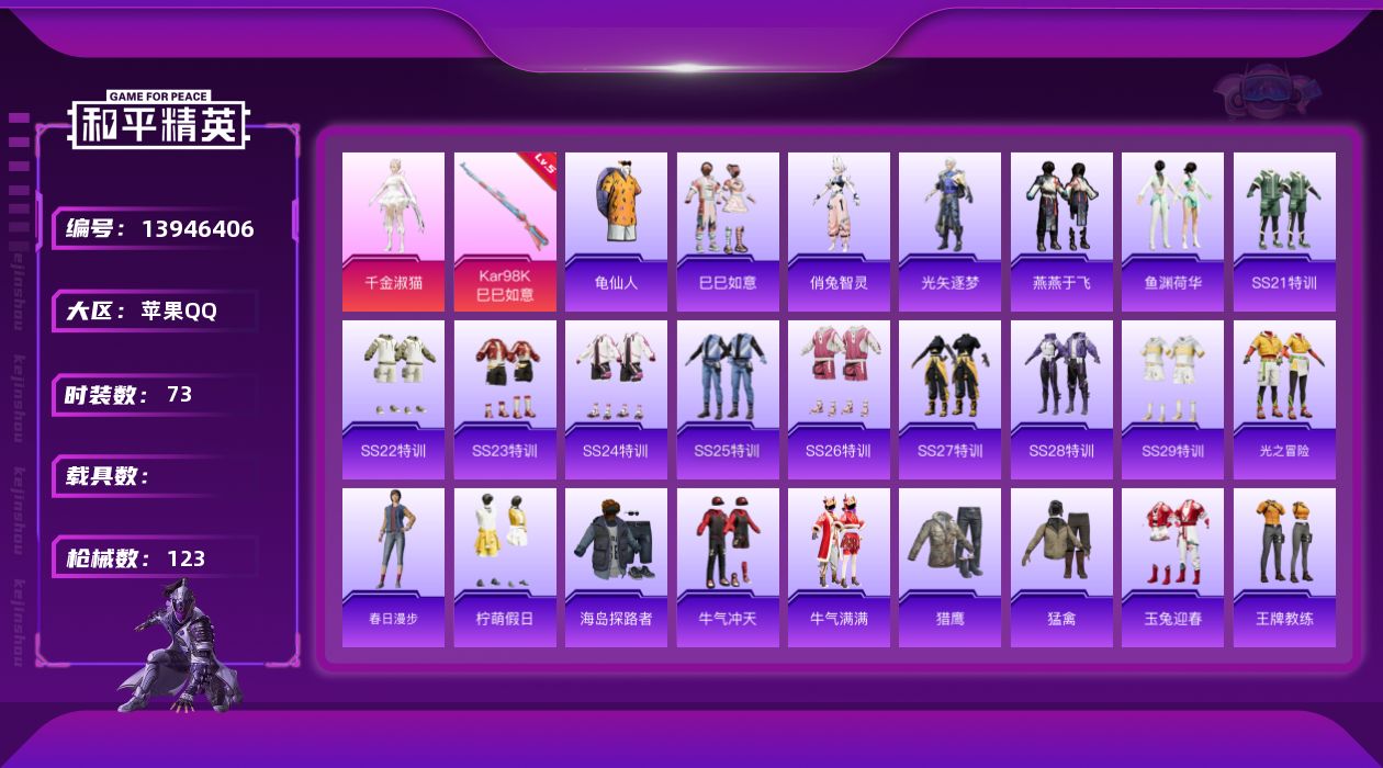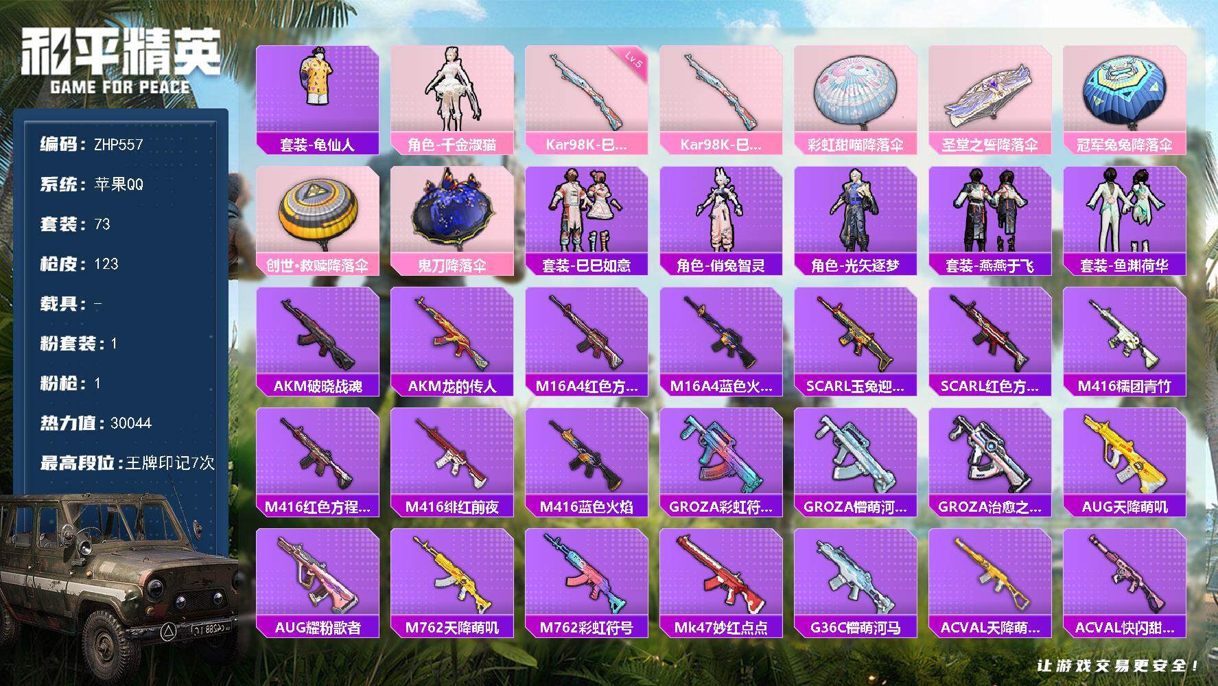 [13946406]可二次【店主推荐捡漏号!可直接换绑】 苹果 手Q-1粉装-1特效枪-3w热力值-7王牌印记-73套装-123枪皮【热门品类】:套装-龟仙人【粉色套装】:角色-千金淑猫【粉色枪皮等级】:Kar98K-巳巳如意(五级)
