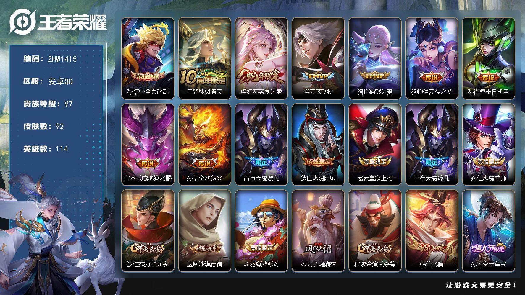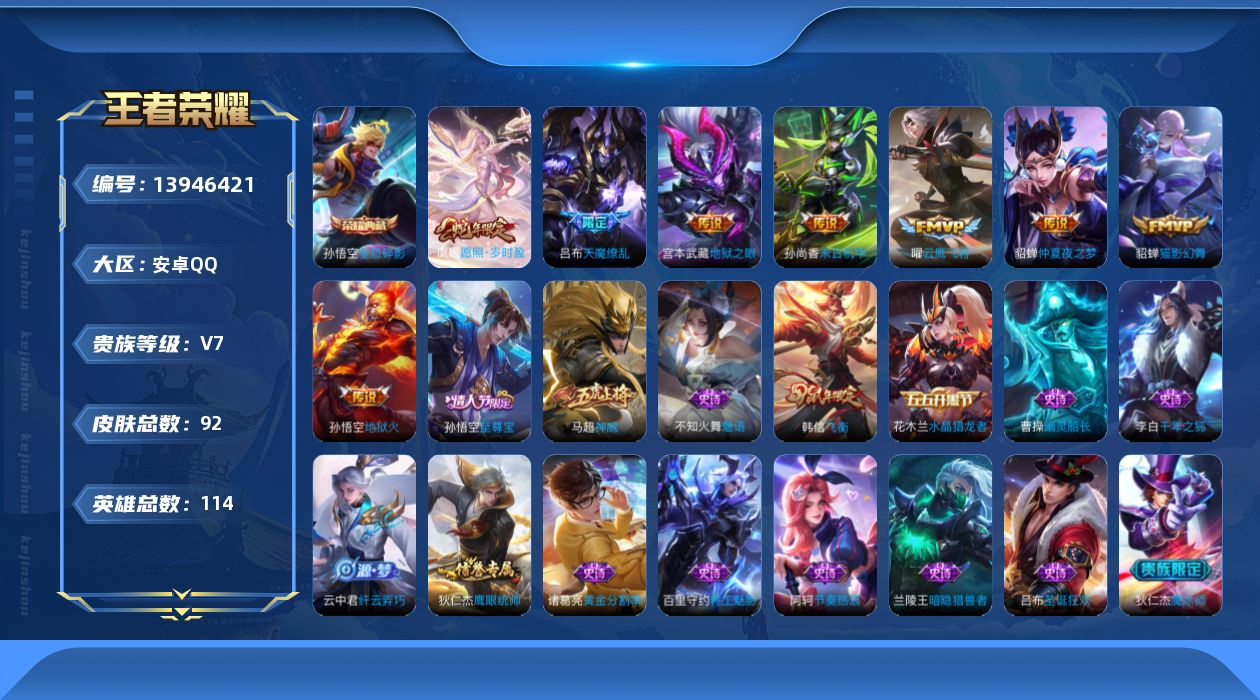 [13946421]可 二次【店主推荐捡漏号!可直接换绑】 安卓Q-V7-永恒钻石IV段位-114英雄-92皮肤-1典藏-9传说-20史诗 【荣耀典藏】:孙悟空全息碎影 【传说皮肤】:后羿神树通天,虞姬愿照岁时盈,曜云鹰飞将,貂蝉猫影幻舞,貂蝉仲夏夜之梦,孙尚香末日机甲,宫本武藏地狱之眼,孙悟空地狱火,吕布天魔缭乱 【限定皮肤】:狄仁杰阴阳师,赵云皇家上将,吕布天魔缭乱,狄仁杰魔术师,狄仁杰万华元夜,达摩沙漠行僧,项羽海滩派对,老夫子醍醐杖,程咬金演武夺筹,韩信飞衡,孙悟空至尊宝,李元芳云中旅人,钟馗驱傩正仪,鬼谷子原初探秘者,弈星混沌棋,明世隐疑决卦,云中君纤云弄巧,鲁班大师探海日志,艾琳女武神,鬼谷子天穹祈灯 【年限皮肤】:韩信飞衡,马超神威 【赛季限定】:狄仁杰万华元夜,达摩沙漠行僧,老夫子醍醐杖,程咬金演武夺筹,李元芳云中旅人,钟馗驱傩正仪,鬼谷子原初探秘者,弈星混沌棋,明世隐疑决卦,鲁班大师探海日志,鬼谷子天穹祈灯 【史诗皮肤】:赵云皇家上将,貂蝉圣诞恋歌,王昭君偶像歌手,狄仁杰魔术师,妲己魅力维加斯,吕布圣诞狂欢,曹操幽灵船长,李白千年之狐,孙悟空至尊宝,花木兰水晶猎龙者,兰陵王暗隐猎兽者,诸葛亮黄金分割率,百里守约特工魅影,李元芳逐浪之夏,阿轲节奏热浪,狄仁杰鹰眼统帅,韩信飞衡,不知火舞魅语,马超神威,云中君纤云弄巧 【其他皮肤】:项羽海滩派对,韩信街头霸王,达摩大发明家,赵云忍炎影,艾琳女武神,牛魔西部大镖客,亚瑟死亡骑士,达摩拳王,花木兰兔女郎,后羿阿尔法小队,狄仁杰阴阳师,刘备纽约教父,孙尚香沉稳之力,诸葛亮掌控之力,李白敏锐之力,吕布野性能量,弈星混沌棋,明世隐疑决卦,盾山圆桌骑士,老夫子醍醐杖,鬼谷子原初探秘者,狄仁杰万华元夜,程咬金演武夺筹,钟馗驱傩正仪,鲁班大师乓乓大师,达摩沙漠行僧,李元芳云中旅人,莱西奥西部游侠,鲁班大师探海日志,姬小满零食大作战,李元芳妄想特派,亚连破局者,鬼谷子天穹祈灯,苍苍林狼骑,太乙真人谧流熔炉,典韦铁骨偃魂,西施雪境奇遇,达摩爆裂喵拳,露娜命运加冕,艾琳鹤鸣心笺,鲁班七号福禄兄弟,鲁班七号木偶奇遇记,小乔万圣前夜,孙悟空西部大镖客,李白范海辛,钟馗地府判官,李元芳特种部队,刘邦圣殿之光,关羽天启骑士,马可波罗激情绿茵,哪吒三太子,铠龙域领主,百里守约绝影神枪,梦奇美梦成真,公孙离花间舞,孙策海之征途,李信灼热之刃,曜归虚梦演,