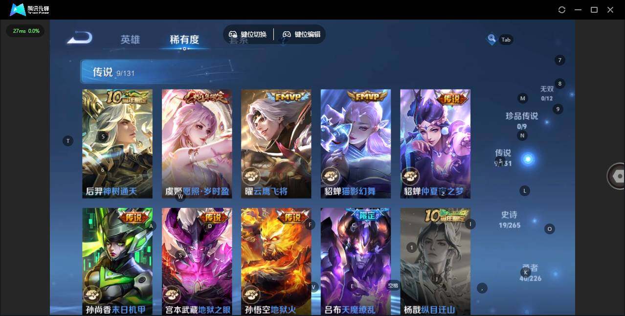 【传说皮肤】:后羿神树通天,虞姬愿照岁时盈,曜云鹰飞将,貂蝉猫影幻舞,貂蝉仲夏夜之梦,孙尚香末日机甲,宫本武藏地狱之眼,孙悟空地狱火,吕布天魔缭乱