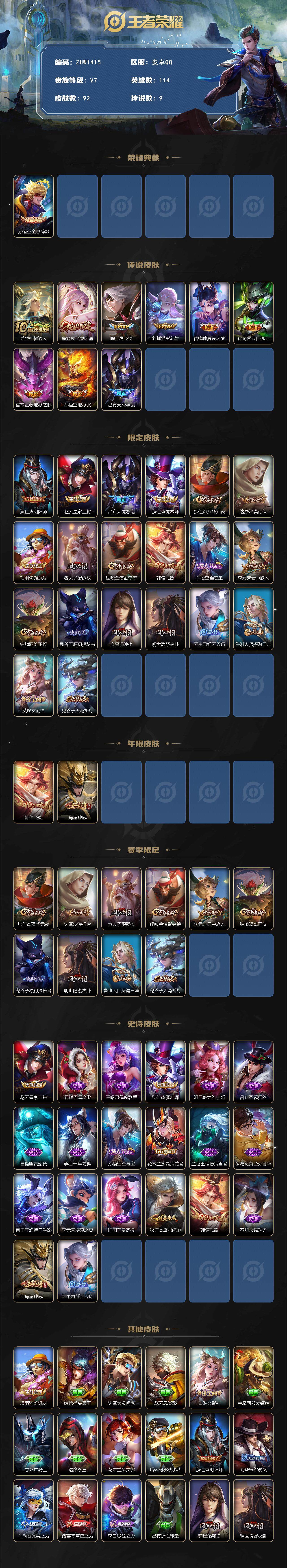 [13946421]可 二次【店主推荐捡漏号!可直接换绑】 安卓Q-V7-永恒钻石IV段位-114英雄-92皮肤-1典藏-9传说-20史诗