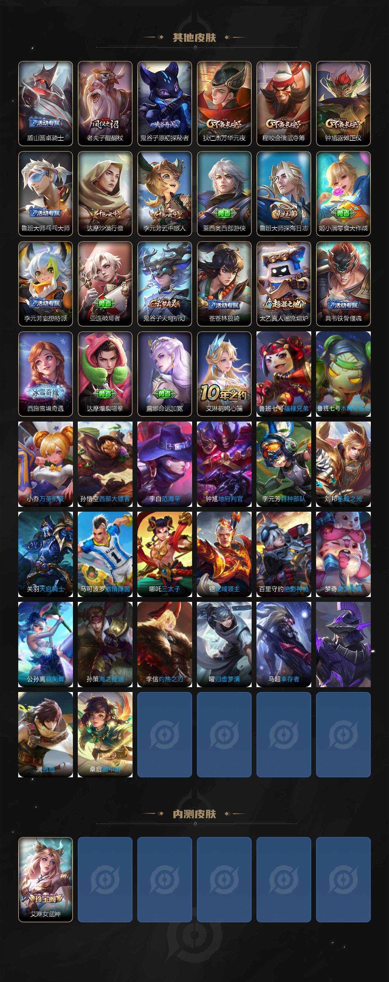 【其他皮肤】:项羽海滩派对,韩信街头霸王,达摩大发明家,赵云忍炎影,艾琳女武神,牛魔西部大镖客,亚瑟死亡骑士,达摩拳王,花木兰兔女郎,后羿阿尔法小队,狄仁杰阴阳师,刘备纽约教父,孙尚香沉稳之力,诸葛亮掌控之力,李白敏锐之力,吕布野性能量,弈星混沌棋,明世隐疑决卦,盾山圆桌骑士,老夫子醍醐杖,鬼谷子原初探秘者,狄仁杰万华元夜,程咬金演武夺筹,钟馗驱傩正仪,鲁班大师乓乓大师,达摩沙漠行僧,李元芳云中旅人,莱西奥西部游侠,鲁班大师探海日志,姬小满零食大作战,李元芳妄想特派,亚连破局者,鬼谷子天穹祈灯,苍苍林狼骑,太乙真人谧流熔炉,典韦铁骨偃魂,西施雪境奇遇,达摩爆裂喵拳,露娜命运加冕,艾琳鹤鸣心笺,鲁班七号福禄兄弟,鲁班七号木偶奇遇记,小乔万圣前夜,孙悟空西部大镖客,李白范海辛,钟馗地府判官,李元芳特种部队,刘邦圣殿之光,关羽天启骑士,马可波罗激情绿茵,哪吒三太子,铠龙域领主,百里守约绝影神枪,梦奇美梦成真,公孙离花间舞,孙策海之征途,李信灼热之刃,曜归虚梦演,