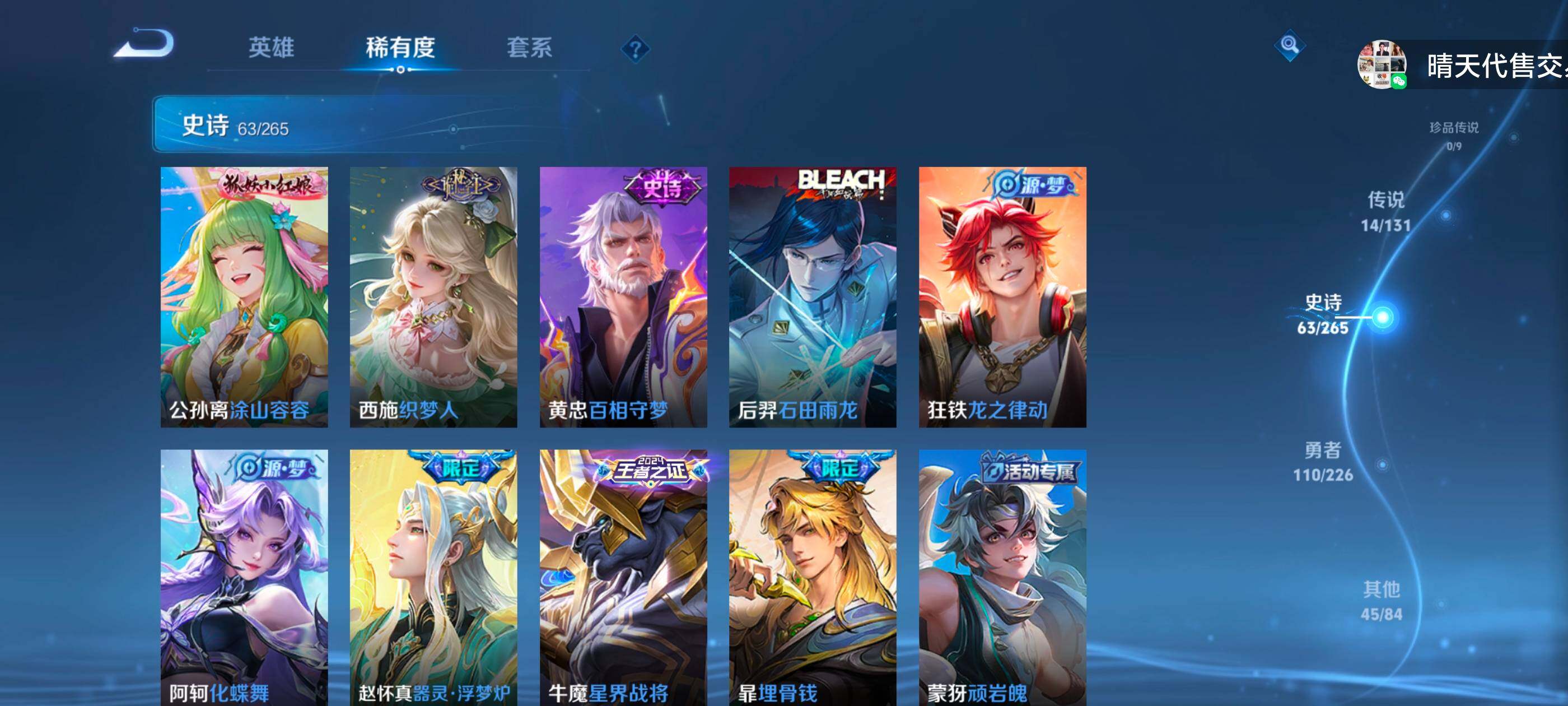- [12917609]安卓Q-V0-至尊星耀II段位-126英雄-185皮肤-0典藏-0珍品无双-0无双-0珍品传说-9传说-44史诗 【英雄全皮】:李信全皮 【传说皮肤】:桑启鸣野蒿,孙悟空齐天大圣,曜山海苍雷引,李信山海炽霜斩,吕布怒海麟威,李白诗剑行,曜云鹰飞将,李信一念神魔,刘备时之恋人 【限定皮肤】:姜子牙天穹之誓,狄仁杰阴阳师,赵云皇家上将,嬴政优雅恋人,钟无艳超时空战士,元歌无心,夏侯惇朔风刀,甄姬落雪兰心,马可波罗山海玄木吟,狄仁杰魔术师,狄仁杰万华元夜,达摩沙漠行僧,项羽海滩派对,程咬金演武夺筹,韩信飞衡,王昭君午后时光,兰陵王金庭之子,孙悟空齐天大圣,牛魔御旌,后羿辉光之辰,李元芳云中旅人,钟馗驱傩正仪,干将莫邪胡桃夹子,鬼谷子原初探秘者,鬼谷子五谷丰年,苏烈千军破阵,百里守约朱雀志,沈梦溪大漠名商,裴擒虎擒涛扼浪,狂铁电玩高手,米莱狄御霄,云中君纤云弄巧,李信山海炽霜斩,猪八戒猪悟能,上官婉儿梁祝,嫦娥暖冬兔眠,曜山海苍雷引,鲁班大师探海日志,桑启海盐诗旅,暃星界游侠,张良古海寻踪,鬼谷子天穹祈灯,沈梦溪龙舞盛年,周瑜熔金海岸 【年限皮肤】:百里守约朱雀志,后羿辉光之辰,韩信飞衡,马超神威,马可波罗山海玄木吟,李信山海炽霜斩,曜山海苍雷引 【赛季限定】:夏侯惇朔风刀,狄仁杰万华元夜,达摩沙漠行僧,程咬金演武夺筹,兰陵王金庭之子,张良古海寻踪,牛魔御旌,李元芳云中旅人,钟馗驱傩正仪,鬼谷子原初探秘者,苏烈千军破阵,沈梦溪大漠名商,裴擒虎擒涛扼浪,米莱狄御霄,鲁班大师探海日志,桑启海盐诗旅,鬼谷子天穹祈灯,姜子牙天穹之誓 【战令限定】:钟无艳超时空战士,甄姬落雪兰心,王昭君午后时光,狂铁电玩高手,嫦娥暖冬兔眠,暃星界游侠 【史诗皮肤】:赵云皇家上将,赵云未来纪元,貂蝉圣诞恋歌,狄仁杰魔术师,廉颇地狱岩魂,宫本武藏鬼剑武藏,孙尚香水果甜心,嬴政优雅恋人,嬴政摇滚巨星,妲己魅力维加斯,妲己女仆咖啡,墨子龙骑士,吕布圣诞狂欢,李白千年之狐,吕布末日机甲,花木兰水晶猎龙者,刘邦德古拉伯爵,夏侯惇乘风破浪,兰陵王暗隐猎兽者,诸葛亮黄金分割率,亚瑟心灵战警,雅典娜冰冠公主,安琪拉心灵骇客,后羿辉光之辰,百里守约特工魅影,蔡文姬舞动绿茵,阿轲节奏热浪,孙策猫狗日记,百里守约朱雀志,狄仁杰鹰眼统帅,上官婉儿梁祝,韩信飞衡,小乔青蛇,橘右京修罗,马超神威,孙尚香时之恋人,云中君纤云弄巧