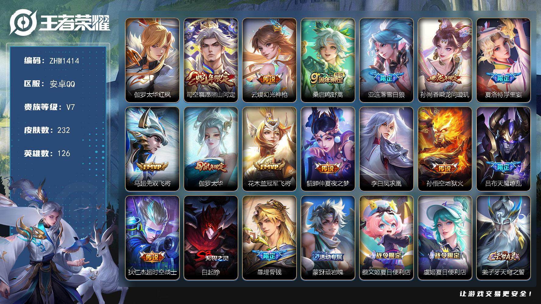 [13946427]可二次【店主推荐捡漏号!可直接换绑】万战夏洛特,安卓Q-V7-至尊星耀III段位-126英雄-232皮肤-1星传说-14传说-63史诗 【英雄全皮】:夏洛特全皮 【传说皮肤】:司空震愿照山河定,云缨幻光神枪,桑启鸣野蒿,亚连落雪白狼,孙尚香乘龙问璇玑,夏洛特浮生妄,马超无双飞将,伽罗太华,花木兰冠军飞将,貂蝉仲夏夜之梦,李白凤求凰,孙悟空地狱火,吕布天魔缭乱,狄仁杰超时空战士 【限定皮肤】:白起狰,暃埋骨钱,蒙犽顽岩魄,蔡文姬夏日便利店,虞姬夏日便利店,姜子牙天穹之誓,狄仁杰阴阳师,虞姬凯尔特女王,赵云皇家上将,赵云引擎之心,孙尚香蔷薇恋人,庄周蜃楼王,庄周高山流水,孙膑妖精王,扁鹊炼金王,芈月重明,吕布天魔缭乱,夏侯惇朔风刀,曹操烛龙,典韦穷奇,典韦蓝屏警告,马可波罗逐梦之星,狄仁杰魔术师,狄仁杰万华元夜,项羽海滩派对,老夫子醍醐杖,关羽冰锋战神,程咬金演武夺筹,亚瑟狮心王,孙悟空美猴王,孙悟空至尊宝,牛魔御旌,后羿辉光之辰,钟馗驱傩正仪,杨玉环遇见飞天,女娲朔望之晖,雅典娜黎明之约,太乙真人饕餮,鬼谷子原初探秘者,百里玄策原初追逐者,弈星混沌棋,梦奇顽趣,明世隐疑决卦,裴擒虎李小龙,裴擒虎擒涛扼浪,狂铁御狮,米莱狄御霄,云中君纤云弄巧,伽罗太华,盾山御銮,上官婉儿梁祝,嫦娥拒霜思,鲁班大师探海日志,桑启海盐诗旅,夏洛特浮生妄,阿古朵江河有灵,张良古海寻踪,蒙恬荣光圣徽,鬼谷子天穹祈灯,伽罗琥珀纪元,姬小满妄想食味,孙尚香乘龙问璇玑,亚连落雪白狼,沈梦溪龙舞盛年,刘邦剑破天穹,程咬金群星魔术团,周瑜熔金海岸 【年限皮肤】:孙悟空美猴王,李白凤求凰,后羿辉光之辰,伽罗太华,孙尚香乘龙问璇玑 【赛季限定】:庄周蜃楼王,孙膑妖精王,扁鹊炼金王,白起狰,芈月重明,夏侯惇朔风刀,曹操烛龙,典韦穷奇,狄仁杰万华元夜,老夫子醍醐杖,程咬金演武夺筹,张良古海寻踪,亚瑟狮心王,牛魔御旌,虞姬凯尔特女王,钟馗驱傩正仪,雅典娜黎明之约,太乙真人饕餮,鬼谷子原初探秘者,百里玄策原初追逐者,弈星混沌棋,梦奇顽趣,明世隐疑决卦,裴擒虎擒涛扼浪,狂铁御狮,米莱狄御霄,盾山御銮,鲁班大师探海日志,桑启海盐诗旅,鬼谷子天穹祈灯,蒙恬荣光圣徽,刘邦剑破天穹,姜子牙天穹之誓 【战令限定】:蔡文姬夏日便利店,虞姬夏日便利店,典韦蓝屏警告,女娲朔望之晖 【史诗皮肤】:鲁班七号电玩小子,赵云皇家上将,甄姬