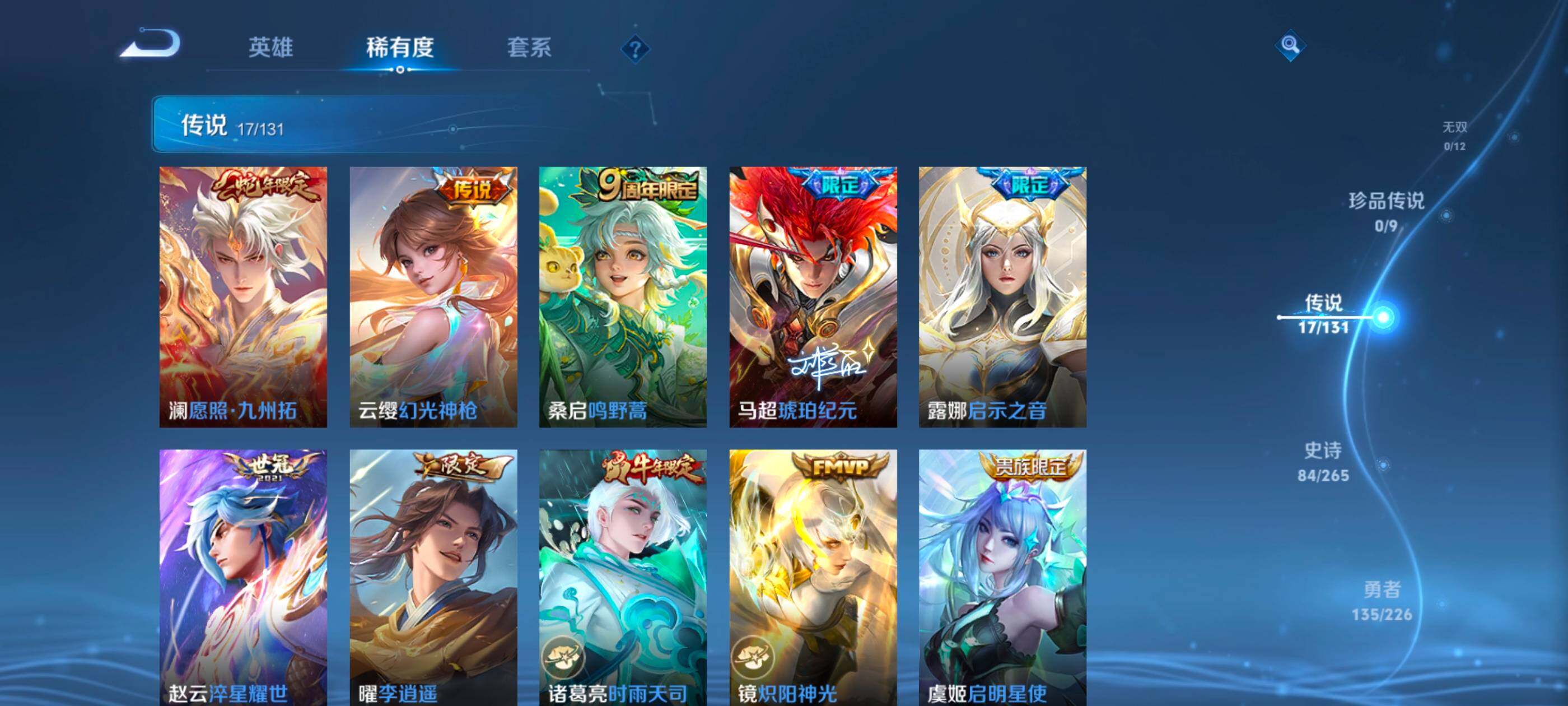 【传说皮肤】:澜愿照九州拓,云缨幻光神枪,桑启鸣野蒿,马超琥珀纪元,露娜启示之音,赵云淬星耀世,曜李逍遥 ,诸葛亮时雨天司,镜炽阳神光,虞姬启明星使,孙悟空零号赤焰,关羽武圣,刘备时之恋人,百里玄策白虎志,李白凤求凰,宫本武藏地狱之眼,吕布天魔缭乱