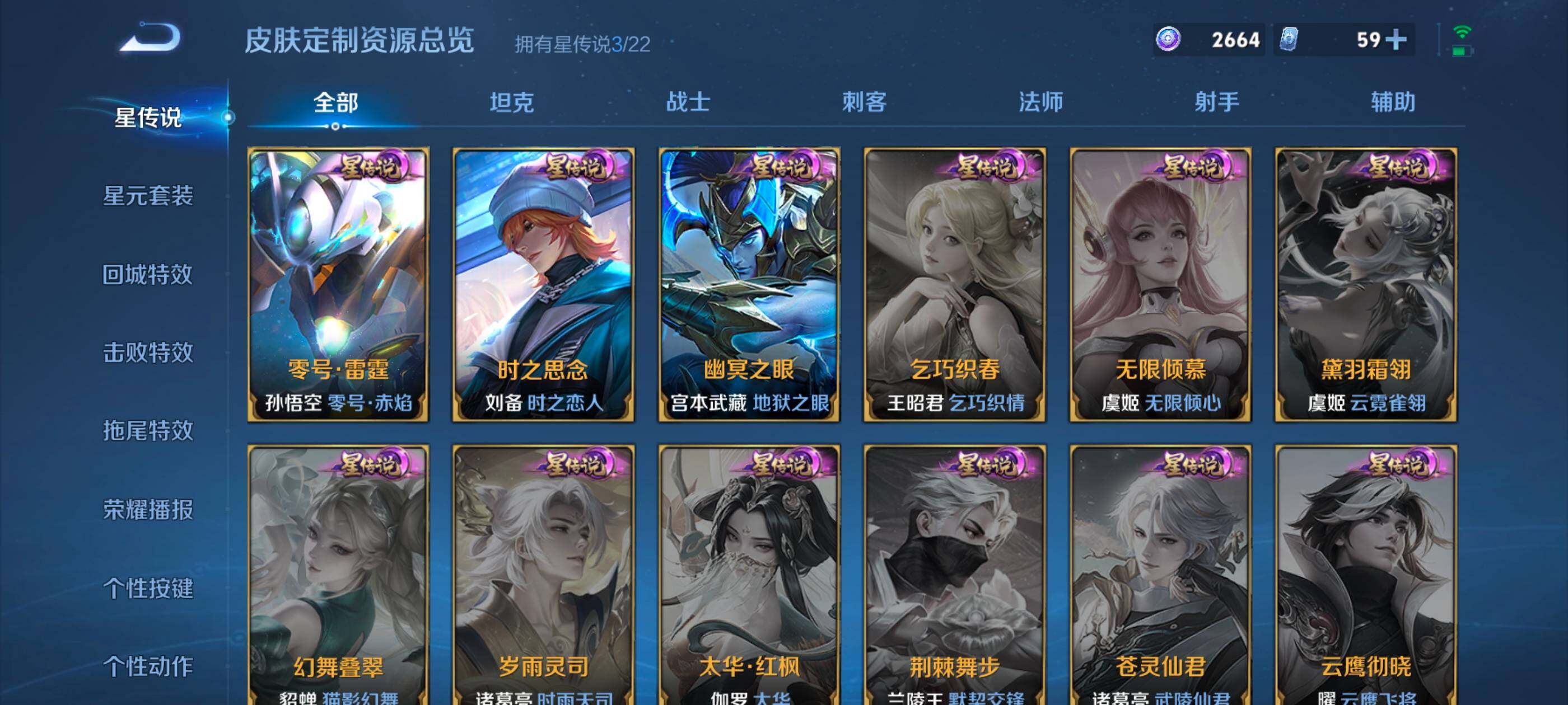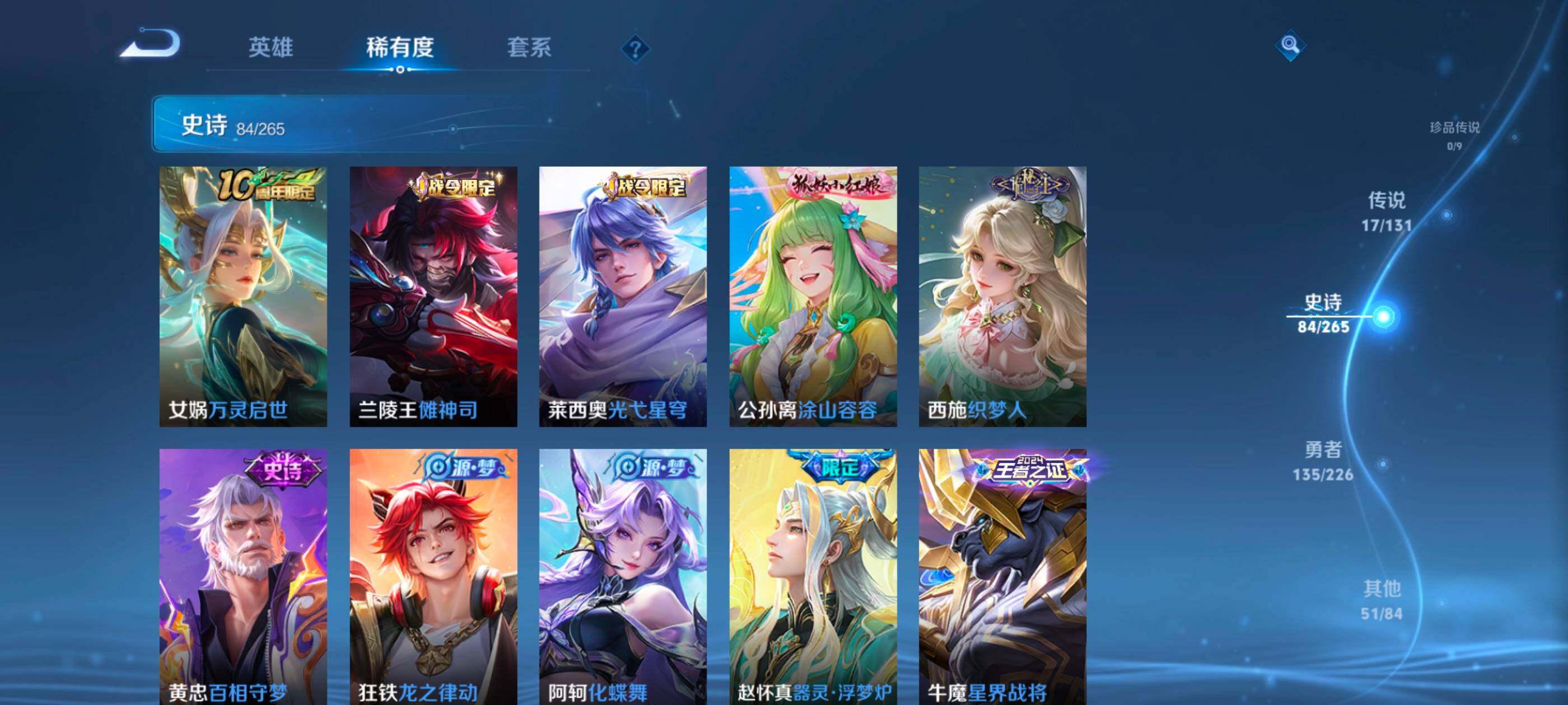 裴擒虎李小龙,上官婉儿梁祝,诸葛亮时雨天司,关羽武圣,马超神威,后羿辉光之辰,韩信飞衡,曹操天狼征服者,百里玄策白虎志,花木兰瑞麟志,百里守约朱雀志,虞姬霸王别姬,孙悟空大圣娶亲,露娜一生所爱,孙悟空至尊宝,干将莫邪冰霜恋舞曲,孙悟空美猴王,露娜启示之音,桑启鸣野蒿,澜愿照·九州拓