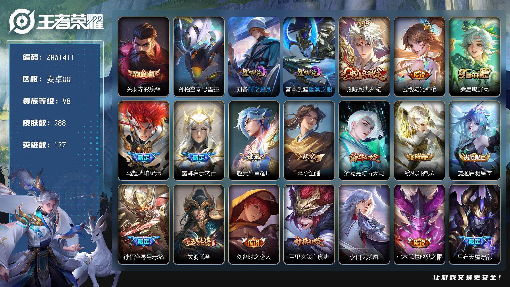 - [13403847]可二次【店主推荐捡漏号!可直接换绑】安卓Q-V8-至尊星耀V段位-127英雄-336皮肤-2典藏--4传说-94史诗 【英雄全皮】:钟馗全皮 【荣耀典藏】:孙悟空全息碎影,鲁班七号星空梦想 【传说皮肤】:后羿神树通天,桑启鸣野蒿,铠绛天战甲,虞姬启明星使 【限定皮肤】:白起狰,狄仁杰阴阳师,虞姬凯尔特女王,赵云皇家上将,墨子神迹守卫,嬴政白昼王子,孙尚香蔷薇恋人,鲁班七号狮舞东方,庄周蜃楼王,庄周高山流水,钟无艳超时空战士,孙膑妖精王,芈月重明,芈月幻夜卜梦,吕布猎兽之王,周瑜赤莲之焰,元歌云间偶戏,元歌无心,夏侯惇朔风刀,甄姬幽恒,甄姬落雪兰心,曹操烛龙,典韦穷奇,典韦蓝屏警告,马可波罗暗影游猎,狄仁杰魔术师,狄仁杰万华元夜,达摩星际陆战队,达摩沙漠行僧,项羽海滩派对,老夫子圣诞老人,老夫子醍醐杖,老夫子航海奇遇记,程咬金演武夺筹,兰陵王驯魔猎人,兰陵王金庭之子,亚瑟狮心王,亚瑟潮玩骑士王,孙悟空大圣娶亲,孙悟空孙行者,牛魔御旌,后羿如梦令,后羿圣弓游侠,李元芳银河之约,李元芳云中旅人,虞姬启明星使,钟馗神迹守卫,钟馗驱傩正仪,杨玉环遇见飞天,杨戬潮玩骑兵,女娲朔望之晖,干将莫邪冰霜恋舞曲,干将莫邪真爱魔法,雅典娜单词大作战,雅典娜黎明之约,蔡文姬繁星吟游,太乙真人饕餮,鬼谷子原初探秘者,鬼谷子五谷丰年,黄忠火炮绅士,苏烈千军破阵,百里守约朱雀志,弈星混沌棋,沈梦溪星空之诺,沈梦溪大漠名商,明世隐疑决卦,裴擒虎李小龙,裴擒虎擒涛扼浪,狂铁御狮,米莱狄御霄,米莱狄胡桃异想国,云中君纤云弄巧,盾山御銮,猪八戒西部大镖客,上官婉儿梁祝,嫦娥拒霜思,西施玲珑珍味,蒙犽狂想玩偶喵,鲁班大师探海日志,桑启海盐诗旅,艾琳女武神,阿古朵江河有灵,张良古海寻踪,鬼谷子天穹祈灯,姬小满妄想食味,鲁班七号蔬乡物语,李元芳蔬乡物语,刘邦剑破天穹,程咬金群星魔术团,关羽决胜骁骑,镜青焰无极,项羽苍威无极,海诺心动手记,刘备异域游侠 【年限皮肤】:百里守约朱雀志,甄姬幽恒 【赛季限定】:庄周蜃楼王,孙膑妖精王,白起狰,芈月重明,夏侯惇朔风刀,曹操烛龙,典韦穷奇,狄仁杰万华元夜,达摩沙漠行僧,老夫子醍醐杖,程咬金演武夺筹,兰陵王金庭之子,张良古海寻踪,亚瑟狮心王,牛魔御旌,李元芳云中旅人,虞姬凯尔特女王,钟馗驱傩正仪,雅典娜黎明之约,太乙真人饕餮,鬼谷子原初探秘者,苏烈千军破阵,弈星混沌棋,