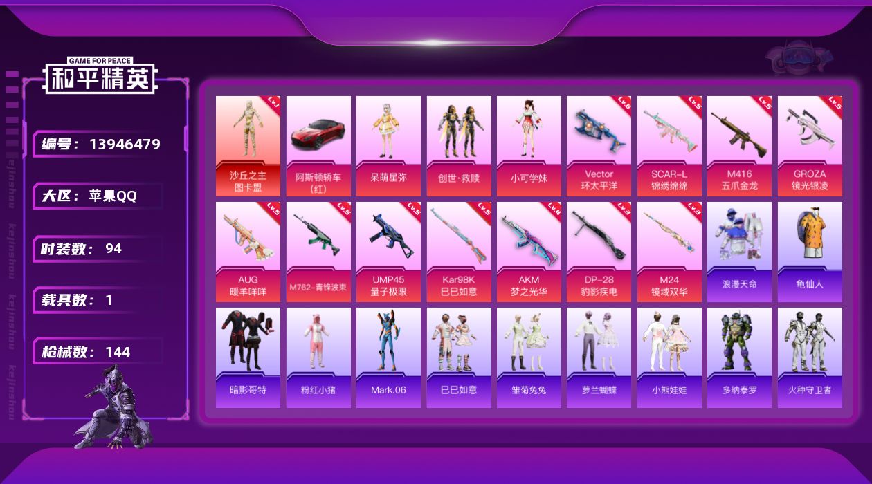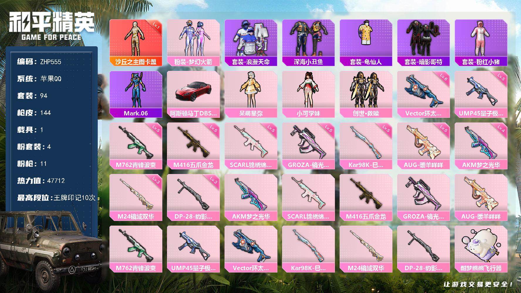 [13946479]图卡盟!苹果 手Q-1神装-4粉装-11特效枪-1载具-8粉色飞行器-47712热力值-10王牌印记-94套装-144枪皮