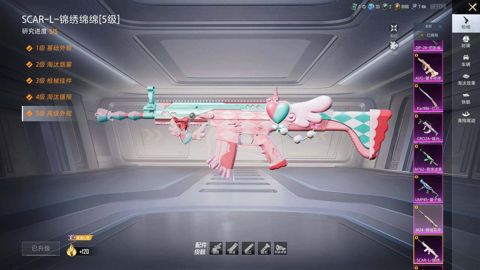 【粉色枪皮等级】:AKM-梦之光华(四级),SCAR-L-锦绣绵绵(五级),M416-五爪金龙(五级),GROZA-镜光银凌(五级),AUG-暖羊咩咩(五级),M762-青锋波束(五级),UMP45-量子极限(五级),Vector-环太平洋(六级),Kar98K-巳巳如意(五级),M24-镜域双华(三级),DP-28-豹影疾电(三级)