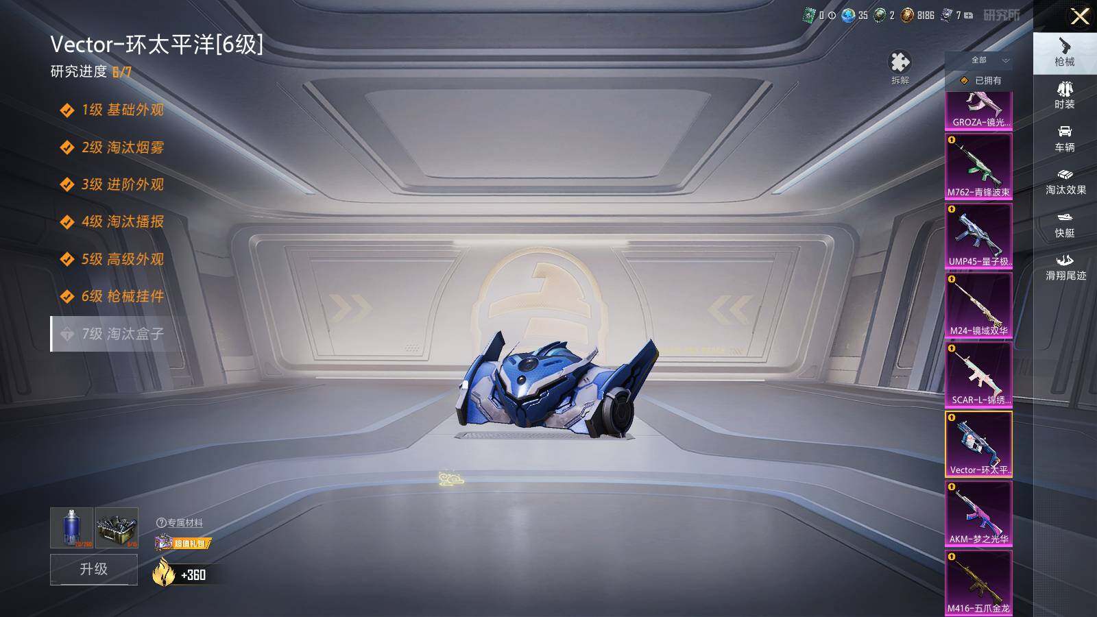 AKM-梦之光华,M416-五爪金龙,GROZA-镜光银凌,AUG-暖羊咩咩,M762-青锋波束,UMP45-量子极限,Vector-环太平洋,Kar98K-巳巳如意,M24-镜域双华