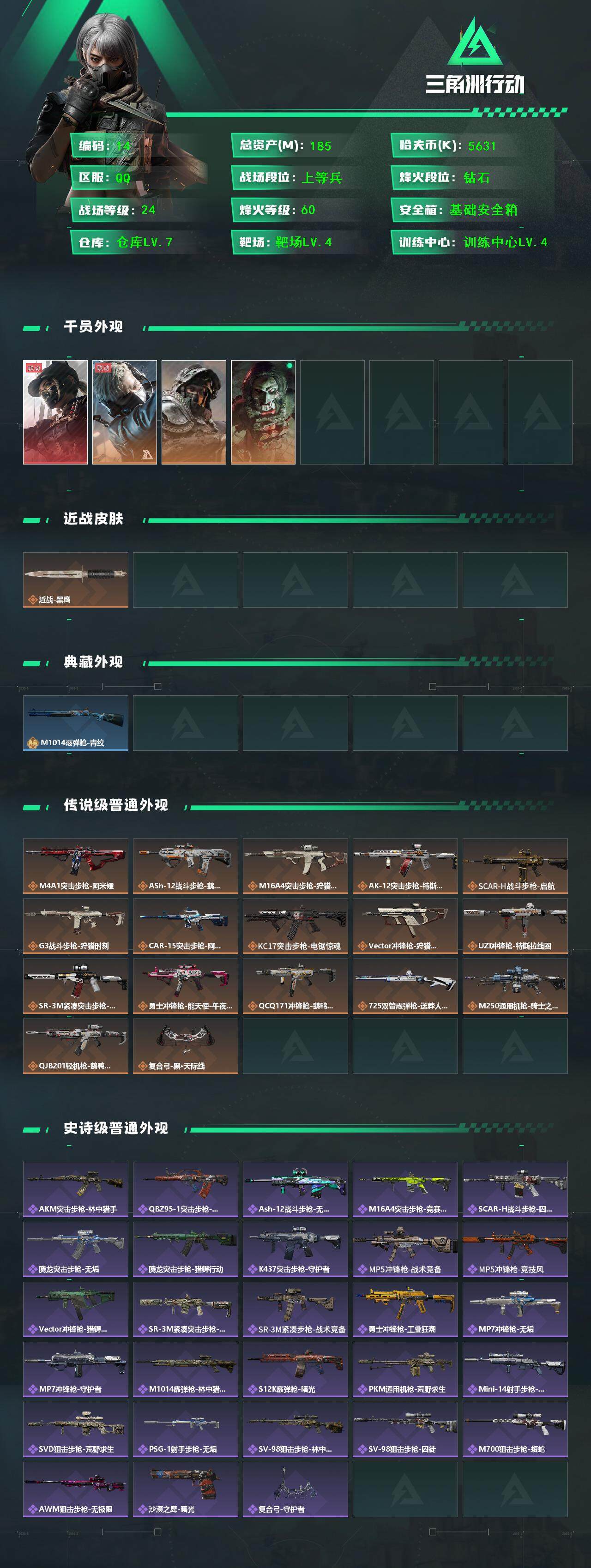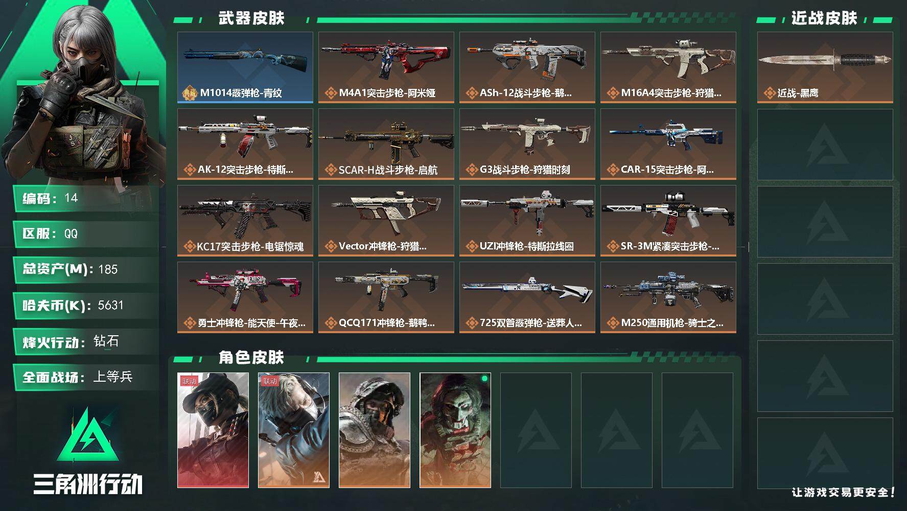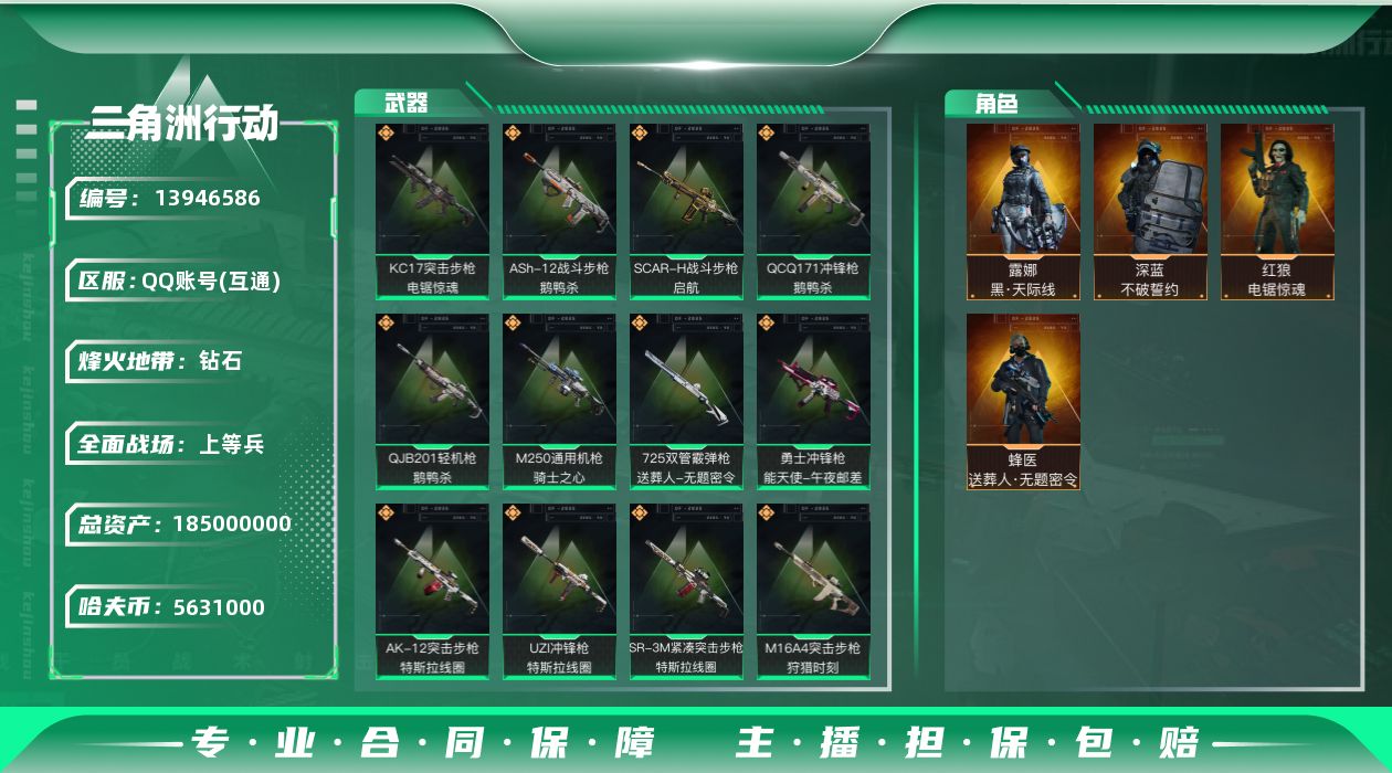 [13946586]可秒换绑 总资产185m 5631k哈伏币-185m流动资产-60烽火等级-钻石-24战场等级-上等兵 【干员外观】:露娜-黑·天际线,蜂医-送葬人·无题密令,深蓝-不破誓约,红狼-电锯惊魂 【近战皮肤】:近战-黑鹰 【典藏外观】:M1014霰弹枪-青纹 【传说级普通外观】:M4A1突击步枪-阿米娅,ASh-12战斗步枪-鹅鸭杀,M16A4突击步枪-狩猎时刻,AK-12突击步枪-特斯拉线圈,SCAR-H战斗步枪-启航,G3战斗步枪-狩猎时刻,CAR-15突击步枪-阿米娅,KC17突击步枪-电锯惊魂,Vector冲锋枪-狩猎时刻,UZI冲锋枪-特斯拉线圈,SR-3M紧凑突击步枪-特斯拉线圈,勇士冲锋枪-能天使-午夜邮差,QCQ171冲锋枪-鹅鸭杀,725双管霰弹枪-送葬人-无题密令,M250通用机枪-骑士之心,QJB201轻机枪-鹅鸭杀,复合弓-黑·天际线 【史诗级普通外观】:AKM突击步枪-林中猎手,QBZ95-1突击步枪-曙光,ASh-12战斗步枪-无极限,M16A4突击步枪-竞赛选手,SCAR-H战斗步枪-囚徒,腾龙突击步枪-无垢,腾龙突击步枪-猎鳄行动,K437突击步枪-守护者,MP5冲锋枪-战术竞备,MP5冲锋枪-竞技风,Vector冲锋枪-猎鳄行动,SR-3M紧凑突击步枪-荒野求生,SR-3M紧凑突击步枪-战术竞备,勇士冲锋枪-工业狂潮,MP7冲锋枪-无垢,MP7冲锋枪-守护者,M1014霰弹枪-林中猎手,S12K霰弹枪-曙光,PKM通用机枪-荒野求生,Mini-14射手步枪-守护者,SVD狙击步枪-荒野求生,PSG-1射手步枪-无垢,SV-98狙击步枪-林中猎手,SV-98狙击步枪-囚徒,M700狙击步枪-蝮蛇,AWM狙击步枪-无极限,沙漠之鹰-曙光,复合弓-守护者 【稀有级普通外观】:K416突击步枪-虎啸,SCAR-H战斗步枪-荣耀列队,PTR-32突击步枪-天网,腾龙突击步枪-雪崩,MP5冲锋枪-弄臣,MP5冲锋枪-虎啸,P90冲锋枪-浅鲨小队,Vector冲锋枪-先锋,SMG-45-行动开启,SMG-45冲锋枪-幻影结构,SMG-45冲锋枪-天网,SR-3M紧凑突击步枪-雪崩,M1014霰弹枪-幻影结构,M250通用机枪-虎啸,M250通用机枪-天网,Mini-14射手步枪-荣耀列队,SKS射手步枪-弄臣,SKS射手步枪-雪崩,SR-9射手步枪
