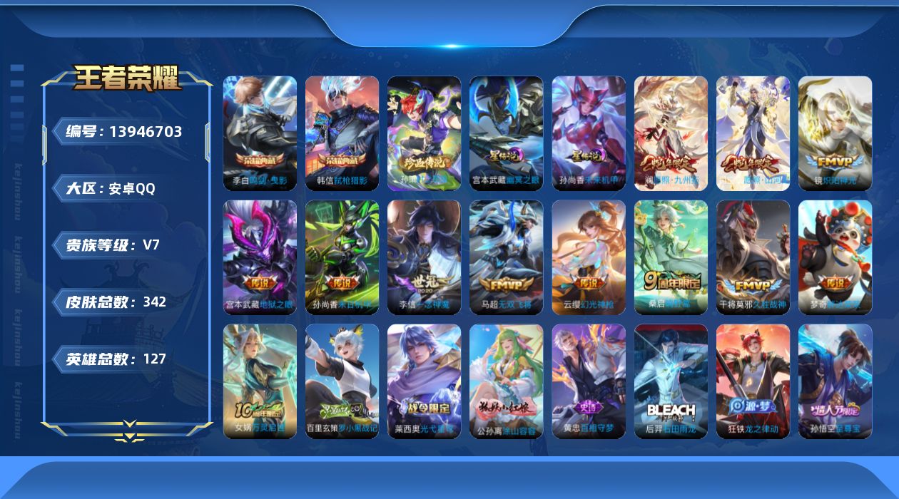 [13946703]【店主推荐捡漏号!可直接换绑】安卓Q-V7-最强王者段位36段打野32段发育路金标莱西奥-127英雄-342皮肤-2典藏-2星元-1珍品传说-12传说-115史诗