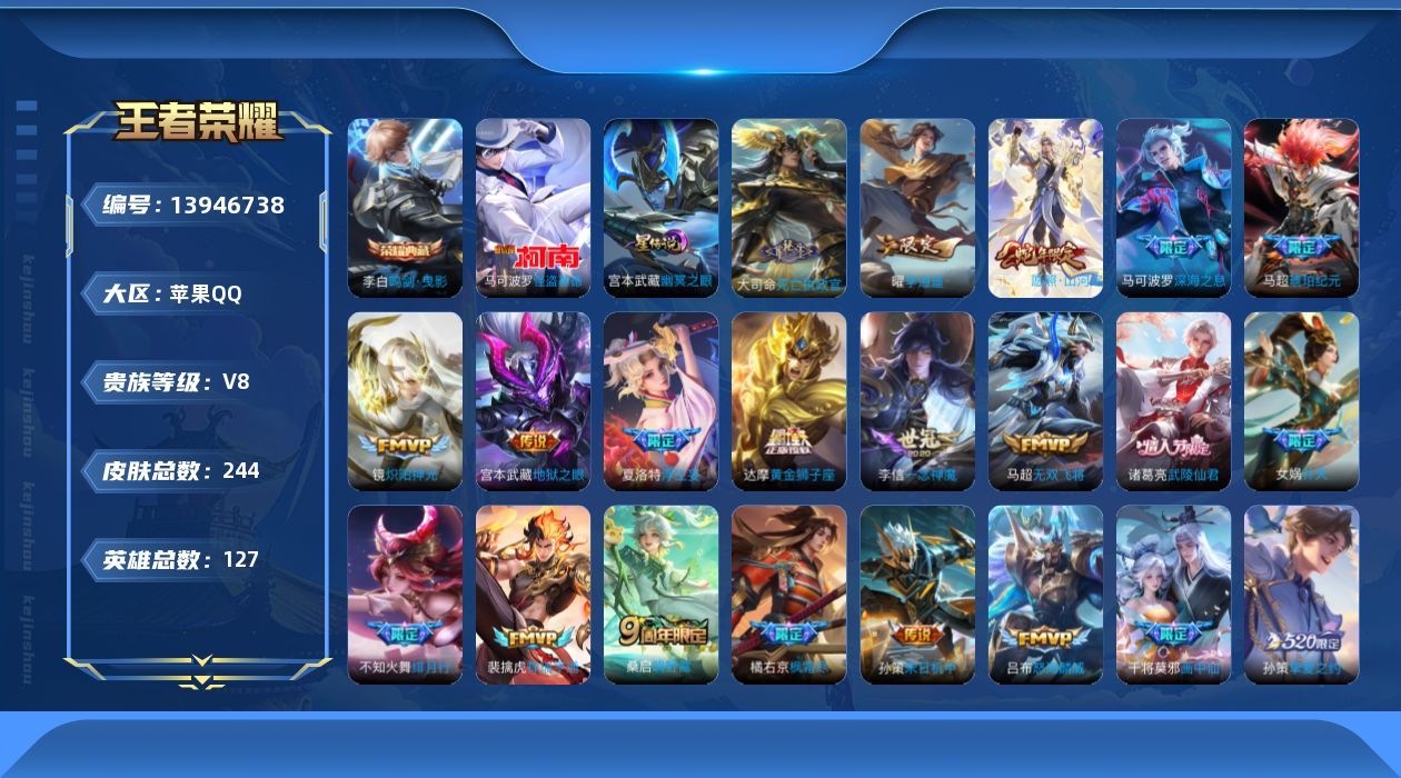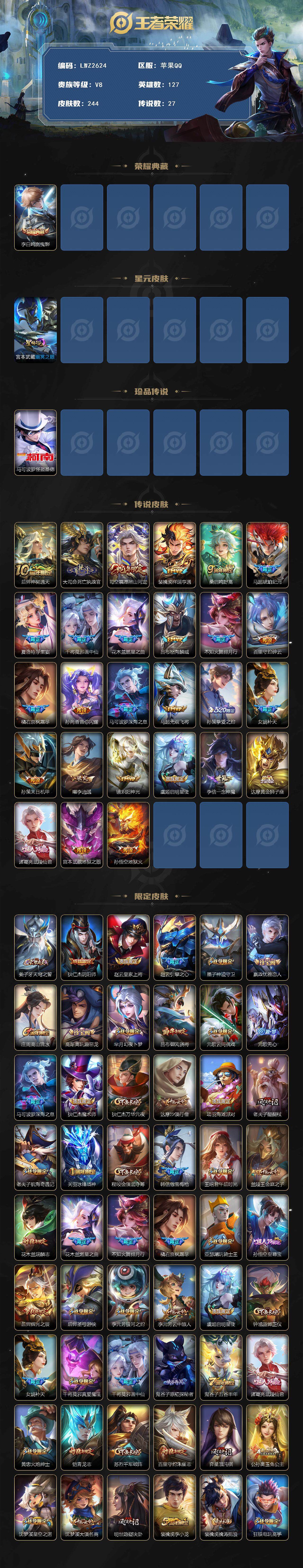 [13946738]【店主推荐捡漏号!可直接换绑】苹果Q-V8-最强王者段位-127英雄-244皮肤-1典藏-1星元-1珍品传说-27传说-72史诗 【英雄全皮】:橘右京全皮,马超全皮,蒙恬全皮,夏洛特全皮,戈娅全皮 【荣耀典藏】:李白鸣剑曳影 【珍品传说】:马可波罗怪盗基德 【传说皮肤】:后羿神树通天,大司命死亡执政官,司空震愿照山河定,裴擒虎祥瑞亨通,桑启鸣野蒿,马超琥珀纪元,夏洛特浮生妄,干将莫邪画中仙,花木兰燃星之曲,吕布怒海麟威,不知火舞绯月行,百里守约碎云,橘右京枫霜尽,孙尚香音你闪耀,马可波罗深海之息,马超无双飞将,孙策挚爱之约,女娲补天,孙策末日机甲,曜李逍遥 ,镜炽阳神光,虞姬启明星使,李信一念神魔,达摩黄金狮子座,诸葛亮武陵仙君,宫本武藏地狱之眼,孙悟空地狱火 【限定皮肤】:姜子牙天穹之誓,狄仁杰阴阳师,赵云皇家上将,赵云引擎之心,墨子神迹守卫,嬴政优雅恋人,庄周高山流水,高渐离玩趣恶龙,芈月幻夜卜梦,吕布御风骁将,元歌云间偶戏,元歌无心,马可波罗深海之息,狄仁杰魔术师,狄仁杰万华元夜,达摩沙漠行僧,项羽海滩派对,老夫子醍醐杖,老夫子航海奇遇记,关羽冰锋战神,程咬金演武夺筹,韩信傲雪梅枪,王昭君午后时光,兰陵王金庭之子,花木兰瑞麟志,花木兰燃星之曲,不知火舞绯月行,橘右京枫霜尽,亚瑟潮玩骑士王,孙悟空至尊宝,后羿辉光之辰,后羿圣弓游侠,李元芳银河之约,李元芳云中旅人,虞姬启明星使,钟馗驱傩正仪,女娲补天,干将莫邪真爱魔法,干将莫邪画中仙,鬼谷子原初探秘者,鬼谷子五谷丰年,诸葛亮武陵仙君,黄忠火炮绅士,铠青龙志,苏烈千军破阵,百里守约朱雀志,弈星混沌棋,公孙离玉兔公主,沈梦溪星空之诺,沈梦溪大漠名商,明世隐疑决卦,裴擒虎李小龙,裴擒虎擒涛扼浪,狂铁电玩高手,孙策挚爱之约,上官婉儿梁祝,嫦娥拒霜思,曜李逍遥 ,西施玲珑珍味,鲁班大师探海日志,桑启海盐诗旅,夏洛特浮生妄,戈娅驭风魔法,艾琳流音漫舞,阿古朵江河有灵,张良古海寻踪,蒙恬荣光圣徽,高渐离燃音魔法,鬼谷子天穹祈灯,马超琥珀纪元,刘邦剑破天穹,程咬金群星魔术团 【年限皮肤】:百里守约朱雀志,花木兰瑞麟志,铠青龙志,后羿辉光之辰,吕布御风骁将,马超神威 【赛季限定】:狄仁杰万华元夜,达摩沙漠行僧,老夫子醍醐杖,程咬金演武夺筹,兰陵王金庭之子,张良古海寻踪,李元芳云中旅人,钟馗驱傩正仪,鬼谷子原初探秘者,苏烈千军破阵