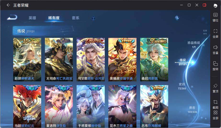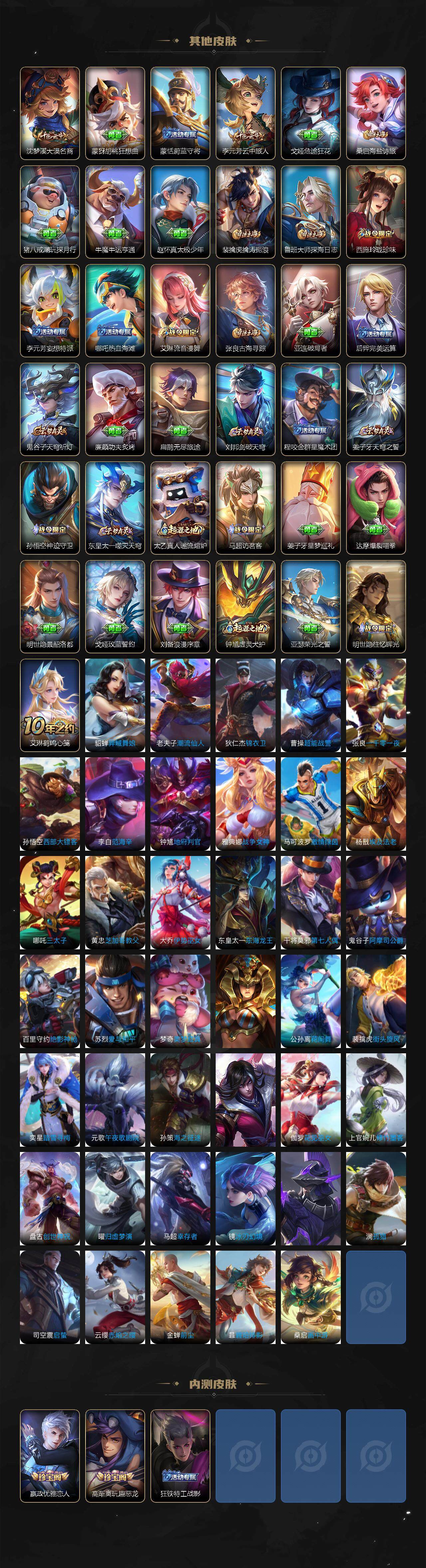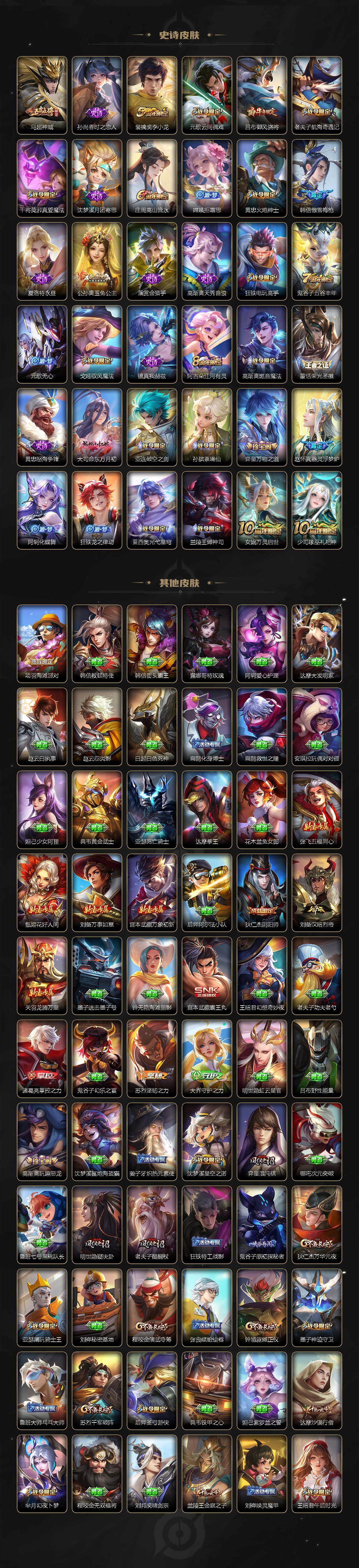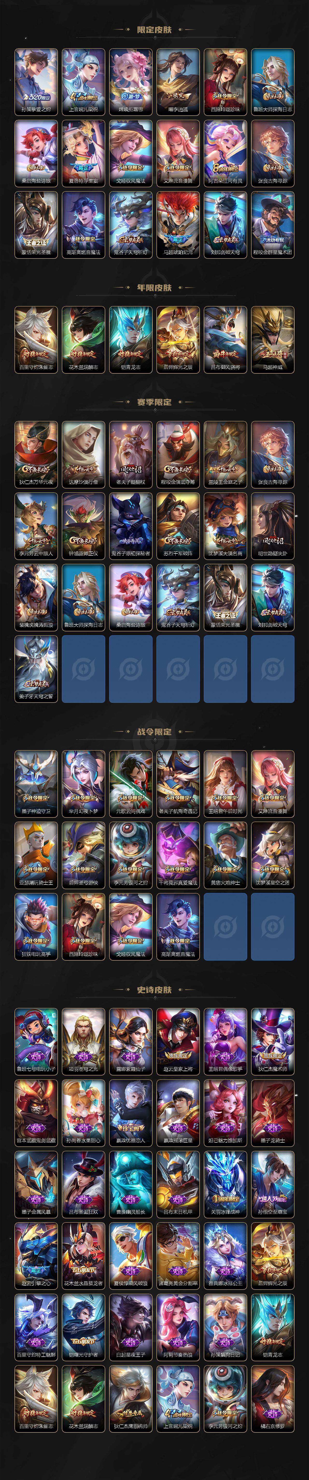 【限定皮肤】:姜子牙天穹之誓,狄仁杰阴阳师,赵云皇家上将,赵云引擎之心,墨子神迹守卫,嬴政优雅恋人,庄周高山流水,高渐离玩趣恶龙,芈月幻夜卜梦,吕布御风骁将,元歌云间偶戏,元歌无心,马可波罗深海之息,狄仁杰魔术师,狄仁杰万华元夜,达摩沙漠行僧,项羽海滩派对,老夫子醍醐杖,老夫子航海奇遇记,关羽冰锋战神,程咬金演武夺筹,韩信傲雪梅枪,王昭君午后时光,兰陵王金庭之子,花木兰瑞麟志,花木兰燃星之曲,不知火舞绯月行,橘右京枫霜尽,亚瑟潮玩骑士王,孙悟空至尊宝,后羿辉光之辰,后羿圣弓游侠,李元芳银河之约,李元芳云中旅人,虞姬启明星使,钟馗驱傩正仪,女娲补天,干将莫邪真爱魔法,干将莫邪画中仙,鬼谷子原初探秘者,鬼谷子五谷丰年,诸葛亮武陵仙君,黄忠火炮绅士,铠青龙志,苏烈千军破阵,百里守约朱雀志,弈星混沌棋,公孙离玉兔公主,沈梦溪星空之诺,沈梦溪大漠名商,明世隐疑决卦,裴擒虎李小龙,裴擒虎擒涛扼浪,狂铁电玩高手,孙策挚爱之约,上官婉儿梁祝,嫦娥拒霜思,曜李逍遥 ,西施玲珑珍味,鲁班大师探海日志,桑启海盐诗旅,夏洛特浮生妄,戈娅驭风魔法,艾琳流音漫舞,阿古朵江河有灵,张良古海寻踪,蒙恬荣光圣徽,高渐离燃音魔法,鬼谷子天穹祈灯,马超琥珀纪元,刘邦剑破天穹,程咬金群星魔术团