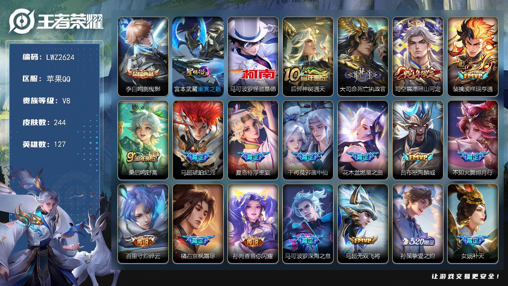 [13946738]【店主推荐捡漏号!可直接换绑】苹果Q-V8-最强王者段位-127英雄-244皮肤-1典藏-1星元-1珍品传说-27传说-72史诗