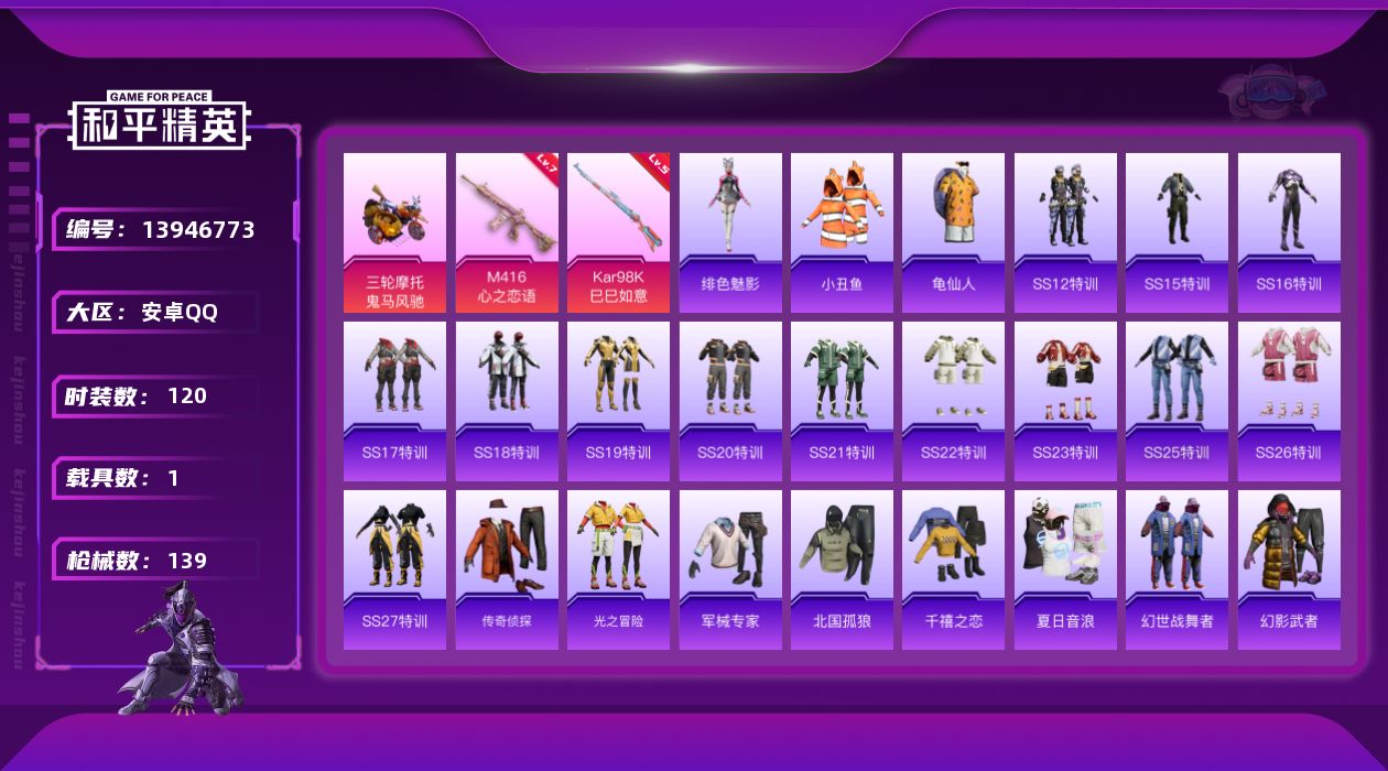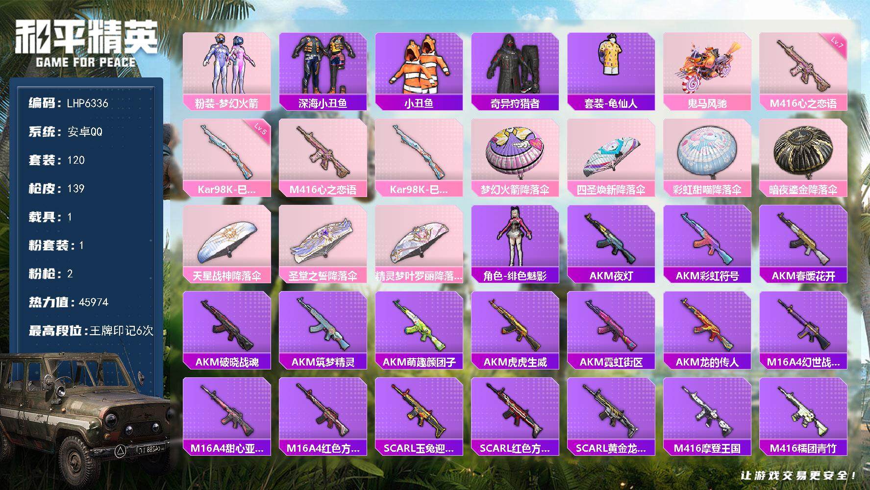 [13946773]【店主推荐捡漏号!可直接换绑】安卓 手Q-1粉装-2特效枪-1载具-0粉色飞行器-4.5w热力值-6王牌印记-120套装-139枪皮【热门品类】:粉装-梦幻火箭,套装-深海小丑鱼,套装-小丑鱼,套装-奇异狩猎者,套装-龟仙人【粉色载具】:鬼马风驰【粉色套装】:粉装-梦幻火箭【粉色枪皮等级】:M416-心之恋语(七级),Kar98K-巳巳如意(五级)