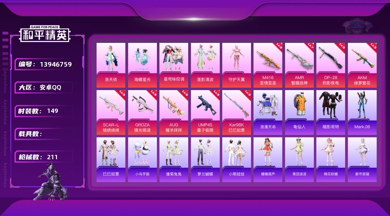 [13946759]【店主推荐捡漏号!可直接换绑】M416-至情至圣(九级)/地铁满天赋 安卓 手Q-5粉装-10特效枪-4粉色飞行器-6.7w热力值-16王牌印记-149套装-211枪皮【热门品类】:套装-浪漫天命,套装-深海小丑鱼,套装-龟仙人,套装-暗影哥特,角色-Mark.06【粉色套装】:角色-洛天依,粉装-海螺星光,粉装-莲影清波,角色-守护天翼,粉装-星穹咏叹调【粉色枪皮等级】:AKM-绿萝繁花(五级),SCAR-L-锦绣绵绵(五级),M416-至情至圣(九级),GROZA-镜光银凌(五级),AUG-暖羊咩咩(五级),UMP45-量子极限(五级),Kar98K-巳巳如意(五级),Mk14-甜梦熊击(五级),AMR-智耀战神(七级),DP-28-豹影疾电(五级)【粉色飞行器】:龙翔九天飞行器,墨金战记飞行器