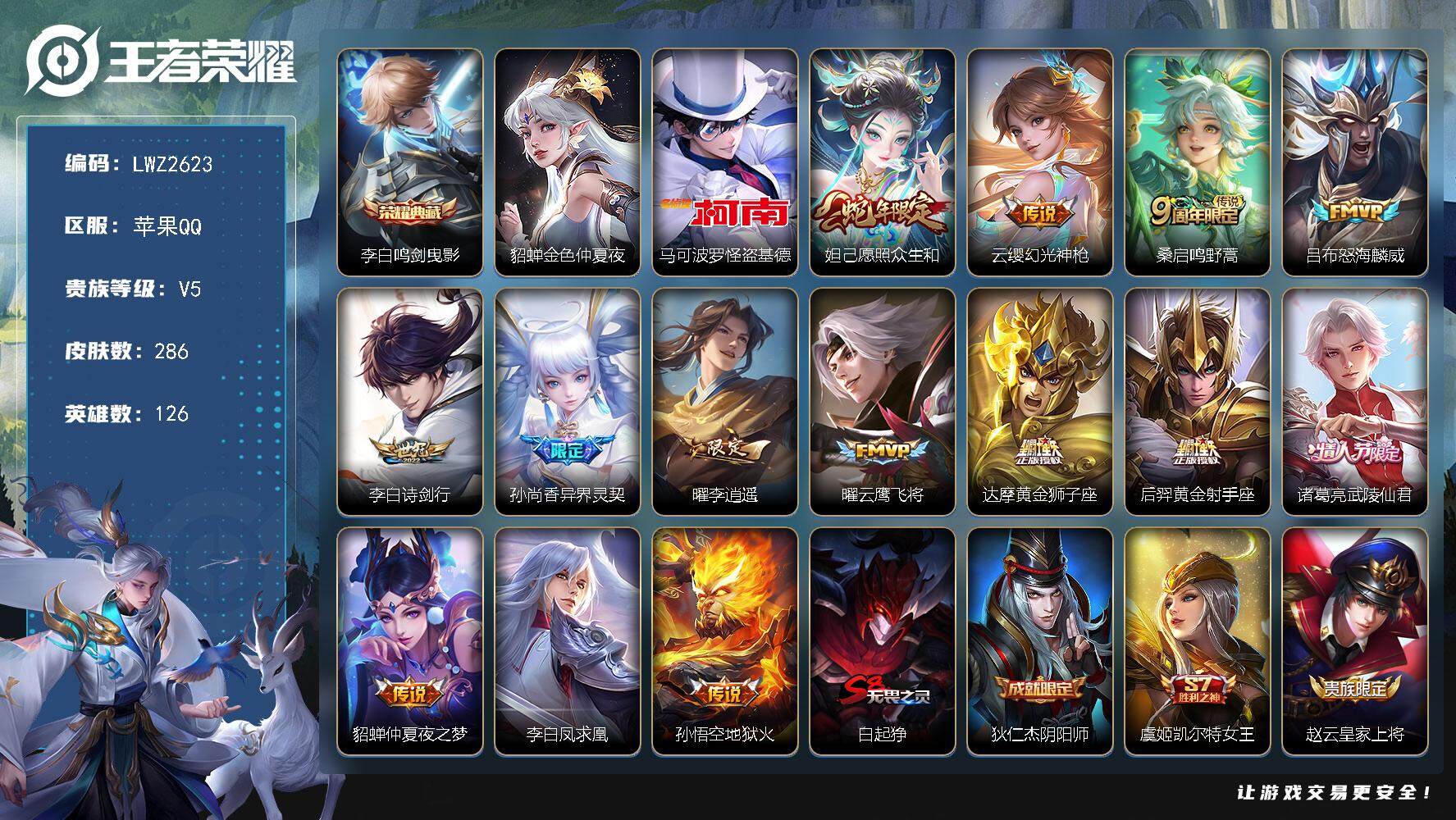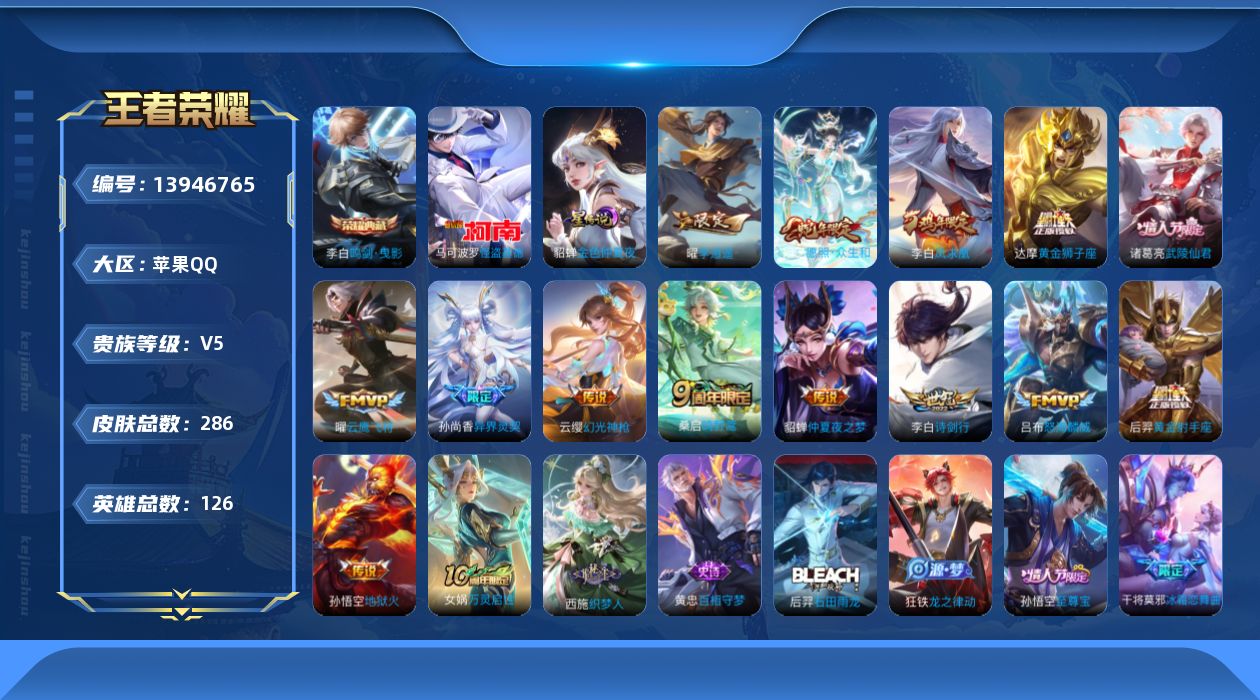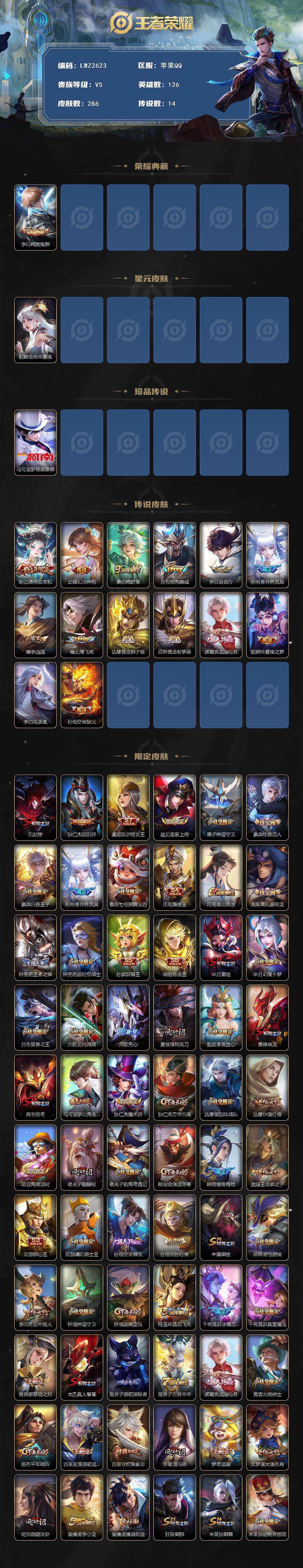 [13946765]可二次 苹果Q-V7-最强王者段位-126英雄-286皮肤-1典藏-1星传-1珍品传说-14传说-80史诗