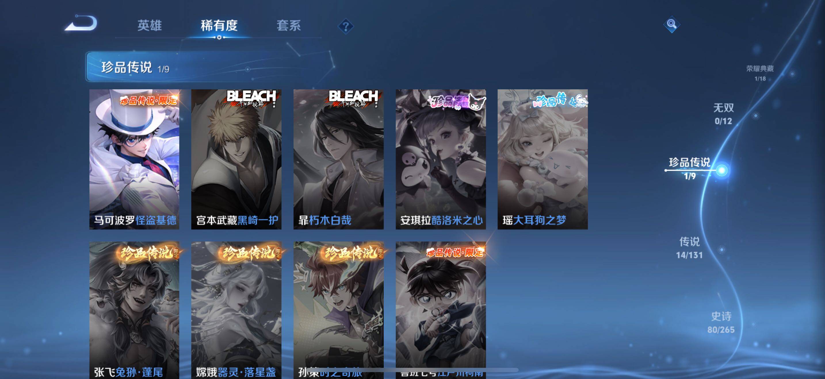 裴擒虎李小龙,上官婉儿梁祝,伽罗天狼溯光者,百里守约朱雀志,孙悟空至尊宝,干将莫邪冰霜恋舞曲,猪八戒猪悟能,孙尚香异界灵契,孙悟空孙行者,韩信傲雪梅枪,李白诗剑行,马可波罗山海·玄木吟,桑启鸣野蒿,妲己愿照·众生和