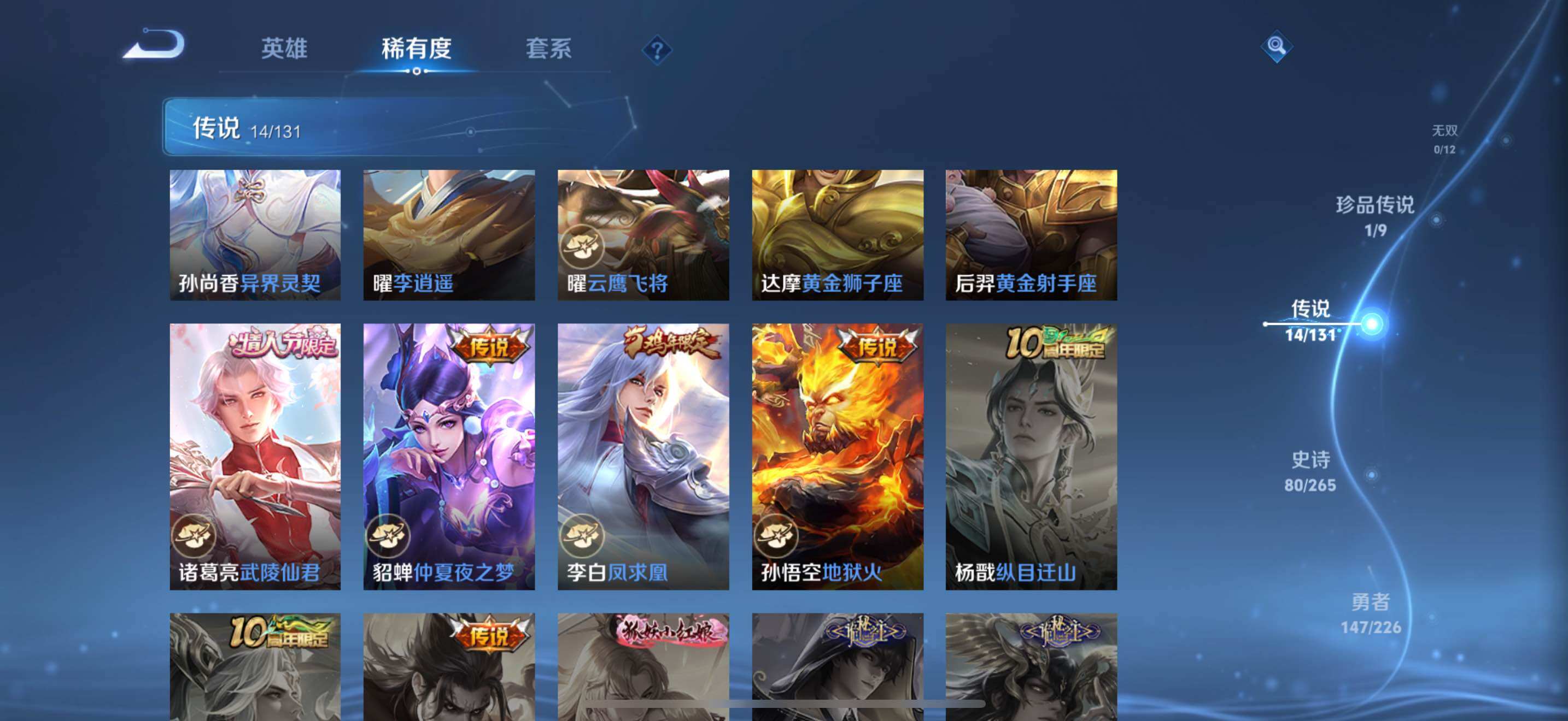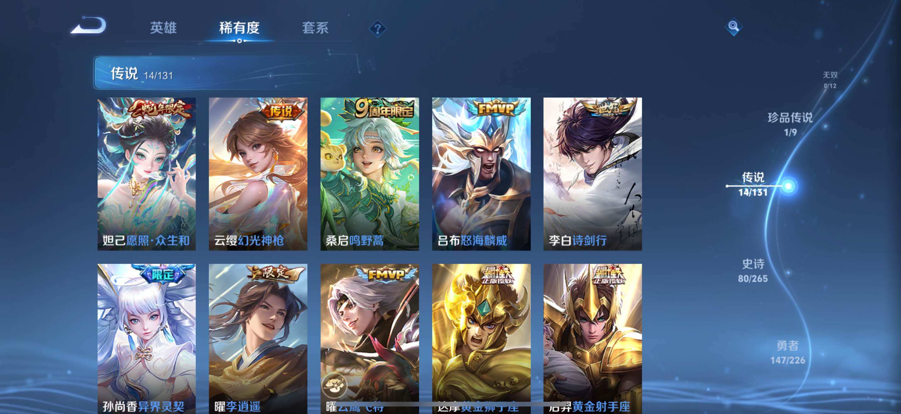 【传说皮肤】:妲己愿照众生和,云缨幻光神枪,桑启鸣野蒿,吕布怒海麟威,李白诗剑行,孙尚香异界灵契,曜李逍遥 ,曜云鹰飞将,达摩黄金狮子座,后羿黄金射手座,诸葛亮武陵仙君,貂蝉仲夏夜之梦,李白凤求凰,孙悟空地狱火