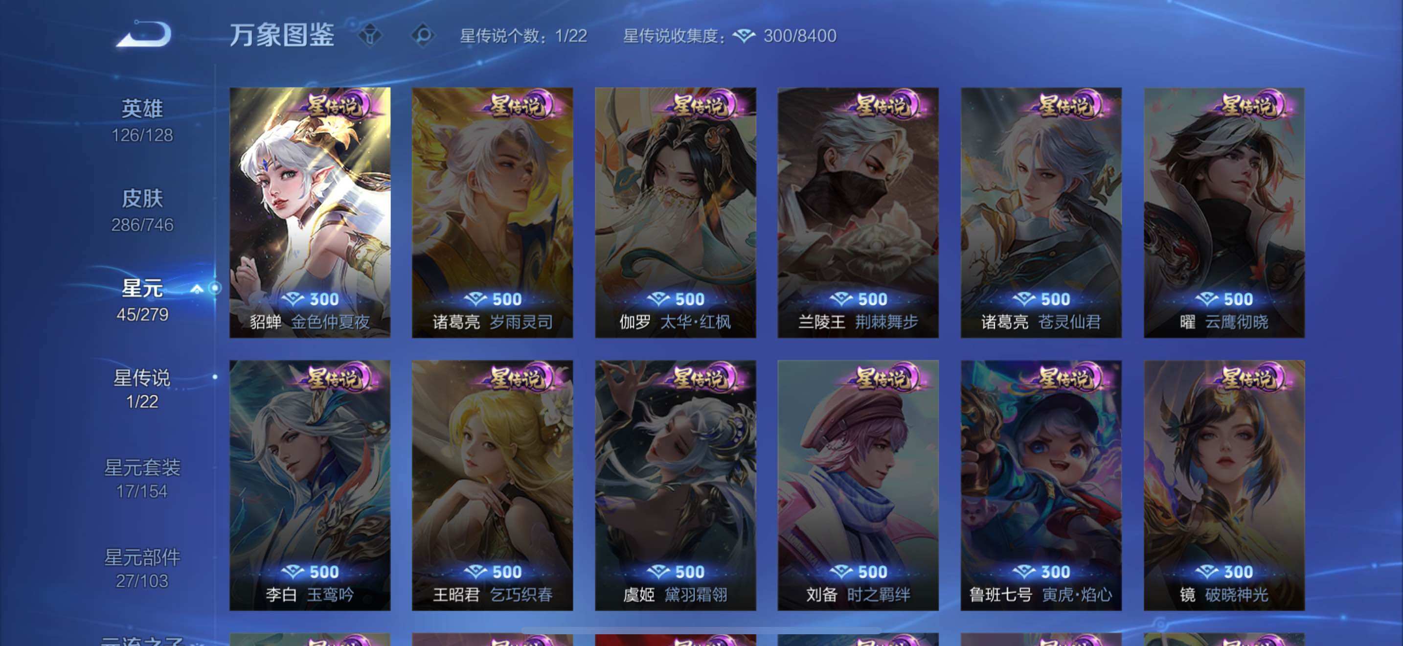 亚瑟狮心王,庄周蜃楼王,孙膑妖精王,扁鹊炼金王,虞姬凯尔特女王,白起狰,太乙真人饕餮,曹操烛龙,芈月重明,典韦穷奇,狂铁御狮,米莱狄御霄,牛魔御旌,盾山御銮,夏侯惇朔风刀,明世隐疑决卦,老夫子醍醐杖,鬼谷子原初探秘者,狄仁杰万华元夜,程咬金演武夺筹,钟馗驱傩正仪,苏烈千军破阵,吕布猎兽之王,嬴政白昼王子,钟馗神迹守卫,鲁班七号狮舞东方,元歌云间偶戏,弈星混沌棋,达摩沙漠行僧,兰陵王金庭之子,沈梦溪大漠名商,李元芳云中旅人,桑启海盐诗旅,裴擒虎擒涛扼浪,鲁班大师探海日志,张良古海寻踪
