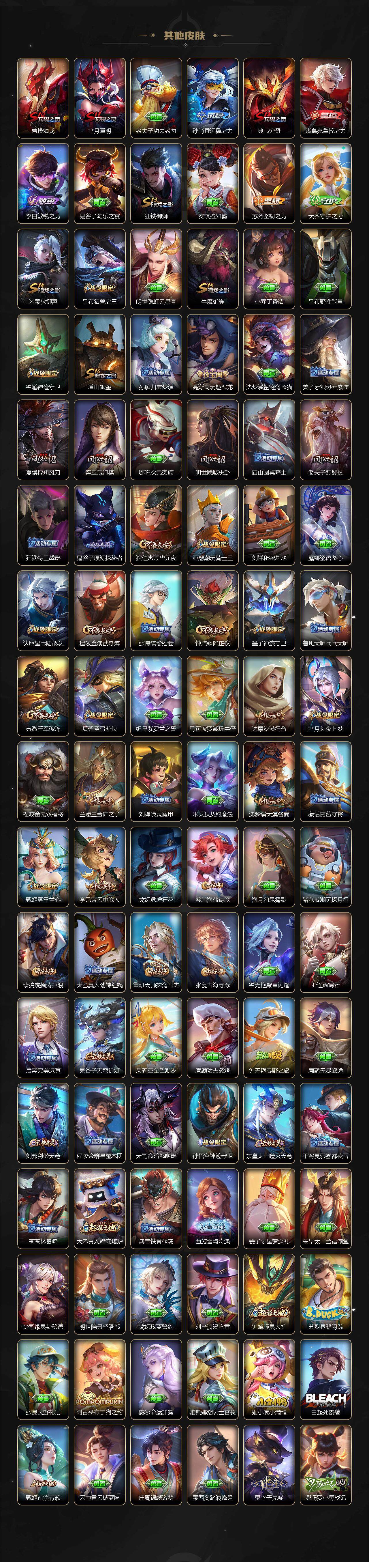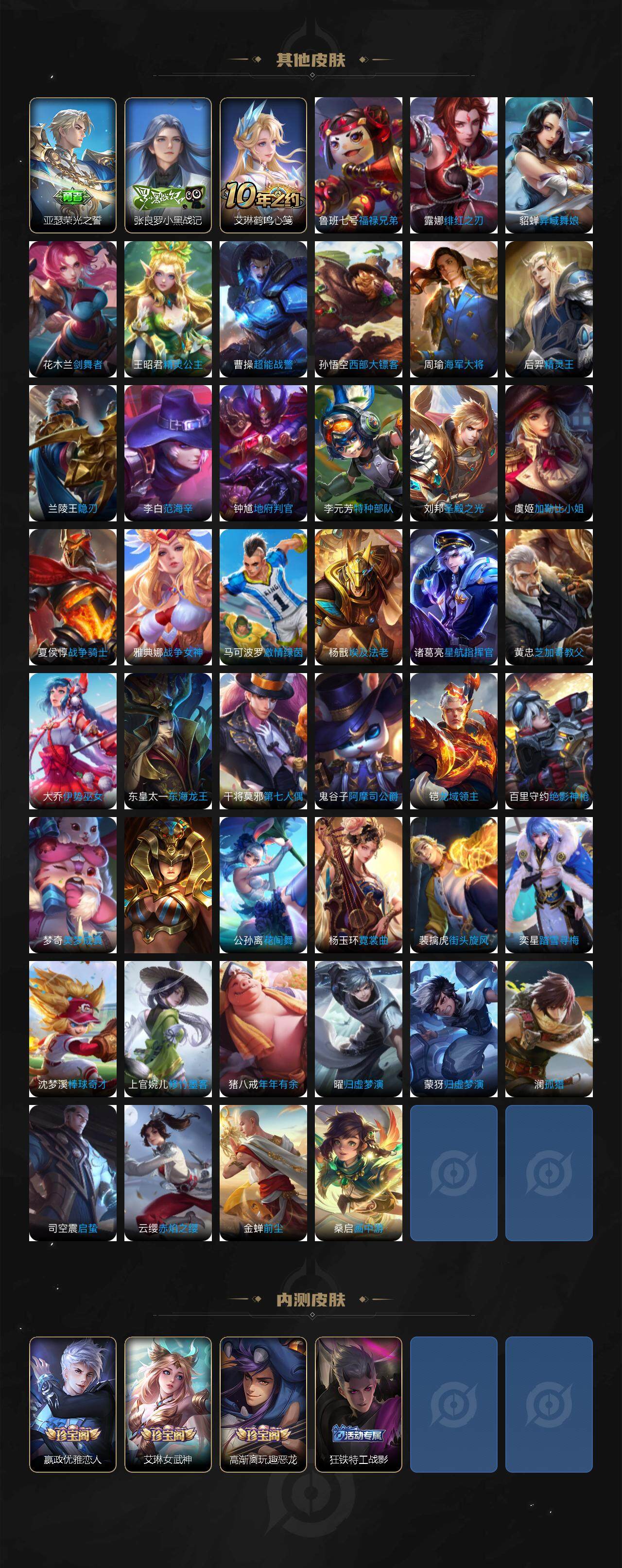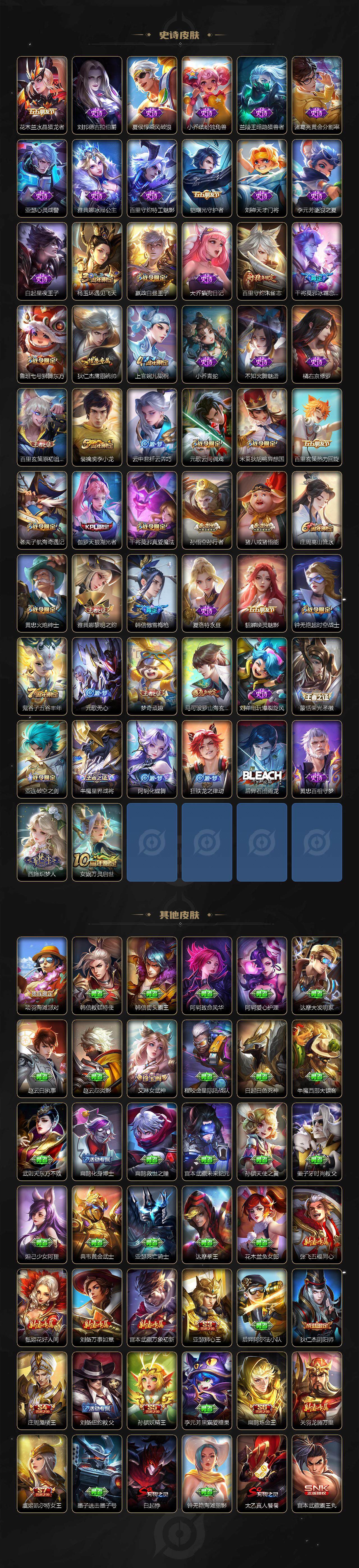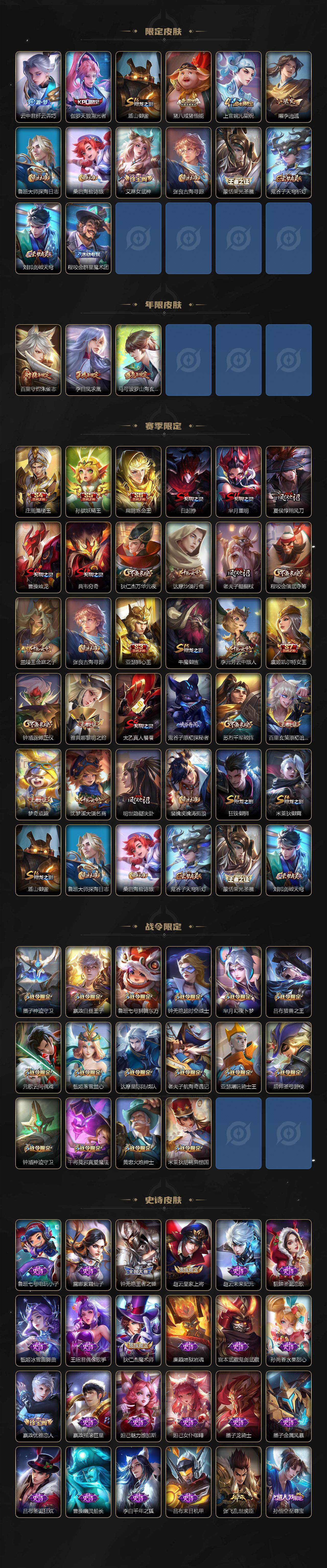 【限定皮肤】:白起狰,狄仁杰阴阳师,虞姬凯尔特女王,赵云皇家上将,墨子神迹守卫,嬴政优雅恋人,嬴政白昼王子,孙尚香异界灵契,鲁班七号狮舞东方,庄周蜃楼王,庄周高山流水,高渐离玩趣恶龙,钟无艳王者之锤,钟无艳超时空战士,孙膑妖精王,扁鹊炼金王,芈月重明,芈月幻夜卜梦,吕布猎兽之王,元歌云间偶戏,元歌无心,夏侯惇朔风刀,甄姬落雪兰心,曹操烛龙,典韦穷奇,马可波罗山海玄木吟,狄仁杰魔术师,狄仁杰万华元夜,达摩星际陆战队,达摩沙漠行僧,项羽海滩派对,老夫子醍醐杖,老夫子航海奇遇记,程咬金演武夺筹,韩信傲雪梅枪,兰陵王金庭之子,亚瑟狮心王,亚瑟潮玩骑士王,孙悟空至尊宝,孙悟空孙行者,牛魔御旌,后羿圣弓游侠,李元芳云中旅人,钟馗神迹守卫,钟馗驱傩正仪,杨玉环遇见飞天,干将莫邪冰霜恋舞曲,干将莫邪真爱魔法,雅典娜黎明之约,太乙真人饕餮,鬼谷子原初探秘者,鬼谷子五谷丰年,诸葛亮武陵仙君,黄忠火炮绅士,苏烈千军破阵,百里玄策原初追逐者,百里守约朱雀志,弈星混沌棋,梦奇顽趣,沈梦溪大漠名商,明世隐疑决卦,裴擒虎李小龙,裴擒虎擒涛扼浪,狂铁御狮,米莱狄御霄,米莱狄胡桃异想国,云中君纤云弄巧,伽罗天狼溯光者,盾山御銮,猪八戒猪悟能,上官婉儿梁祝,曜李逍遥 ,鲁班大师探海日志,桑启海盐诗旅,艾琳女武神,张良古海寻踪,蒙恬荣光圣徽,鬼谷子天穹祈灯,刘邦剑破天穹,程咬金群星魔术团