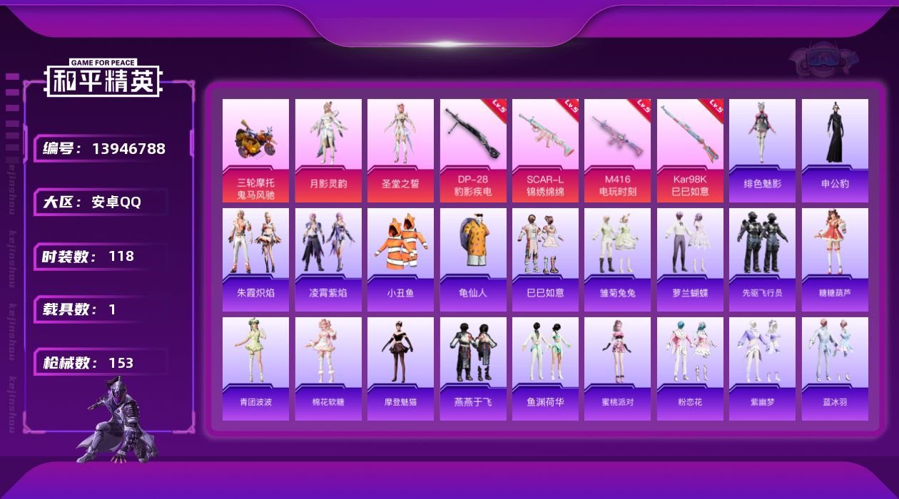 - PX_2061775- 苹果手Q-12王牌印记-1粉装-7特效枪-0载具-43847热力值-79套装-145枪皮-2卓越印记-1传奇印记 【1粉装】,萨利娅 【7特效枪】SCAR-L-纯梦嫁纱-4级 M416-电玩时刻-5级 M416-心之恋语-6级 M762-电糖天使-5级 Kar98K-巳巳如意-5级 AMR-智耀战神-4级 Mk14-甜梦熊击-5级 【1稀有紫装】,龟仙人, 【79稀有时装
