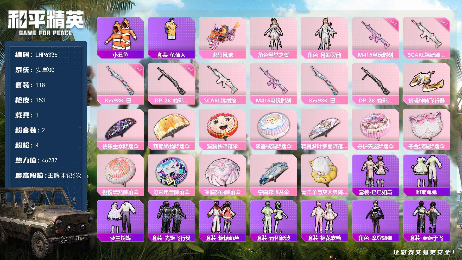 [13946788]【店主推荐捡漏号!可直接换绑】地铁满天赋 安卓 手Q-2粉装-4特效枪-1载具-1粉色飞行器-4.6w热力值-6王牌印记-118套装-153枪皮【热门品类】:套装-小丑鱼,套装-龟仙人【粉色载具】:鬼马风驰【粉色套装】:角色-圣堂之誓,角色-月影灵韵【粉色枪皮等级】:SCAR-L-锦绣绵绵(五级),M416-电玩时刻(五级),Kar98K-巳巳如意(五级),DP-28-豹影疾电(五级)【粉色飞行器】:拂晓神骑飞行器