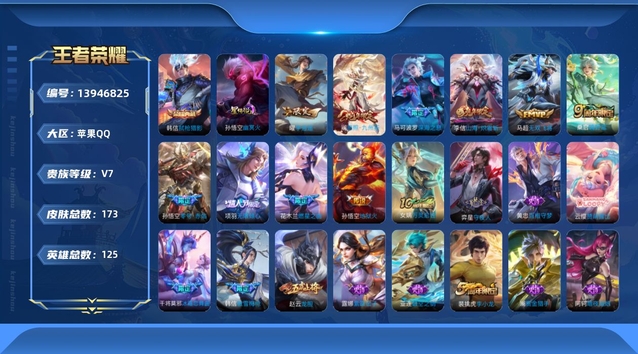 [13946825]【店主推荐捡漏号!可直接换绑】苹果Q-V7-最强王者段位-31段打野金标云缨-125英雄-173皮肤-1典藏-1星元-10传说-46史诗
