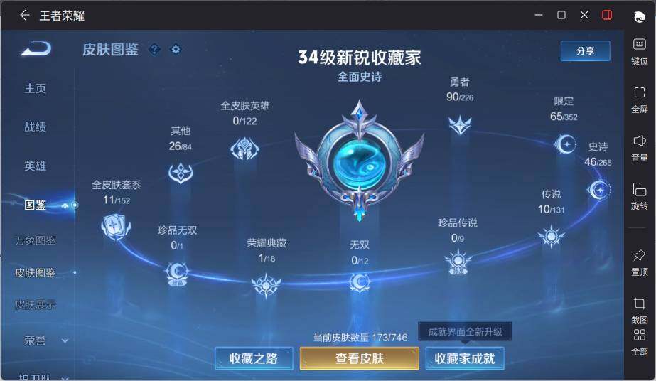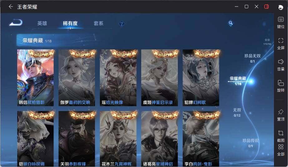 - [12667607]安卓Q-V4-最强王者段位-123英雄-111皮肤-1典藏-0珍品无双-0无双-0珍品传说-0传说-19史诗 【荣耀典藏】:孙尚香杀手不太冷 【限定皮肤】:白起狰,狄仁杰阴阳师,钟无艳王者之锤,芈月重明,夏侯惇朔风刀,曹操烛龙,典韦穷奇,典韦岱宗,狄仁杰万华元夜,达摩沙漠行僧,项羽海滩派对,老夫子醍醐杖,程咬金演武夺筹,兰陵王金庭之子,牛魔御旌,李元芳银河之约,钟馗驱傩正仪,太乙真人饕餮,鬼谷子原初探秘者,弈星混沌棋,沈梦溪星空之诺,沈梦溪大漠名商,明世隐疑决卦,裴擒虎李小龙,裴擒虎擒涛扼浪,狂铁御狮,米莱狄御霄,盾山御銮,鲁班大师探海日志,阿古朵江河有灵,张良古海寻踪 【年限皮肤】:典韦岱宗 【赛季限定】:白起狰,芈月重明,夏侯惇朔风刀,曹操烛龙,典韦穷奇,狄仁杰万华元夜,达摩沙漠行僧,老夫子醍醐杖,程咬金演武夺筹,兰陵王金庭之子,张良古海寻踪,牛魔御旌,钟馗驱傩正仪,太乙真人饕餮,鬼谷子原初探秘者,弈星混沌棋,沈梦溪大漠名商,明世隐疑决卦,裴擒虎擒涛扼浪,狂铁御狮,米莱狄御霄,盾山御銮,鲁班大师探海日志 【战令限定】:李元芳银河之约,沈梦溪星空之诺 【史诗皮肤】:钟无艳王者之锤,赵云未来纪元,甄姬冰雪圆舞曲,孙尚香水果甜心,嬴政摇滚巨星,妲己魅力维加斯,墨子金属风暴,张飞乱世虎臣,夏侯惇乘风破浪,小乔缤纷独角兽,百里守约特工魅影,李元芳逐浪之夏,狄仁杰鹰眼统帅,李元芳银河之约,典韦岱宗,裴擒虎李小龙,阿古朵江河有灵,狂铁龙之律动,后羿石田雨龙 【其他皮肤】:项羽海滩派对,韩信教廷特使,韩信街头霸王,露娜哥特玫瑰,达摩大发明家,扁鹊化身博士,安琪拉玩偶对对碰,妲己少女阿狸,亚瑟死亡骑士,达摩拳王,花木兰兔女郎,甄姬花好人间,刘备万事如意,宫本武藏万象初新,狄仁杰阴阳师,关羽龙腾万里,白起狰,钟无艳海滩丽影,太乙真人饕餮,曹操烛龙,芈月重明,老夫子功夫老勺,典韦穷奇,李白敏锐之力,狂铁御狮,大乔守护之力,米莱狄御霄,明世隐虹云星官,牛魔御旌,盾山御銮,沈梦溪鲨炮海盗猫,夏侯惇朔风刀,沈梦溪星空之诺,弈星混沌棋,哪吒次元突破,明世隐疑决卦,盾山圆桌骑士,老夫子醍醐杖,狂铁特工战影,鬼谷子原初探秘者,狄仁杰万华元夜,程咬金演武夺筹,盘古重装意志,钟馗驱傩正仪,鲁班大师乓乓大师,典韦铁甲之心,达摩沙漠行僧,兰陵王金庭之子,沈梦溪大漠名商,裴擒虎擒涛扼浪,鲁班大师探海日志