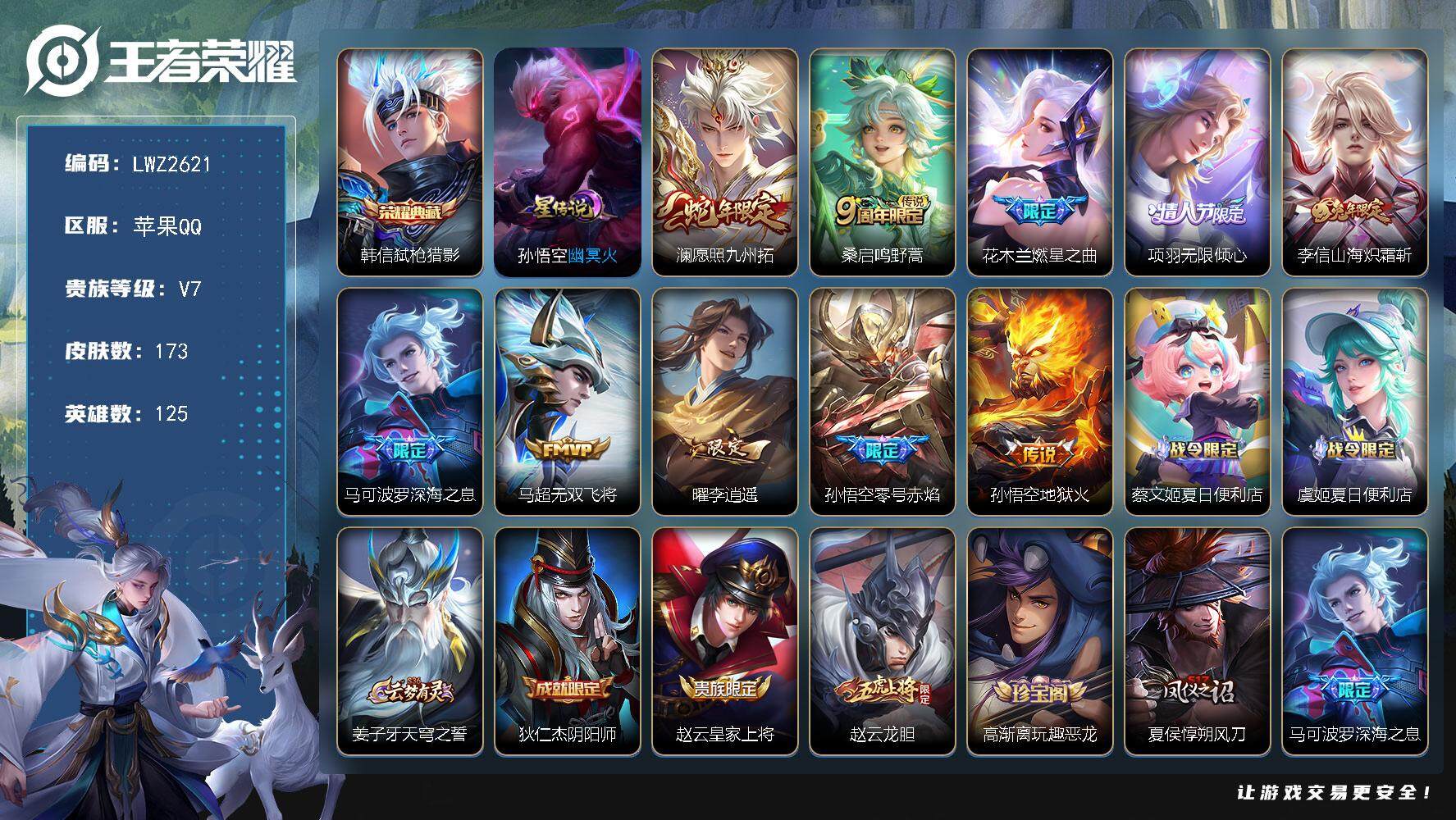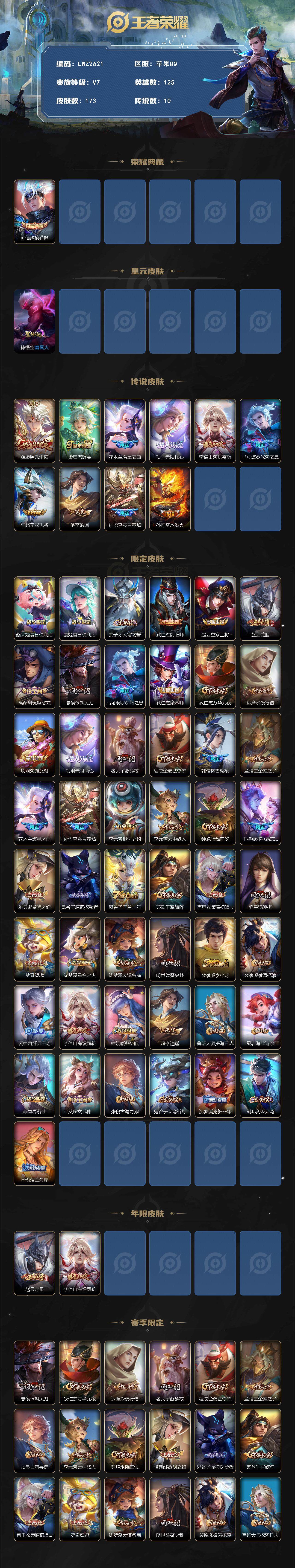 [13946825]【店主推荐捡漏号!可直接换绑】苹果Q-V7-最强王者段位-31段打野金标云缨-125英雄-173皮肤-1典藏-1星元-10传说-46史诗 【荣耀典藏】:韩信弑枪猎影 【传说皮肤】:澜愿照九州拓,桑启鸣野蒿,花木兰燃星之曲,项羽无限倾心,李信山海炽霜斩,马可波罗深海之息,马超无双飞将,曜李逍遥 ,孙悟空零号赤焰,孙悟空地狱火 【限定皮肤】:蔡文姬夏日便利店,虞姬夏日便利店,姜子牙天穹之誓,狄仁杰阴阳师,赵云皇家上将,赵云龙胆,高渐离玩趣恶龙,夏侯惇朔风刀,马可波罗深海之息,狄仁杰魔术师,狄仁杰万华元夜,达摩沙漠行僧,项羽海滩派对,项羽无限倾心,老夫子醍醐杖,程咬金演武夺筹,韩信傲雪梅枪,兰陵王金庭之子,花木兰燃星之曲,孙悟空零号赤焰,李元芳银河之约,李元芳云中旅人,钟馗驱傩正仪,干将莫邪冰霜恋舞曲,雅典娜黎明之约,鬼谷子原初探秘者,鬼谷子五谷丰年,苏烈千军破阵,百里玄策原初追逐者,弈星混沌棋,梦奇顽趣,沈梦溪星空之诺,沈梦溪大漠名商,明世隐疑决卦,裴擒虎李小龙,裴擒虎擒涛扼浪,云中君纤云弄巧,李信山海炽霜斩,嫦娥暖冬兔眠,曜李逍遥 ,鲁班大师探海日志,桑启海盐诗旅,暃星界游侠,艾琳女武神,张良古海寻踪,鬼谷子天穹祈灯,沈梦溪龙舞盛年,刘邦剑破天穹,周瑜熔金海岸 【年限皮肤】:赵云龙胆,李信山海炽霜斩 【赛季限定】:夏侯惇朔风刀,狄仁杰万华元夜,达摩沙漠行僧,老夫子醍醐杖,程咬金演武夺筹,兰陵王金庭之子,张良古海寻踪,李元芳云中旅人,钟馗驱傩正仪,雅典娜黎明之约,鬼谷子原初探秘者,苏烈千军破阵,百里玄策原初追逐者,弈星混沌棋,梦奇顽趣,沈梦溪大漠名商,明世隐疑决卦,裴擒虎擒涛扼浪,鲁班大师探海日志,桑启海盐诗旅,鬼谷子天穹祈灯,刘邦剑破天穹,姜子牙天穹之誓 【战令限定】:蔡文姬夏日便利店,虞姬夏日便利店,李元芳银河之约,沈梦溪星空之诺,嫦娥暖冬兔眠,暃星界游侠 【史诗皮肤】:露娜紫霞仙子,阿轲暗夜猫娘,赵云皇家上将,赵云未来纪元,貂蝉圣诞恋歌,王昭君偶像歌手,狄仁杰魔术师,廉颇地狱岩魂,宫本武藏鬼剑武藏,孙尚香水果甜心,嬴政摇滚巨星,妲己魅力维加斯,墨子金属风暴,曹操幽灵船长,李白千年之狐,吕布末日机甲,张飞乱世虎臣,夏侯惇乘风破浪,小乔缤纷独角兽,诸葛亮黄金分割率,亚瑟心灵战警,雅典娜冰冠公主,安琪拉心灵骇客,百里守约特工魅影,李元芳逐浪之夏,干将莫邪冰霜恋舞曲,狄