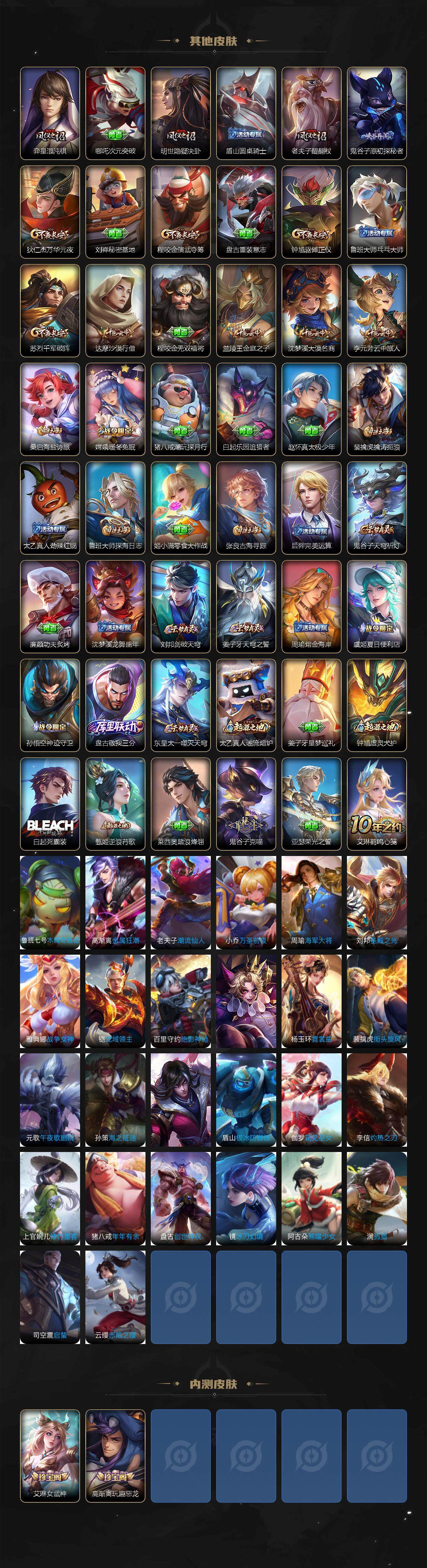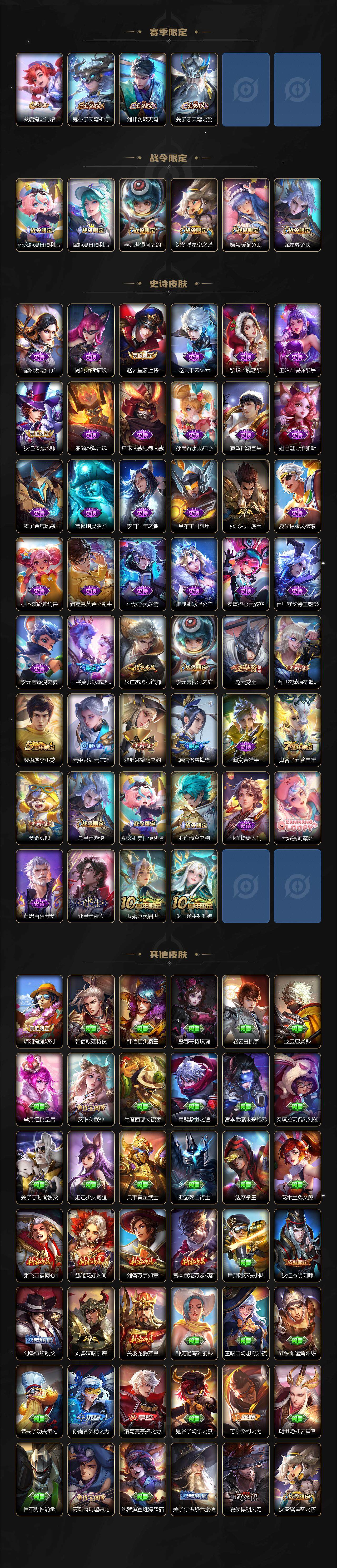 【限定皮肤】:蔡文姬夏日便利店,虞姬夏日便利店,姜子牙天穹之誓,狄仁杰阴阳师,赵云皇家上将,赵云龙胆,高渐离玩趣恶龙,夏侯惇朔风刀,马可波罗深海之息,狄仁杰魔术师,狄仁杰万华元夜,达摩沙漠行僧,项羽海滩派对,项羽无限倾心,老夫子醍醐杖,程咬金演武夺筹,韩信傲雪梅枪,兰陵王金庭之子,花木兰燃星之曲,孙悟空零号赤焰,李元芳银河之约,李元芳云中旅人,钟馗驱傩正仪,干将莫邪冰霜恋舞曲,雅典娜黎明之约,鬼谷子原初探秘者,鬼谷子五谷丰年,苏烈千军破阵,百里玄策原初追逐者,弈星混沌棋,梦奇顽趣,沈梦溪星空之诺,沈梦溪大漠名商,明世隐疑决卦,裴擒虎李小龙,裴擒虎擒涛扼浪,云中君纤云弄巧,李信山海炽霜斩,嫦娥暖冬兔眠,曜李逍遥 ,鲁班大师探海日志,桑启海盐诗旅,暃星界游侠,艾琳女武神,张良古海寻踪,鬼谷子天穹祈灯,沈梦溪龙舞盛年,刘邦剑破天穹,周瑜熔金海岸