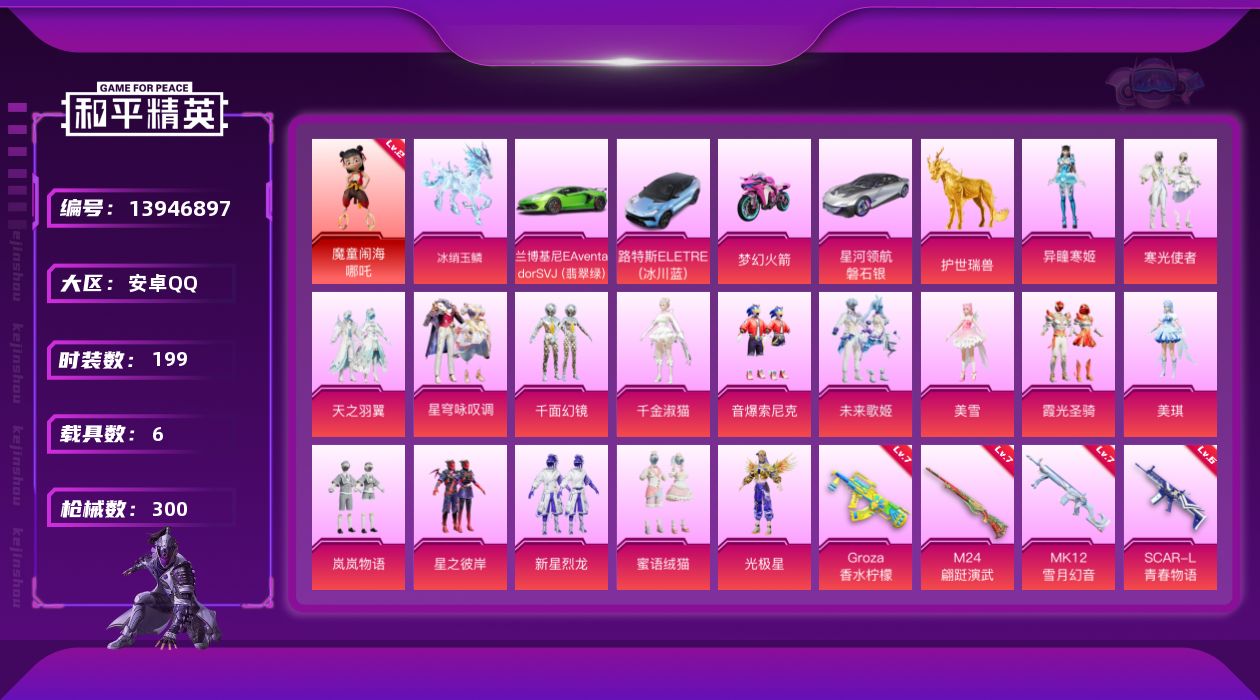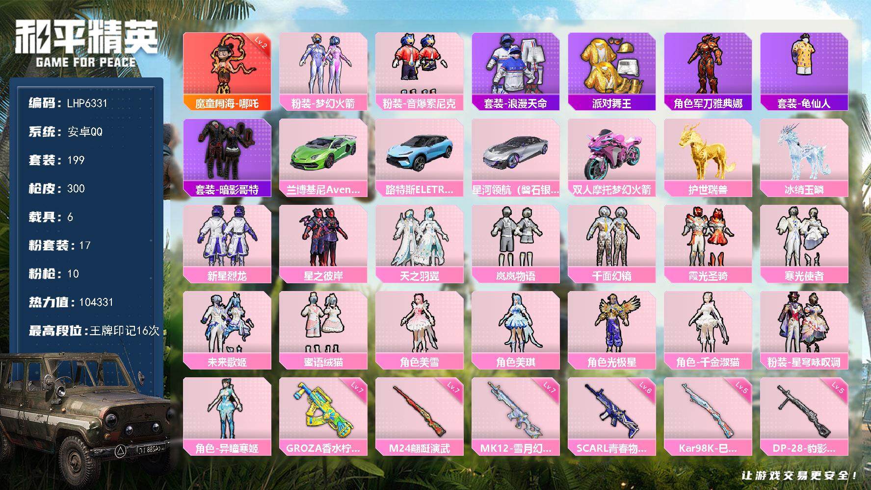 [13946897]可二次【店主推荐捡漏号!可直接换绑】/地铁满天赋 安卓 手Q-1神装-17粉装-10特效枪-6载具-8粉色飞行器-10.4w热力值-16王牌印记-199套装-300枪皮【红色神装等级】:魔童闹海-哪吒(二级)【热门品类】:粉装-梦幻火箭,粉装-音爆索尼克,套装-浪漫天命,套装-派对舞王,角色-军刀雅典娜,套装-龟仙人,套装-暗影哥特【粉色载具】:兰博基尼Aventador SVJ(翡翠绿),路特斯ELETRE(冰川蓝),星河领航(磐石银),双人摩托-梦幻火箭,护世瑞兽,冰绡玉鳞【粉色套装】:粉装-梦幻火箭,粉装-新星烈龙,粉装-星之彼岸,粉装-天之羽翼,粉装-岚岚物语,粉装-千面幻镜,粉装-霞光圣骑,粉装-寒光使者,粉装-音爆索尼克,粉装-未来歌姬,粉装-蜜语绒猫,角色-美雪,角色-美琪,角色-光极星,角色-千金淑猫,粉装-星穹咏叹调,角色-异瞳寒姬【粉色枪皮等级】:SCAR-L-青春物语(六级),SCAR-L-魔童闹海 哪吒(三级),GROZA-香水柠檬(七级),P90-魔童闹海 敖丙(三级),Kar98K-巳巳如意(五级),M24-翩跹演武(七级),MK12-雪月幻音(七级),DP-28-豹影疾电(五级),MG-36-沧焰双生(五级),平底锅-喜羊羊与灰太狼(二级)【粉色飞行器】:梦幻火箭飞行器,星夜魔法师飞行翼,万象金身飞行器,飞天猪飞行器,灵珠游龙飞行器