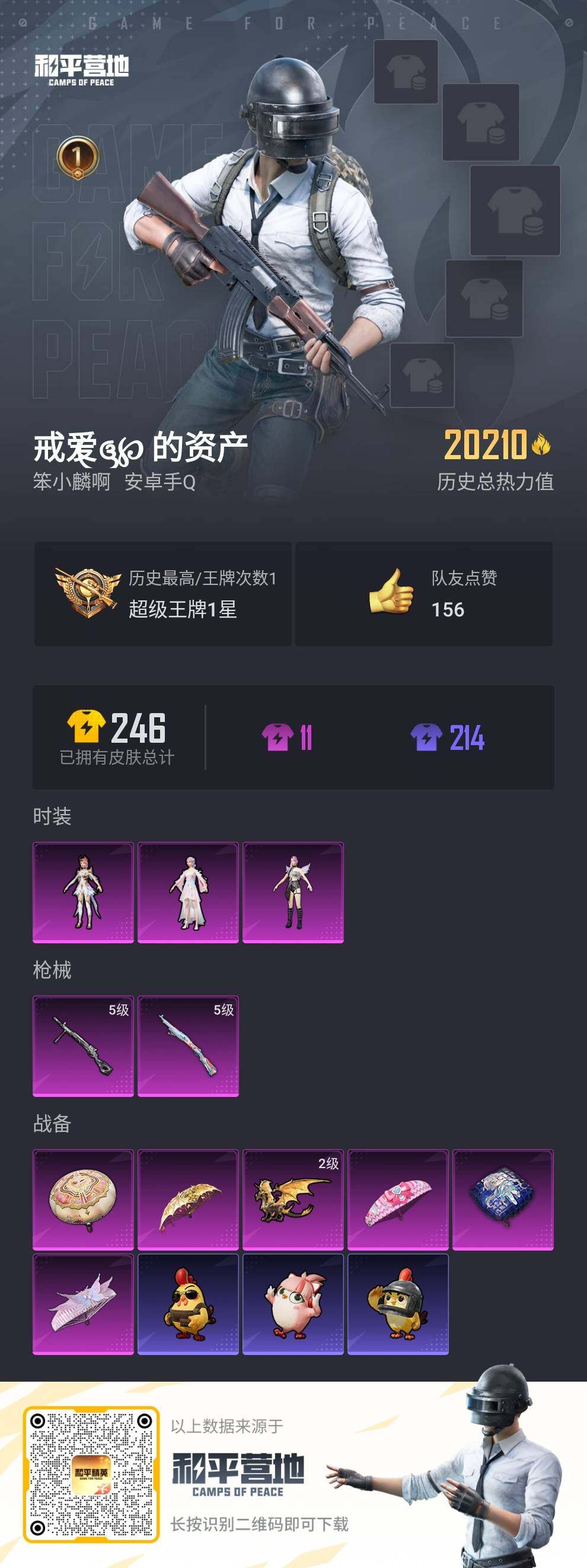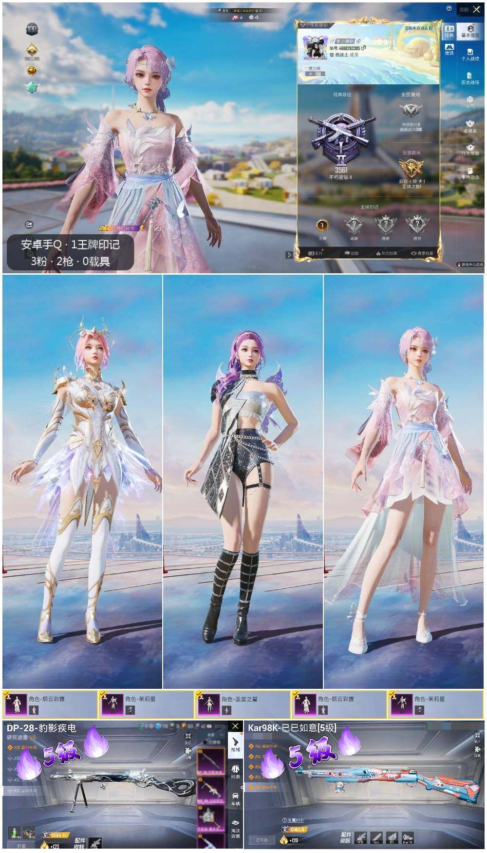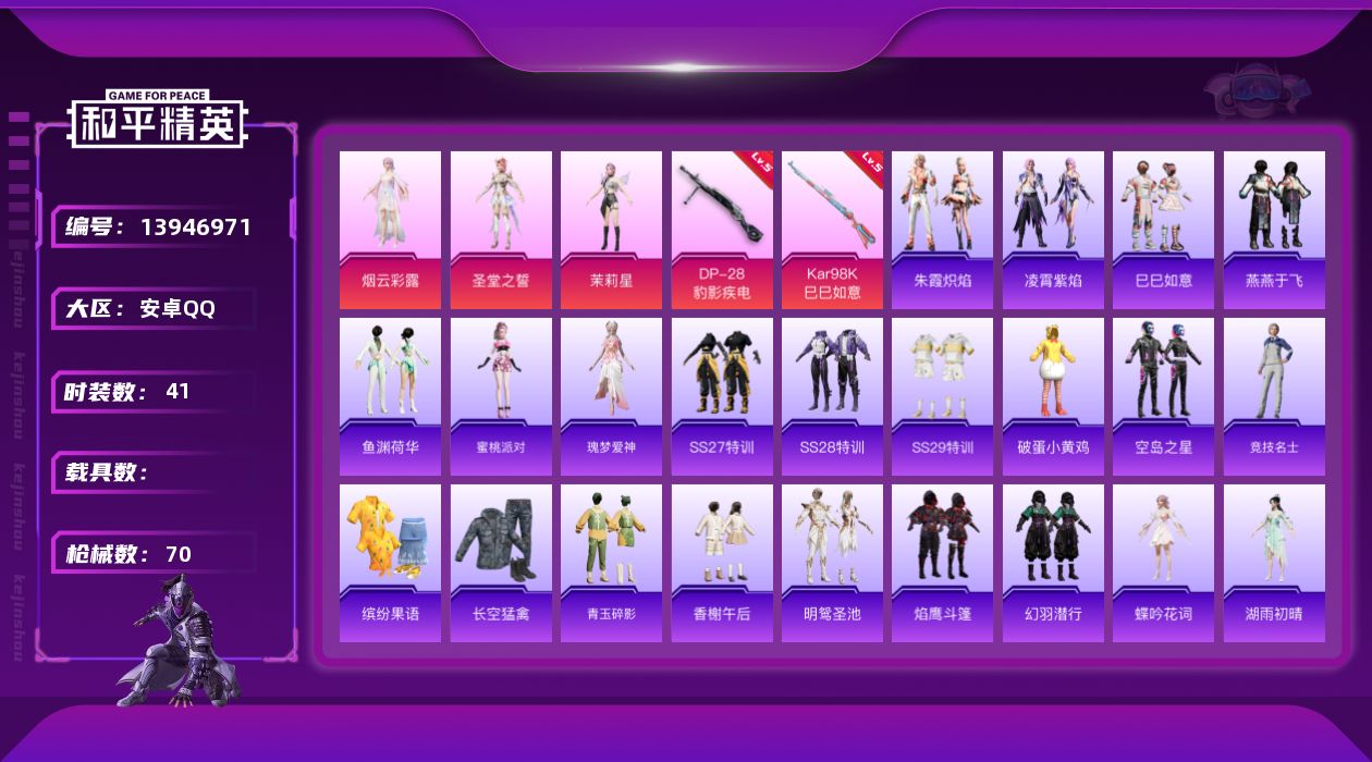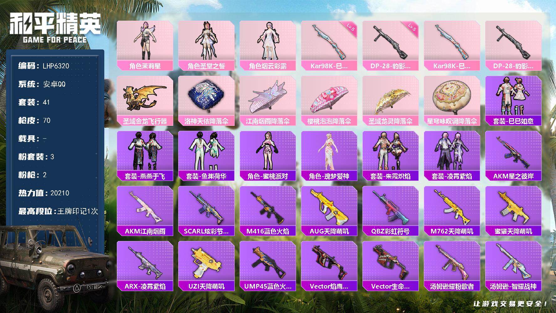 [13946971]【店主推荐捡漏号!可直接换绑】 安卓 手Q-3粉装-2特效枪-1粉色飞行器-2w热力值-1王牌印记-41套装-70枪皮【粉色套装】:角色-茉莉星,角色-圣堂之誓,角色-烟云彩露【粉色枪皮等级】:Kar98K-巳巳如意(五级),DP-28-豹影疾电(五级)【粉色飞行器】:圣域金龙飞行器