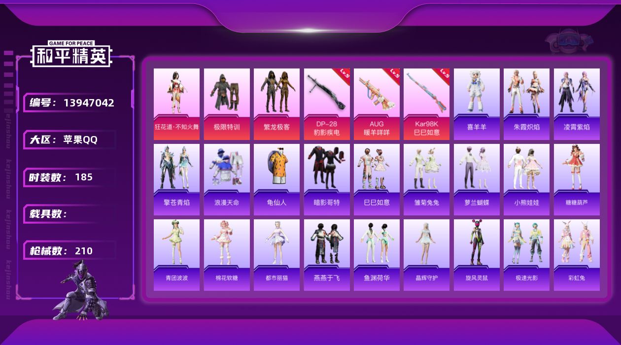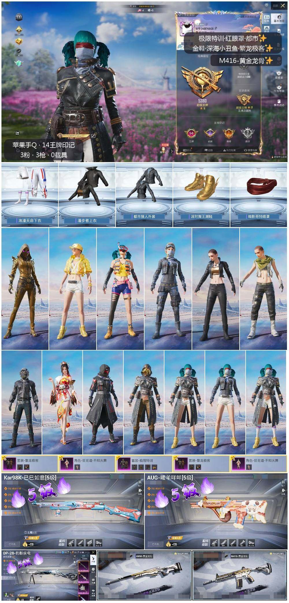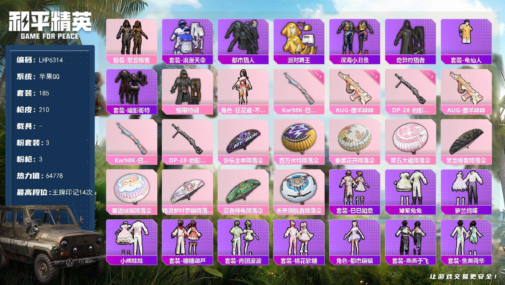 [13947042]可二次【店主推荐捡漏号!可直接换绑】/地铁满天赋 苹果 手Q-3粉装-3特效枪-0载具-1粉色飞行器-6.4w热力值-14王牌印记-185套装-210枪皮 【热门品类】:粉装-繁龙极客,套装-浪漫天命,套装-都市猎人,套装-派对舞王,套装-深海小丑鱼,套装-奇异狩猎者,套装-龟仙人,套装-暗影哥特【粉色套装】:粉装-极限特训,粉装-繁龙极客,角色-狂花道·不知火舞【粉色枪皮等级】:AUG-暖羊咩咩(五级),Kar98K-巳巳如意(五级),DP-28-豹影疾电(五级)