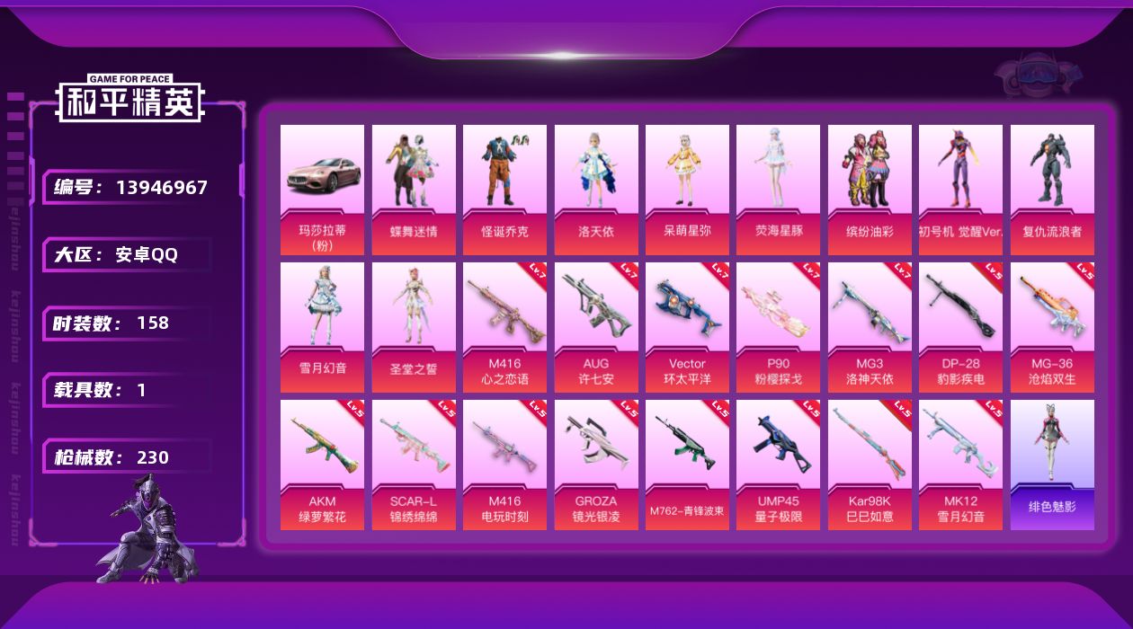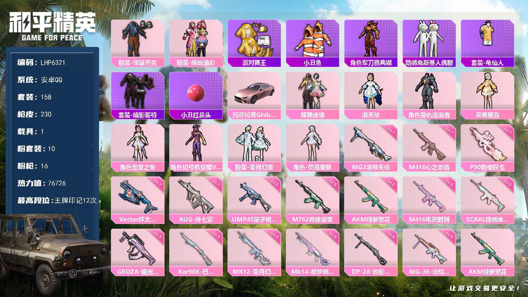 [13946967]【店主推荐捡漏号!可直接换绑】/素材身法号/地铁满天赋 安卓 手Q-10粉装-16特效枪-1载具-3粉色飞行器-7.6w热力值-12王牌印记-158套装-230枪皮【热门品类】:粉装-怪诞乔克,粉装-缤纷油彩,套装-派对舞王,套装-小丑鱼,角色-军刀雅典娜,套装-动感兔斯基人偶服,套装-龟仙人,套装-暗影哥特,小丑红鼻头【粉色载具】:玛莎拉蒂Ghibli(粉)【粉色套装】:粉装-怪诞乔克,粉装-蝶舞迷情,粉装-缤纷油彩,角色-洛天依,角色-复仇流浪者,角色-呆萌星弥,角色-圣堂之誓,角色-初号机 觉醒Ver.,粉装-雪月幻音,角色-荧海星豚【粉色枪皮等级】:AKM-绿萝繁花(五级),SCAR-L-锦绣绵绵(五级),M416-心之恋语(七级),M416-电玩时刻(五级),GROZA-镜光银凌(五级),AUG-许七安(七级),M762-青锋波束(五级),UMP45-量子极限(五级),Vector-环太平洋(七级),P90-粉樱探戈(七级),Kar98K-巳巳如意(五级),Mk14-甜梦熊击(五级),MK12-雪月幻音(五级),DP-28-豹影疾电(五级),MG3-洛神天依(七级),MG-36-沧焰双生(五级)【粉色飞行器】:春暖花开飞行器