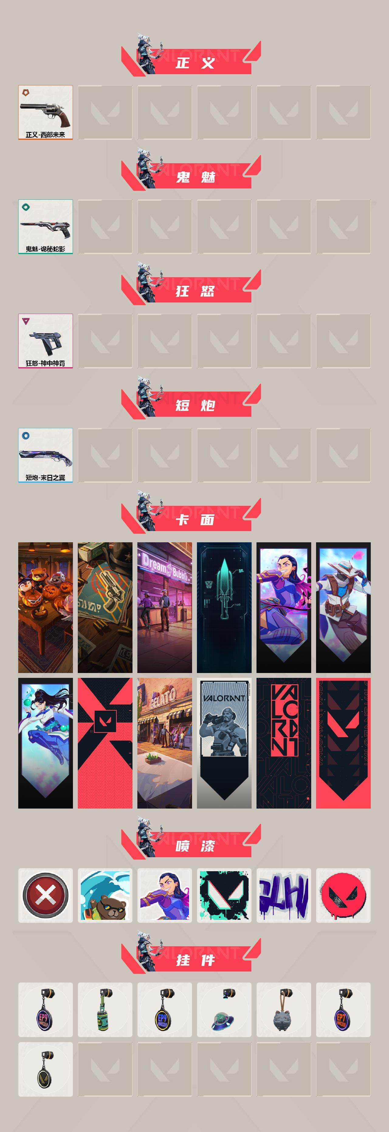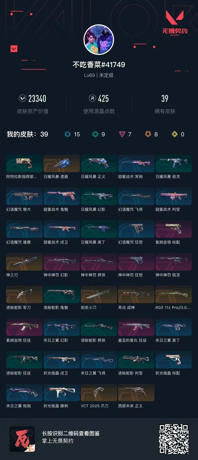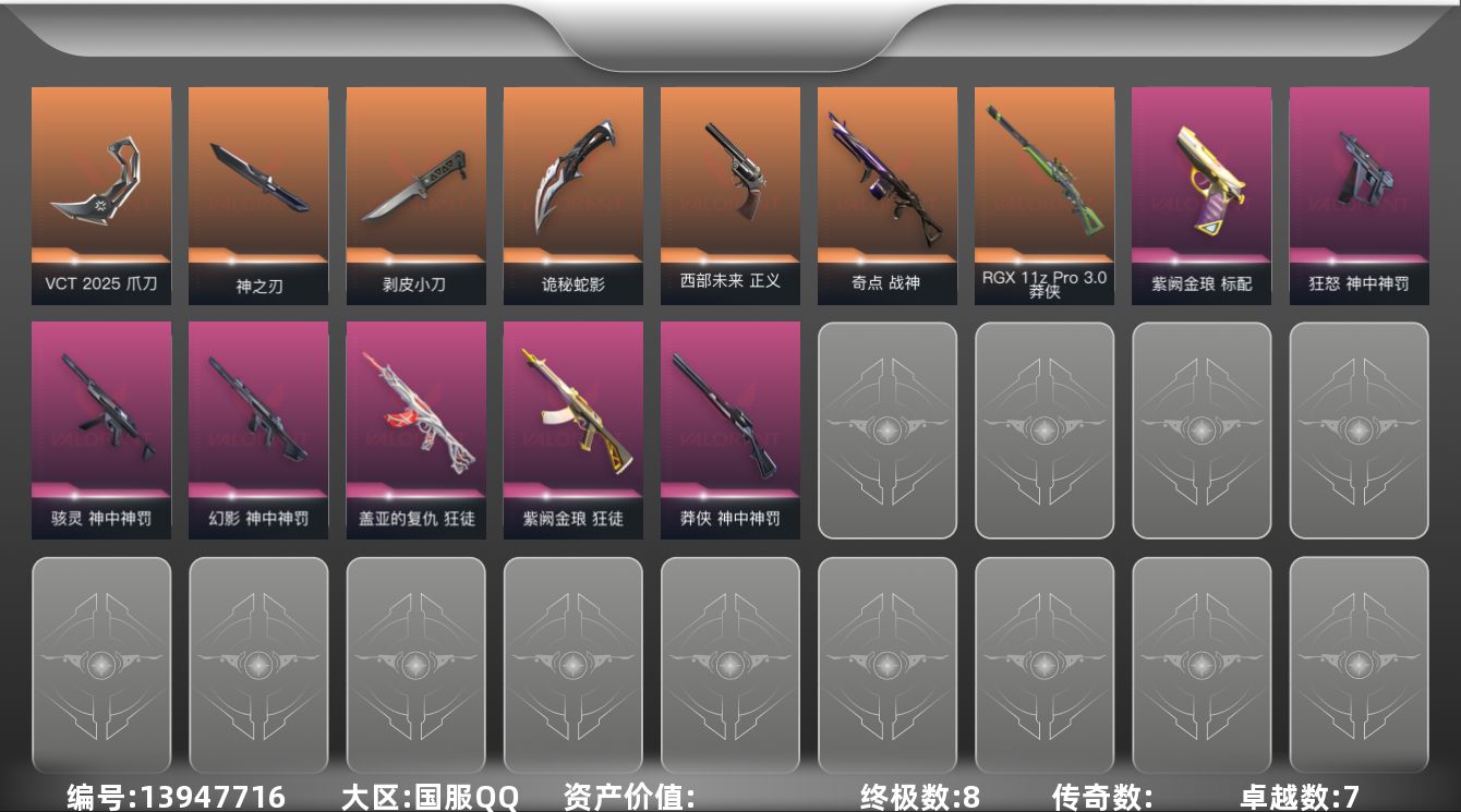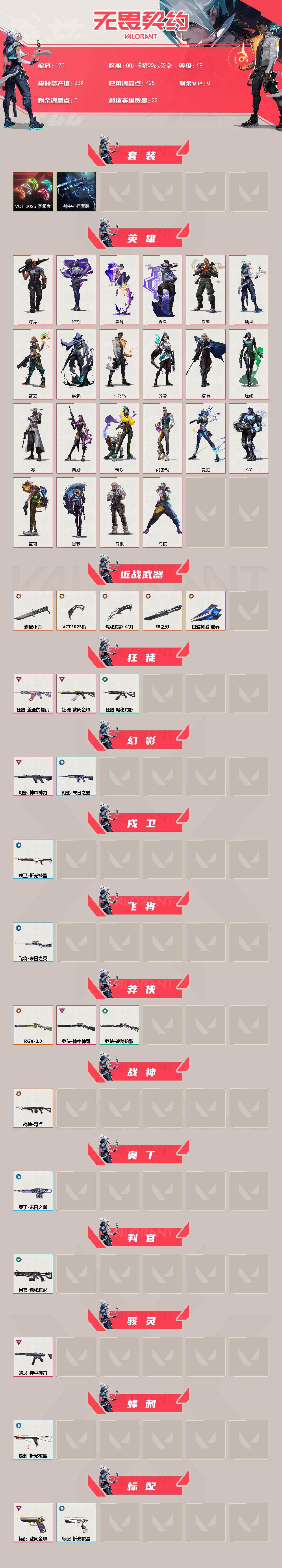 [13947716]【套装】:VCT 2025 赛季套装,神中神罚套装 【英雄】:幻棱,炼狱,维斯,暮蝶,壹决,铁臂,捷风,雷兹,幽影,不死鸟,贤者,猎枭,蝰蛇,零,芮娜,奇乐,尚勃勒,霓虹,K/O,盖可,黑梦,钢锁 【近战 武器】:近战武器-神之刃,近战武器-剥皮小刀,近战武器-VCT 2025 爪刀,近战武器-诡秘蛇影 军刀,近战武器-日耀风暴 遗器 【狂徒】:狂徒-盖亚的复仇,狂徒-紫阙金琅,狂徒-诡秘蛇影 【幻影】:幻影-神中神罚,幻影-末日之翼 【戍卫】:戍卫-折光棱晶 【飞将】:飞将-末日之翼 【莽侠】:莽侠-RGX 11z Pro//3.0,莽侠-神中神罚,莽侠-诡秘蛇影 【战神】:战神-奇点 【奥丁】:奥丁-末日之翼 【判官】:判官-诡秘蛇影 【骇灵】:骇灵-神中神罚 【蜂刺】:蜂刺-折光棱晶 【标配】:标配-紫阙金琅,标配-折光棱晶 【正义】:正义-西部未来 【鬼魅】:鬼魅-诡秘蛇影 【狂怒】:狂怒-神中神罚 【短炮】:短炮-末日之翼 【卡面】:南瓜盛典 卡面,正义的化身 卡面,梦幻奶茶 卡面,零点嗅探设计图 卡面,无畏契约GO!第一卷:芮娜 卡面,无畏契约GO!第一卷:零 卡面,无畏契约GO!第一卷:贤者 卡面,代号红色 卡面,冰淇淋店 卡面,新兵报到 卡面,V契约 卡面,无畏契约 卡面 【喷漆】:买装还是存钱 喷漆,酷熊冲浪 喷漆,无畏契约GO!第一卷:芮娜 喷漆,胜利属于无畏契约 喷漆,GLHF 喷漆,无畏契约 喷漆 【挂饰】:第九季//第二幕 纪念币 挂饰,Z世代特饮 挂饰,第九季//第一幕 纪念币 挂饰,天外飞客 挂饰,《双城之战》魄罗 挂饰,第七季//第二幕 纪念币 挂饰,无畏契约 纪念币 挂饰