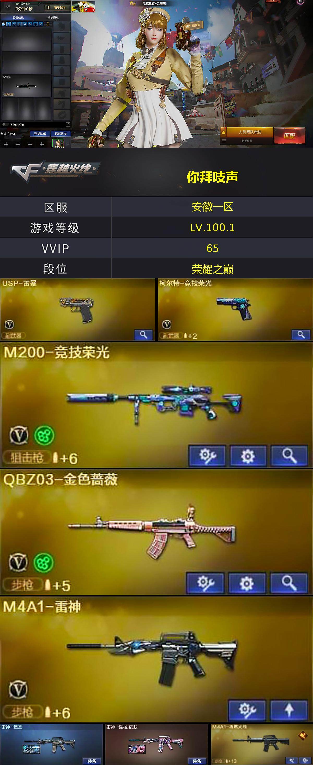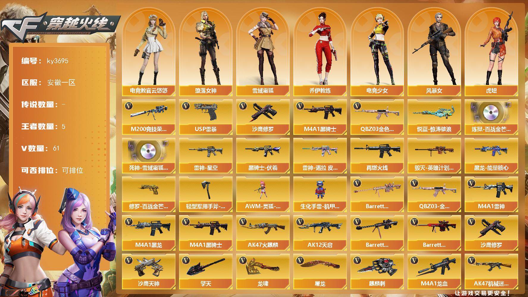 [13949289]安徽一区-61V-5王者-0炫金 【热门武器】:QBZ03-金色蔷薇,M200-竞技荣光,M4A1-黑骑士,USP-雷暴,沙鹰-修罗*2 【王者炫金武器】:悦蓝-惊涛骇浪 【音效卡】:炼狱-百战金芒-庆典舞曲音效卡,死神-雪域霜狐-怀旧音效卡 【皮肤】:雷神-星空,雷神-诺拉 皮肤,M4A1-再燃火线,毁灭-英雄计划 皮肤,黑龙-能量核心,黑骑士-伏羲,修罗-百战金芒 皮肤,轻型军用手斧-再燃火线 【角色】:电竞教官-云悠悠,堕落女神,雪域霜狐,乔伊教练,电竞少女,风暴女,虎妞,嘉年华灵狐,疾风,0号玩家,龙儿,麻雀,潘多拉-甜心教官,雪莉杨-摸金校尉 【人偶武器】:AWM-灵狐-15周年嘉年华,生化手雷-机甲核心 【英雄级武器】:AK47-火麒麟*3,M4A1-黑龙,M4A1-雷神,M4A1-黑骑士,AK12-天启*2,AK47-机械迷城,AK47-黑鲨*3,M4A1-龙血*3,黑武士-锦绣游龙,死神-雪域霜狐,QBZ03-金色蔷薇,王者之心-觉醒版,王者之翼-觉醒版,Barrett-毁灭*2,Barrett-极光,M200-竞技荣光,Barrett-金色蔷薇,炼狱-百战金芒,沙鹰-修罗*2,沙鹰-天神*4,USP-雷暴,柯尔特-竞技荣光,屠龙,龙啸*3,擎天,麒麟刺*5,擎天-竞技荣光,麒麟刺-百战金芒,高爆手雷-竞技荣光*4,闪光弹-竞技荣光*5,烟雾弹-竞技荣光*5,M4A1-赤狱骑士 【道具】:CFS限定背包,亚洲杯纪念炫彩背包,炫彩背包-诺拉,炫彩背包,百战金芒炫彩背包,雪域霜狐炫彩背包,女皇终结者-魔龙之吻,救世主-黑桃战神,黄金生化钩,绿色巨人,灵魂忍者,迷雾幽灵,夺命之镰,防化服*2,金色流光-枪王排位*2,星辰流光-枪王排位,枪王排位28赛季金色流光,枪王排位29赛季金色流光,语音特效-盛典烟火,语音特效-怀旧,雪域霜狐表情,萌萌小葵表情,EP战队名片,EP战队喷图,C4-红龙,防弹头盔*3,防弹衣*3,C4工具钳*3,手雷包*3 【特殊枪械】:1黑骑士