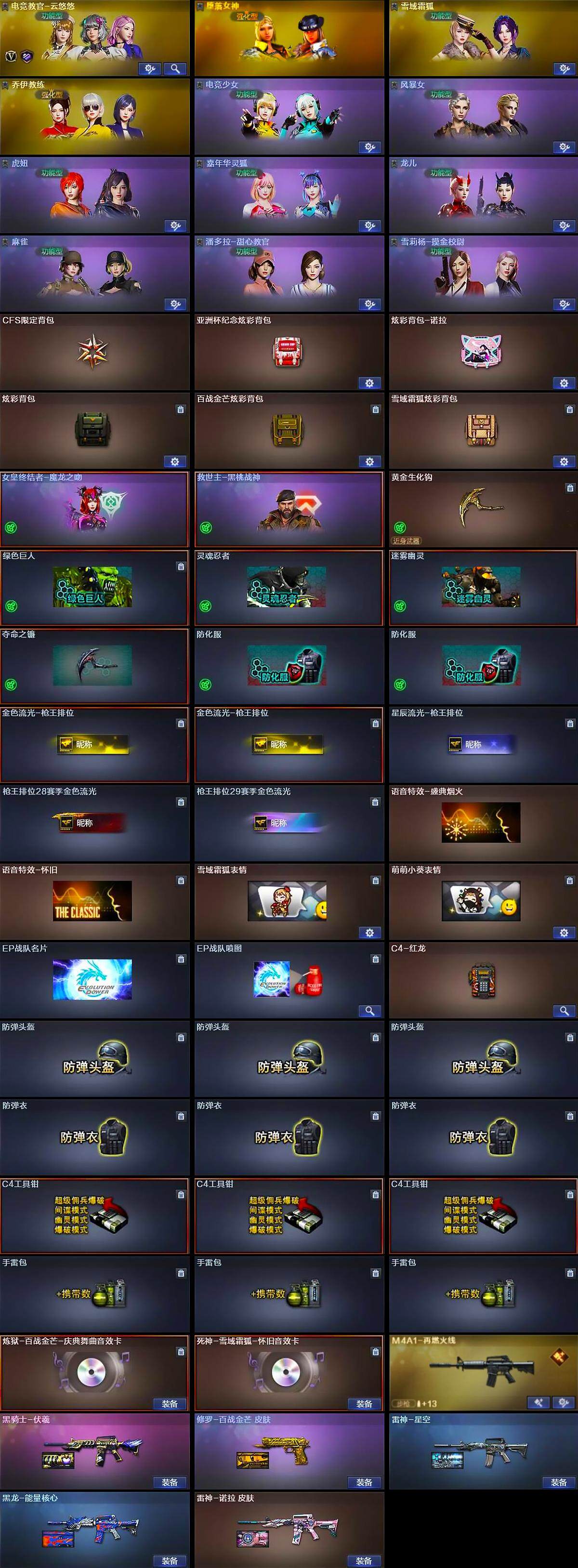【道具】:CFS限定背包,亚洲杯纪念炫彩背包,炫彩背包-诺拉,炫彩背包,百战金芒炫彩背包,雪域霜狐炫彩背包,女皇终结者-魔龙之吻,救世主-黑桃战神,黄金生化钩,绿色巨人,灵魂忍者,迷雾幽灵,夺命之镰,防化服*2,金色流光-枪王排位*2,星辰流光-枪王排位,枪王排位28赛季金色流光,枪王排位29赛季金色流光,语音特效-盛典烟火,语音特效-怀旧,雪域霜狐表情,萌萌小葵表情,EP战队名片,EP战队喷图,C4-红龙,防弹头盔*3,防弹衣*3,C4工具钳*3,手雷包*3