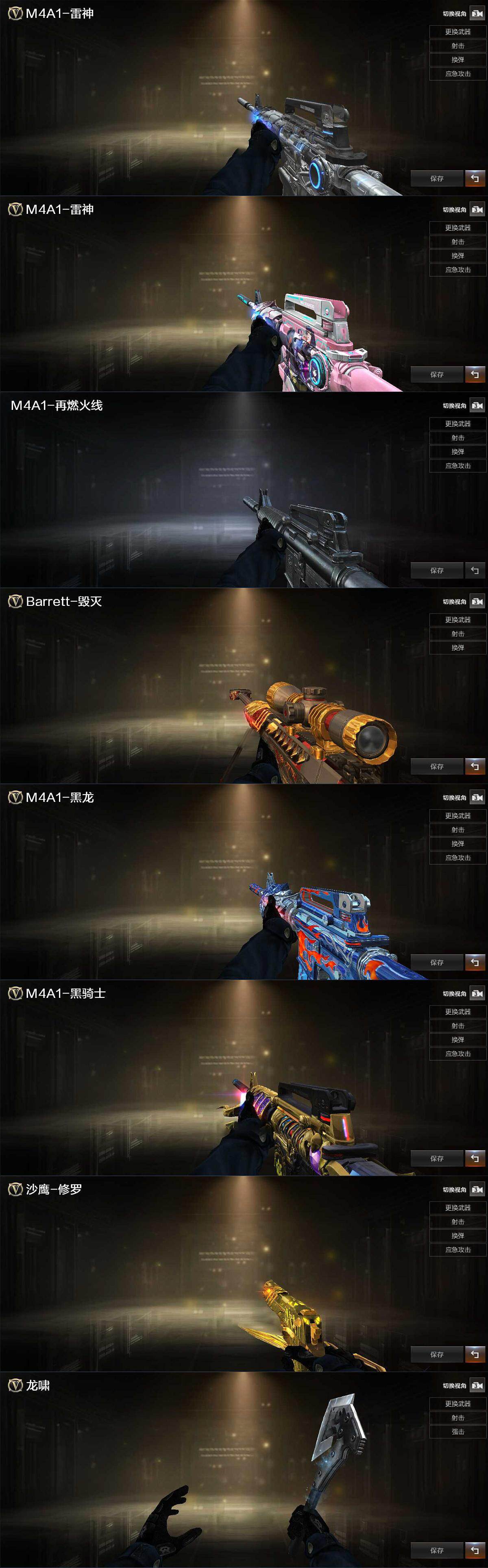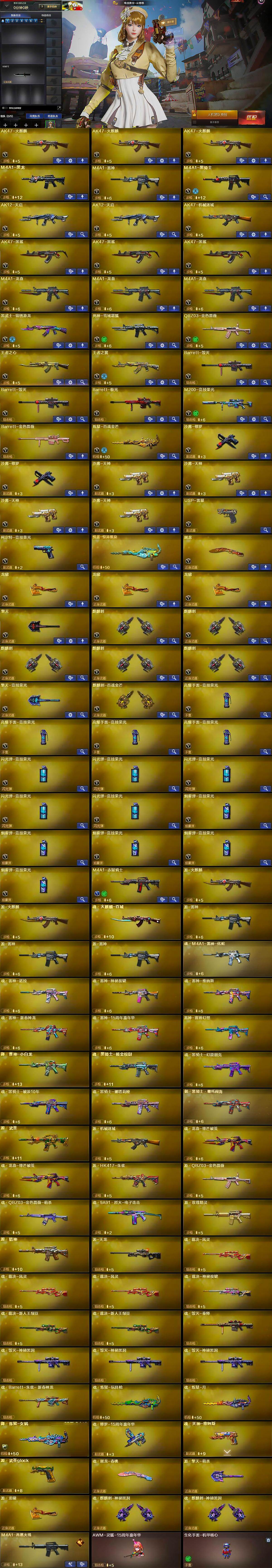 【英雄级武器】:AK47-火麒麟*3,M4A1-黑龙,M4A1-雷神,M4A1-黑骑士,AK12-天启*2,AK47-机械迷城,AK47-黑鲨*3,M4A1-龙血*3,黑武士-锦绣游龙,死神-雪域霜狐,QBZ03-金色蔷薇,王者之心-觉醒版,王者之翼-觉醒版,Barrett-毁灭*2,Barrett-极光,M200-竞技荣光,Barrett-金色蔷薇,炼狱-百战金芒,沙鹰-修罗*2,沙鹰-天神*4,USP-雷暴,柯尔特-竞技荣光,屠龙,龙啸*3,擎天,麒麟刺*5,擎天-竞技荣光,麒麟刺-百战金芒,高爆手雷-竞技荣光*4,闪光弹-竞技荣光*5,烟雾弹-竞技荣光*5,M4A1-赤狱骑士