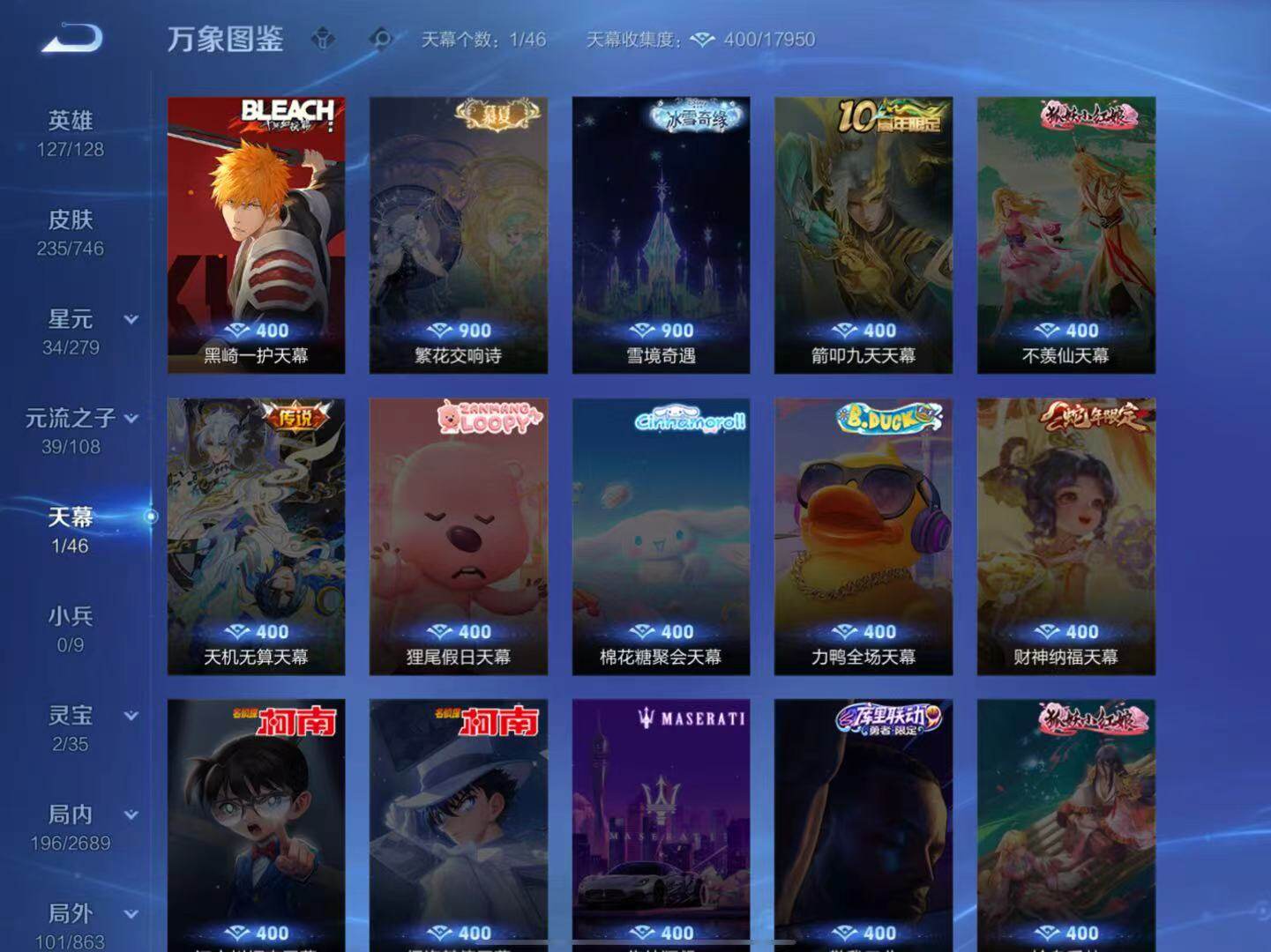 - [12151815]AK289-V9-414皮肤-4典藏-0无双-0珍品传说-24传说-138史诗 【荣耀典藏】:武则天英雄,孙悟空全息碎影,夏侯惇无限飓风号,芈月大秦宣太后 【传说皮肤】:桑启鸣野蒿,吕布曦玄引,吕布遇见神鼓,东皇太一灼幽烈阳,李信山海炽霜斩,狄仁杰神器狴犴令,娜可露露前尘镜,孙策末日机甲,裴擒虎寅虎赤拳,鲁班七号寅虎瑞焰,孙尚香异界灵契,兰陵王默契交锋,虞姬启明星使,孙悟空零号赤焰,曜云鹰飞将,李信一念神魔,刘备时之恋人,伽罗太华,花木兰冠军飞将,诸葛亮武陵仙君,貂蝉仲夏夜之梦,孙悟空地狱火,吕布天魔缭乱,狄仁杰超时空战士 【限定皮肤】:白起狰,蔡文姬夏日便利店,虞姬夏日便利店,姜子牙天穹之誓,杨戬破阵退雄兵,狄仁杰阴阳师,廉颇寅虎御盾,赵云皇家上将,赵云百木心枪,墨子神迹守卫,嬴政优雅恋人,嬴政白昼王子,孙尚香蔷薇恋人,孙尚香异界灵契,鲁班七号狮舞东方,鲁班七号乒乒小将,鲁班七号寅虎瑞焰,庄周高山流水,高渐离死亡摇滚,阿轲迷踪丽影,钟无艳超时空战士,孙膑寅虎展翼,扁鹊奇幻香踪,白起夜都怪侠,芈月重明,芈月白晶晶,芈月幻夜卜梦,吕布天魔缭乱,吕布猎兽之王,吕布御风骁将,吕布遇见神鼓,周瑜赤莲之焰,元歌云间偶戏,元歌无心,夏侯惇朔风刀,夏侯惇匿光决锋者,甄姬女儿国国王,甄姬游园惊梦,甄姬落雪兰心,曹操烛龙,典韦穷奇,典韦蓝屏警告,典韦岱宗,马可波罗暗影游猎,狄仁杰魔术师,狄仁杰万华元夜,狄仁杰神器狴犴令,达摩星际陆战队,达摩沙漠行僧,项羽海滩派对,老夫子醍醐杖,老夫子航海奇遇记,程咬金演武夺筹,露娜一生所爱,刘邦夺宝奇兵,韩信傲雪梅枪,王昭君午后时光,兰陵王默契交锋,兰陵王驯魔猎人,兰陵王金庭之子,花木兰青春决赛季,花木兰瑞麟志,花木兰默契交锋,娜可露露前尘镜,亚瑟潮玩骑士王,孙悟空大圣娶亲,孙悟空零号赤焰,孙悟空孙行者,牛魔御旌,牛魔奔雷神使,后羿圣弓游侠,李元芳银河之约,李元芳云中旅人,虞姬启明星使,钟馗神迹守卫,钟馗驱傩正仪,杨玉环遇见飞天,杨玉环寅虎心曲,杨戬潮玩骑兵,女娲朔望之晖,干将莫邪真爱魔法,雅典娜单词大作战,雅典娜黎明之约,蔡文姬繁星吟游,太乙真人饕餮,太乙真人华丽摇滚,东皇太一逐梦之光,鬼谷子原初探秘者,鬼谷子五谷丰年,诸葛亮武陵仙君,黄忠烈魂,黄忠火炮绅士,铠青龙志,苏烈千军破阵,百里玄策原初追逐者,弈星混沌棋,梦奇顽趣,沈梦溪星空之诺,沈梦溪