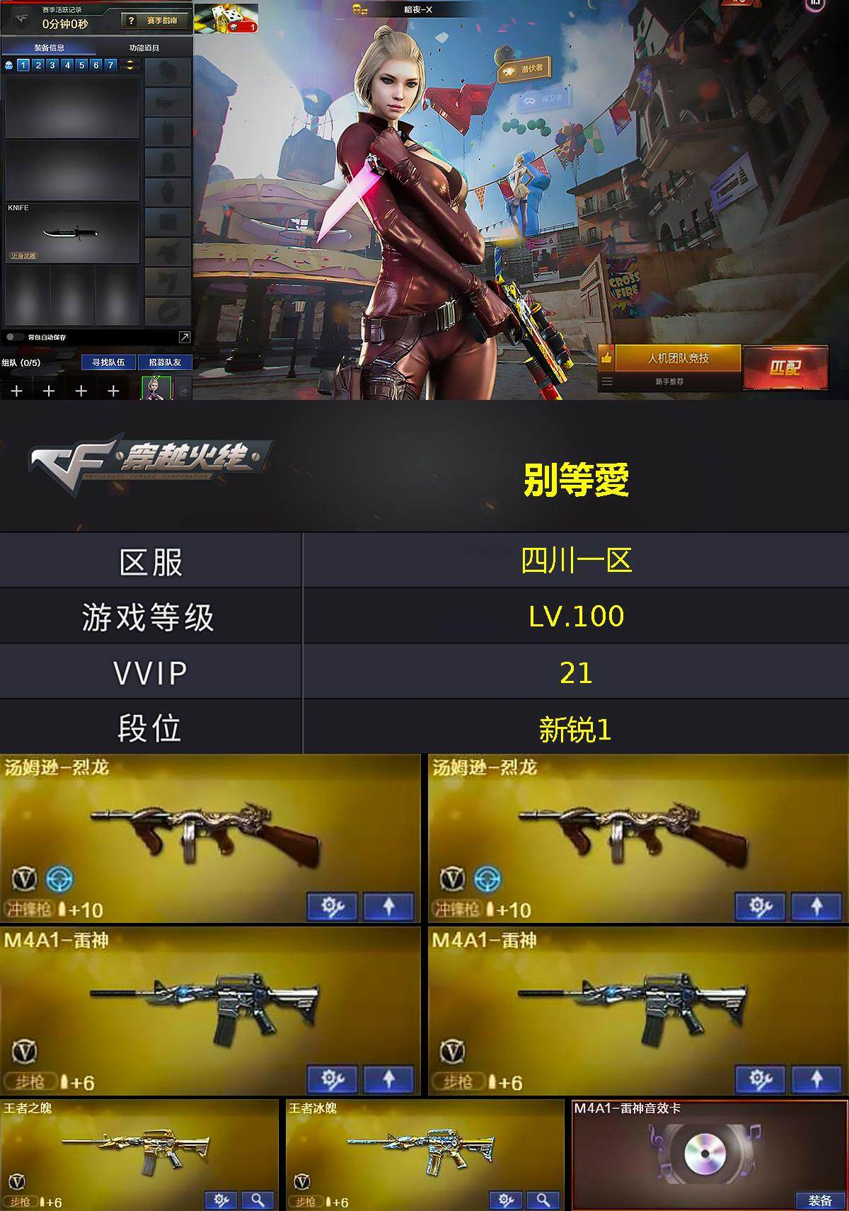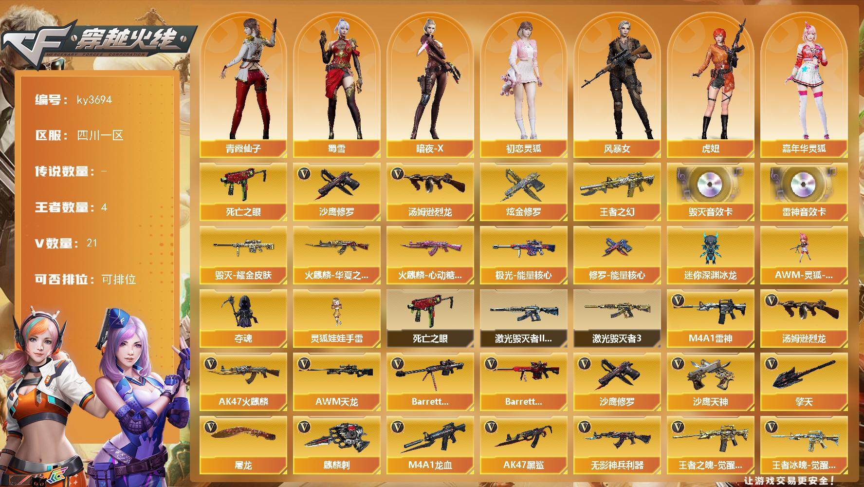 [13949407]四川一区-21V-4王者-1炫金 【热门武器】:死亡之眼,汤姆逊-烈龙*2,沙鹰-修罗 【王者炫金武器】:王者之幻,炫金修罗 【音效卡】:M4A1-雷神音效卡,Barrett-毁灭音效卡 【皮肤】:火麒麟-华夏之心,火麒麟-心动糖果,毁灭耀金皮肤,极光-能量核心,修罗-能量核心 【角色】:暗夜-X,初恋灵狐,风暴女,虎妞,嘉年华灵狐,娟娟,灵狐者-X,龙儿,麻雀,潘多拉-X,邱刚敖,青霞仙子,斯沃特-X,蜀雪,新娜塔莎,影武者-X 【人偶武器】:AWM-灵狐-15周年嘉年华,迷你深渊冰龙,夺魂,灵狐娃娃手雷 【暴走生化】:死亡之眼 【挑战大师】:激光毁灭者III-白马银枪,激光毁灭者III 【英雄级武器】:AK47-火麒麟,M4A1-雷神*2,AK47-黑鲨*2,M4A1-龙血,无影-神兵利器,王者之魄-觉醒版,王者冰魄-觉醒版,AWM-天龙*3,Barrett-毁灭,Barrett-极光,汤姆逊-烈龙*2,沙鹰-修罗,沙鹰-天神,屠龙*3,擎天,麒麟刺,王者之啸-觉醒版 【道具】:虎牙炫彩背包,妩媚妖姬,绿色巨人,灵魂忍者,变异宝贝,迷雾幽灵,夺命之镰,防化服*2,金色流光-枪王排位*2,防弹头盔*4,防弹衣*4,C4工具钳*5,手雷包*4 【特殊枪械】:2烈龙