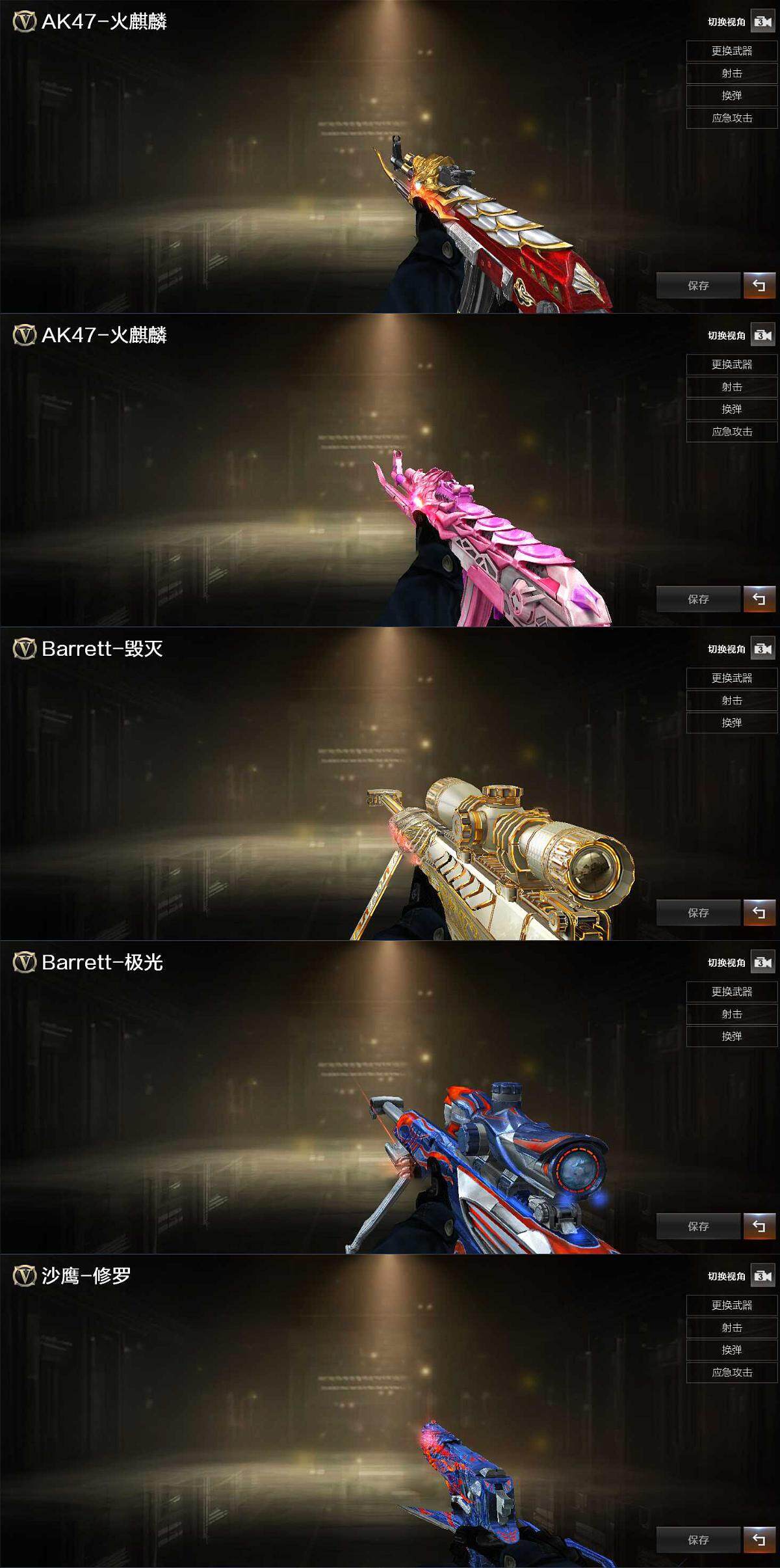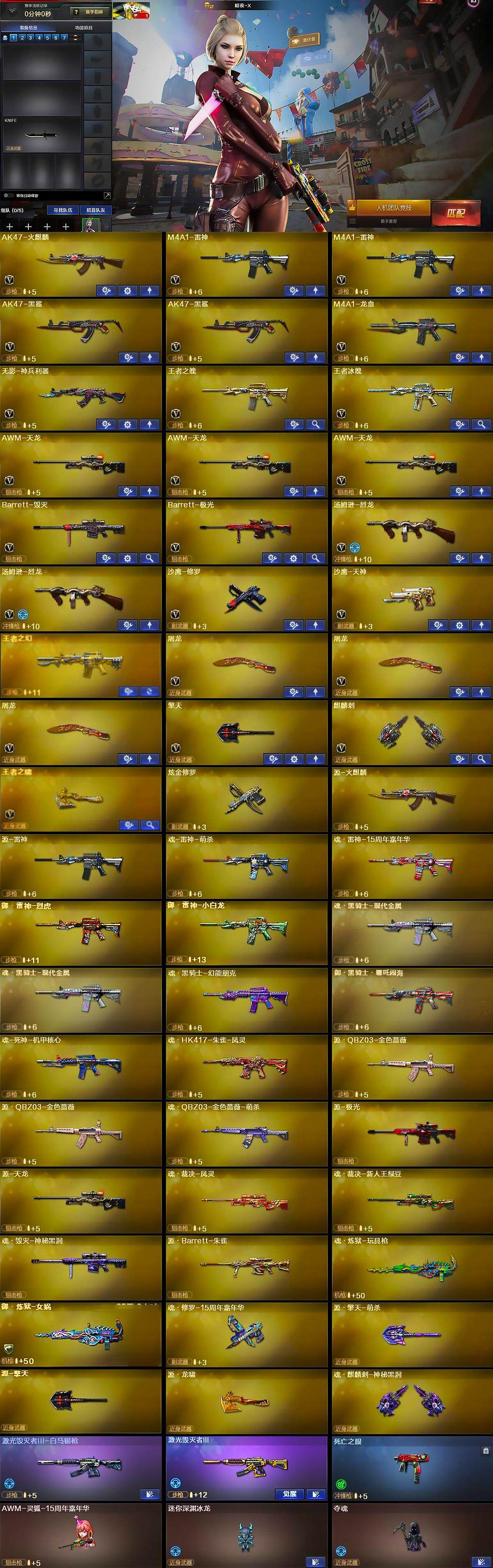 【英雄级武器】:AK47-火麒麟,M4A1-雷神*2,AK47-黑鲨*2,M4A1-龙血,无影-神兵利器,王者之魄-觉醒版,王者冰魄-觉醒版,AWM-天龙*3,Barrett-毁灭,Barrett-极光,汤姆逊-烈龙*2,沙鹰-修罗,沙鹰-天神,屠龙*3,擎天,麒麟刺,王者之啸-觉醒版