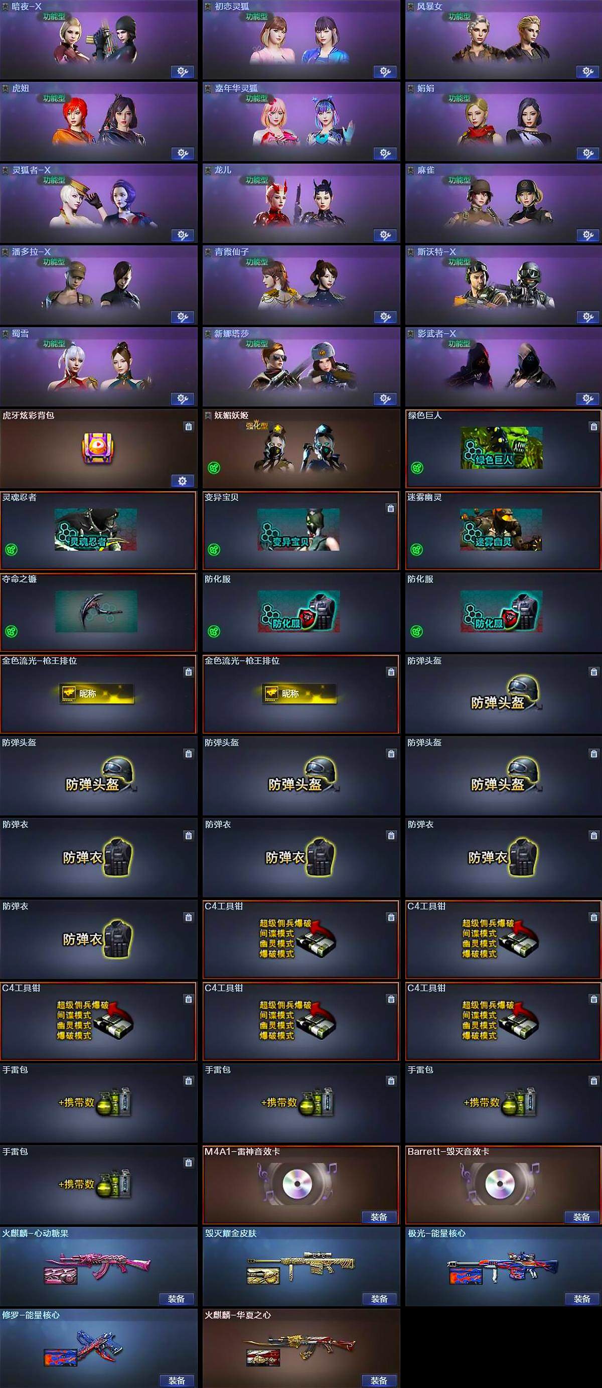 【道具】:虎牙炫彩背包,妩媚妖姬,绿色巨人,灵魂忍者,变异宝贝,迷雾幽灵,夺命之镰,防化服*2,金色流光-枪王排位*2,防弹头盔*4,防弹衣*4,C4工具钳*5,手雷包*4
