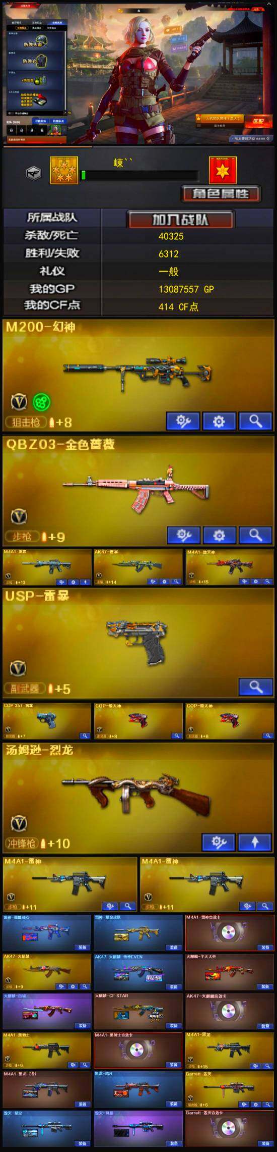 【热门武器】:QBZ03-金色蔷薇,M200-幻神,M4A1-黑骑士,汤姆逊-烈龙,USP-雷暴,COP-堕天神*2,沙鹰-修罗