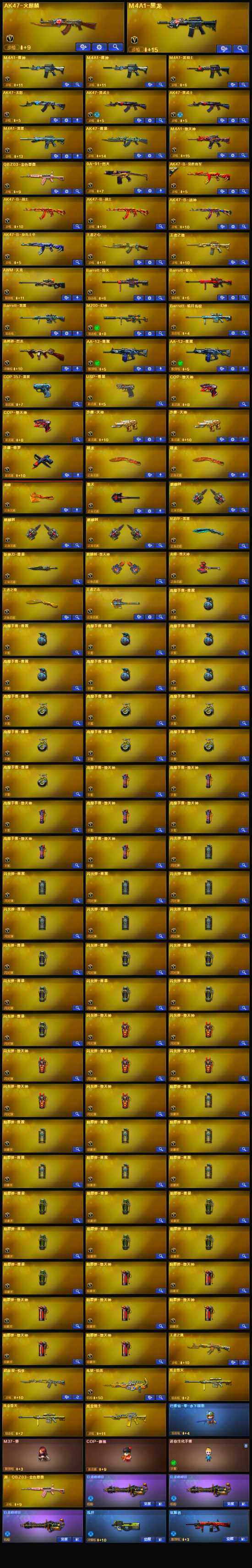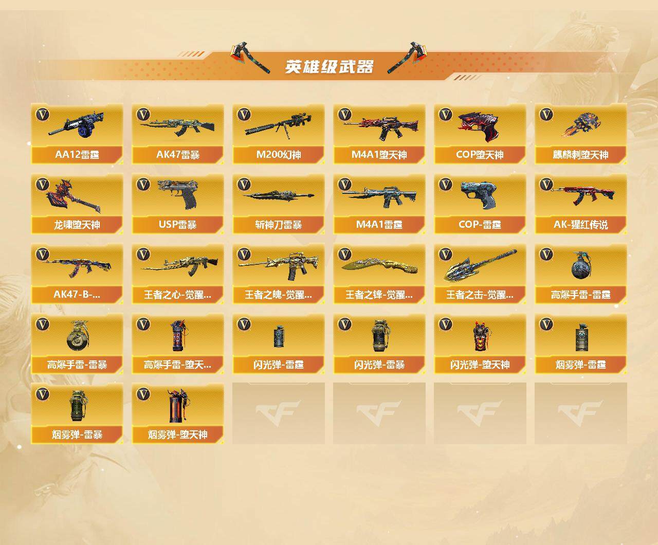 【英雄级武器】:AK47-火麒麟,M4A1-黑龙,M4A1-雷神*2,M4A1-黑骑士,AK47-无影,AK47-黑武士*2,M4A1-雷霆,AK47-雷暴,M4A1-堕天神,QBZ03-金色蔷薇,王者之心-觉醒版,王者之魄-觉醒版,AK-47-猩红传说*8,AK47-B-战神,AK47-B-常胜将军,AWM-天龙,Barrett-毁灭,Barrett-极光,M200-幻神,汤姆逊-烈龙,AA-12-雷霆*2,沙鹰-修罗,沙鹰-天神*2,USP-雷暴,雷霆之契,COP-堕天神*2,屠龙*2,龙啸,麒麟刺-堕天神,擎天,麒麟刺*3,龙啸-堕天神,斩神刀-雷暴,王者之锋-觉醒版,王者之击-觉醒版,高爆手雷-雷霆*7,高爆手雷-雷暴*7,高爆手雷-堕天神*7,闪光弹-雷霆*7,闪光弹-雷暴*7,闪光弹-堕天神*7,烟雾弹-雷霆*7,烟雾弹-雷暴*7,烟雾弹-堕天神*7