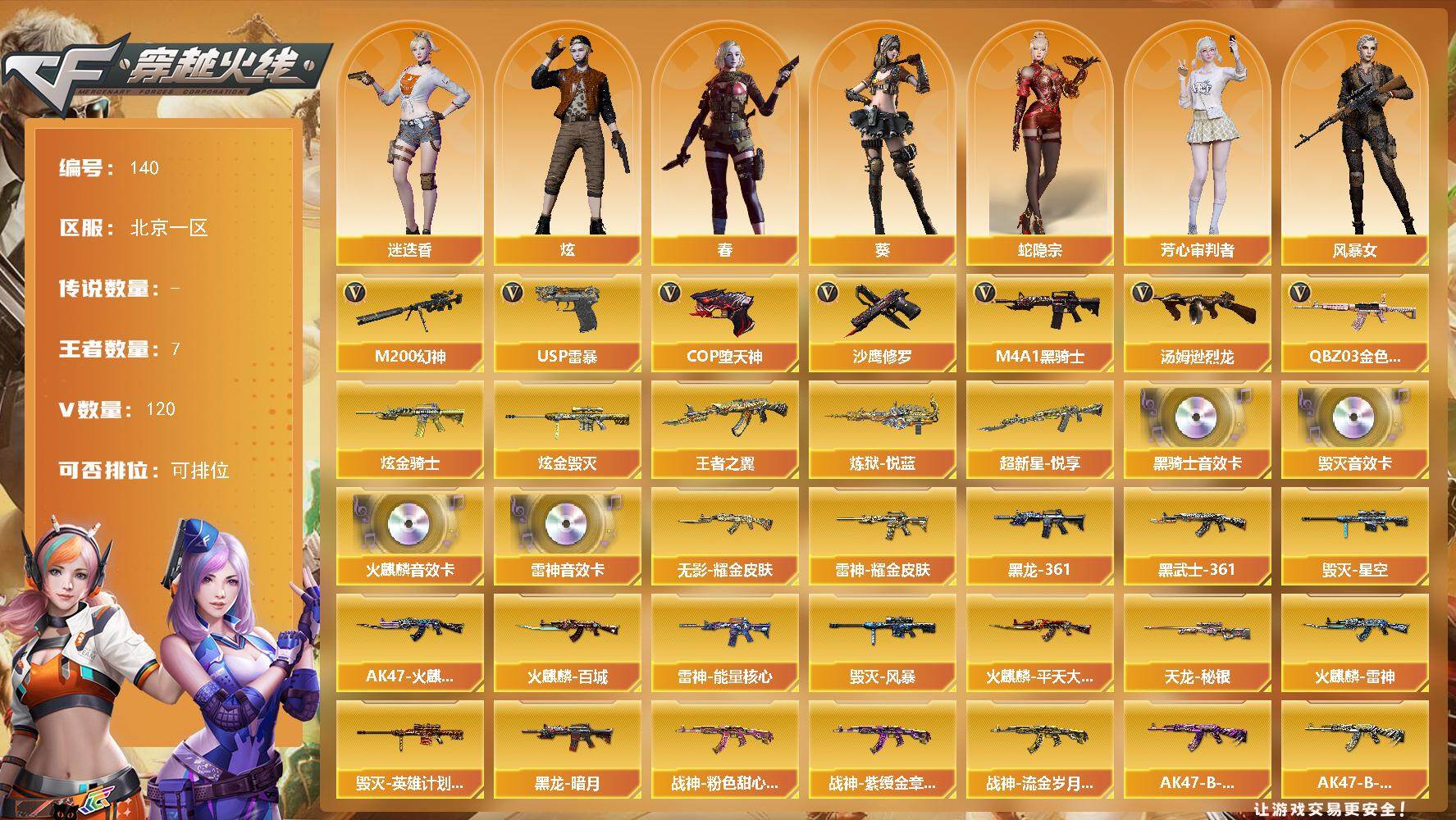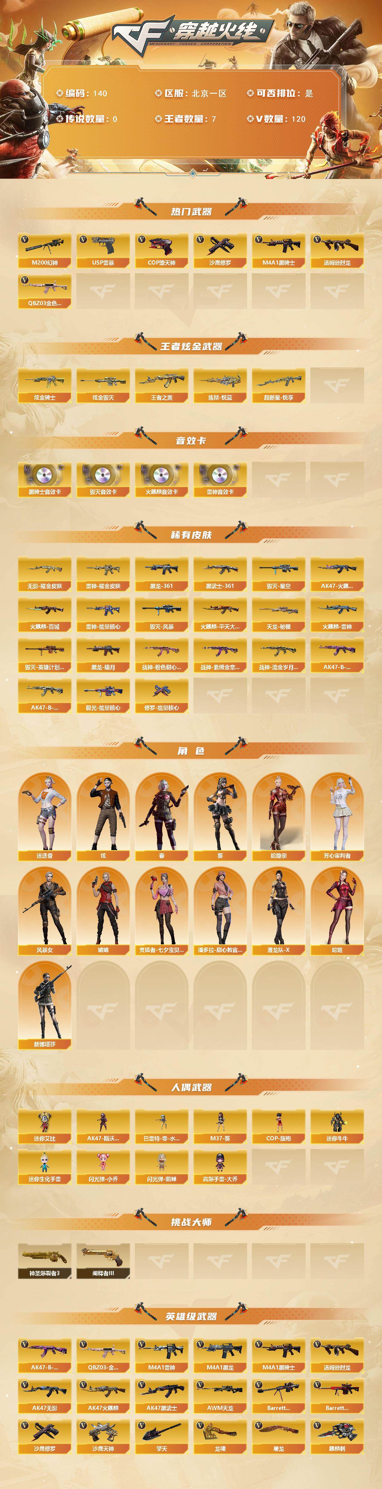 [13949559]北京一区-120V-7王者-3炫金 【热门武器】:QBZ03-金色蔷薇,M200-幻神,M4A1-黑骑士,汤姆逊-烈龙,USP-雷暴,COP-堕天神*2,沙鹰-修罗 【王者炫金武器】:超新星-悦享,王者之翼,炼狱-悦蓝,炫金骑士,炫金毁灭*2 【音效卡】:AK47-火麒麟音效卡,M4A1-雷神音效卡,M4A1-黑骑士音效卡,Barrett-毁灭音效卡 【皮肤】:雷神-能量核心,雷神-耀金皮肤,火麒麟-雷神,AK47-火麒麟-传奇EVEN,火麒麟-平天大圣,火麒麟-百城,毁灭-星空,毁灭-风暴,毁灭-英雄计划 皮肤,黑龙-暗月,M4A1-黑龙-361,无影耀金皮肤,AK47-黑武士-361,战神-粉色甜心皮肤,战神-紫绶金章皮肤*3,战神-流金岁月皮肤,AK47-B-常胜将军-曹操*2,AK47-B-常胜将军-刘备*2,天龙-秘银,极光-能量核心,修罗-能量核心*2 【角色】:葵,炫,春,迷迭香,蛇隐宗,芳心审判者,风暴女*2,娟娟,灵狐者-七夕宝贝,潘多拉-甜心教官,潜龙队-X,蛇姬,新娜塔莎 【人偶武器】:巴雷特-零-水下丽影,M37-葵,COP-旗袍,迷你牛牛,迷你生化手雷,闪光弹-小乔,闪光弹-貂蝉,高爆手雷-大乔,AK47-斯沃特,迷你艾比 【挑战大师】:神圣爆裂者III,阐释者III 【英雄级武器】:AK47-火麒麟,M4A1-黑龙,M4A1-雷神*2,M4A1-黑骑士,AK47-无影,AK47-黑武士*2,M4A1-雷霆,AK47-雷暴,M4A1-堕天神,QBZ03-金色蔷薇,王者之心-觉醒版,王者之魄-觉醒版,AK-47-猩红传说*8,AK47-B-战神,AK47-B-常胜将军,AWM-天龙,Barrett-毁灭,Barrett-极光,M200-幻神,汤姆逊-烈龙,AA-12-雷霆*2,沙鹰-修罗,沙鹰-天神*2,USP-雷暴,雷霆之契,COP-堕天神*2,屠龙*2,龙啸,麒麟刺-堕天神,擎天,麒麟刺*3,龙啸-堕天神,斩神刀-雷暴,王者之锋-觉醒版,王者之击-觉醒版,高爆手雷-雷霆*7,高爆手雷-雷暴*7,高爆手雷-堕天神*7,闪光弹-雷霆*7,闪光弹-雷暴*7,闪光弹-堕天神*7,烟雾弹-雷霆*7,烟雾弹-雷暴*7,烟雾弹-堕天神*7 【道具】:云山科技背包,亚洲杯纪念炫彩背包,冰冰企鹅背包-猛男专用,炫彩背包,超级背包,救世主-黑桃战神,黄金生