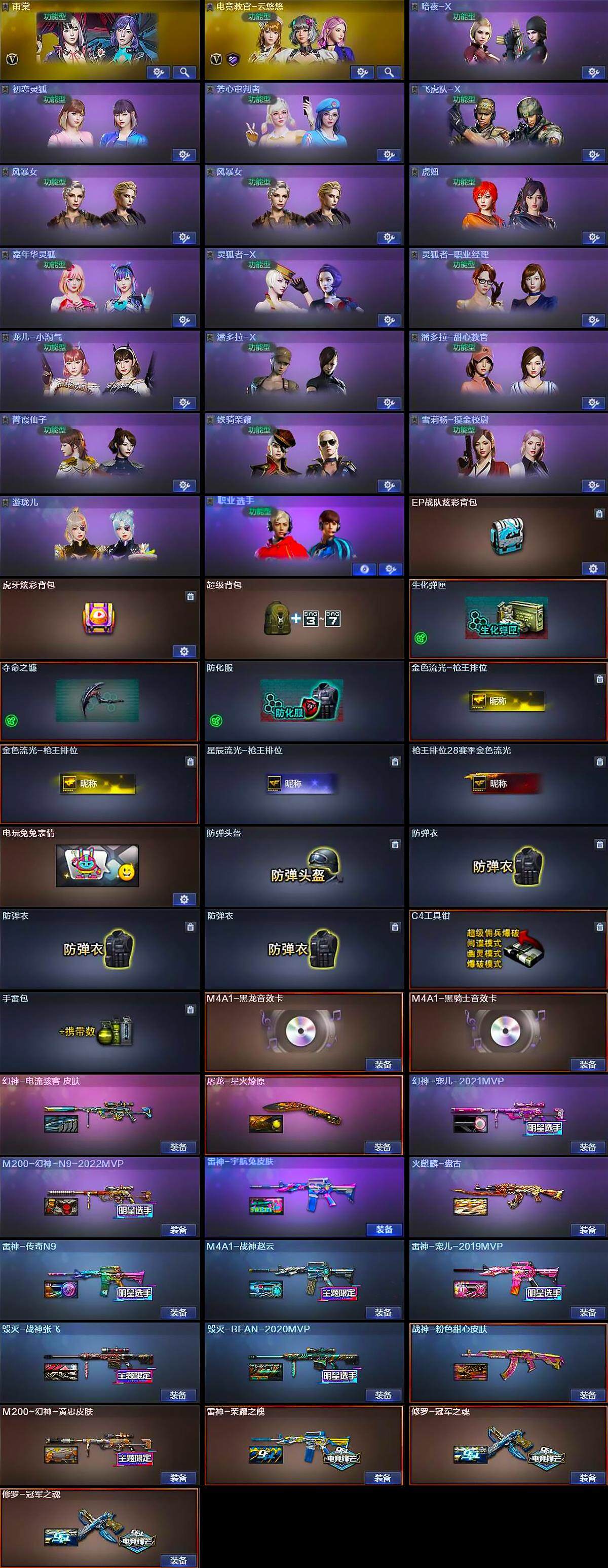 【道具】:EP战队炫彩背包,虎牙炫彩背包,超级背包,生化弹匣,夺命之镰,防化服,金色流光-枪王排位*2,星辰流光-枪王排位,枪王排位28赛季金色流光,电玩兔兔表情,防弹头盔,防弹衣*3,C4工具钳,手雷包